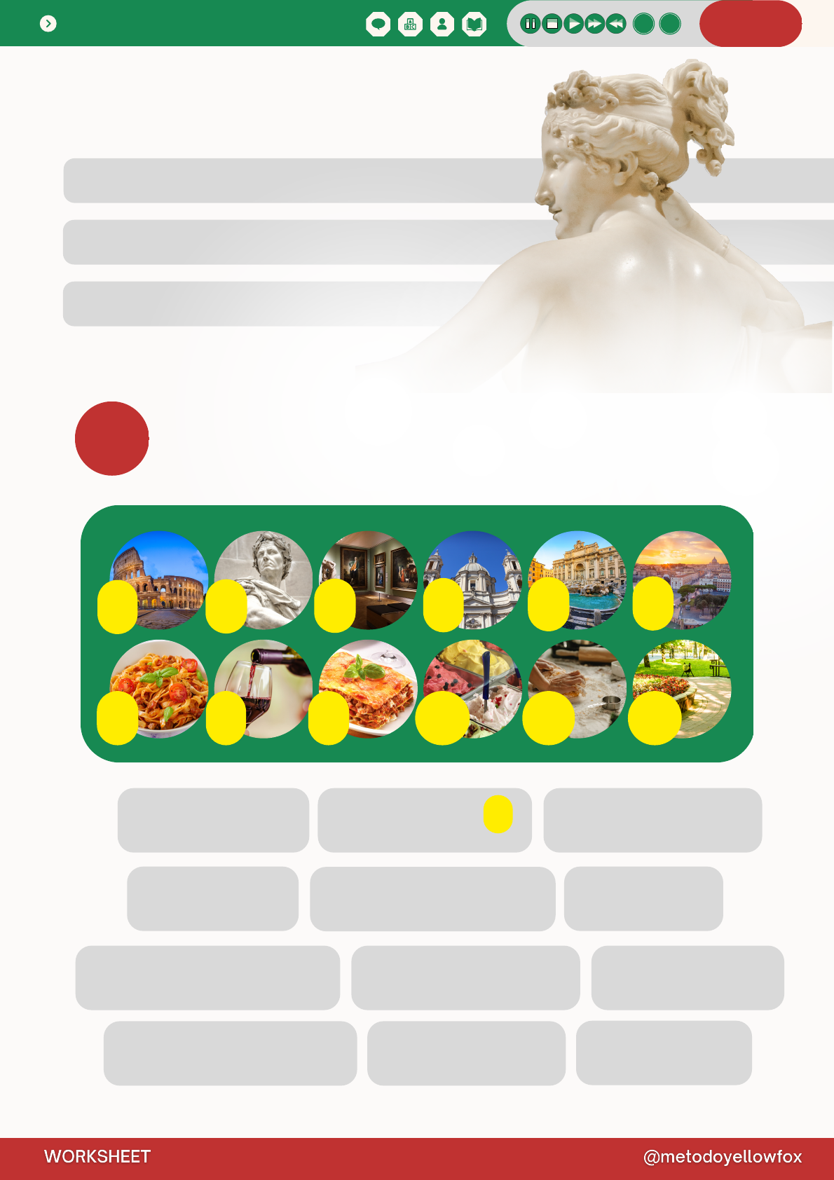 A1 L3Countries & Nationalities lesson 3 Student's name: MY TRIP TO ROME: Worksheet Match the words to the correct images: A1 LC conversation 1 1 2 3 4 5 6 7 8 9 10 11 12 square __ museum__ fountain __ pasta __ wine __ homemade __ ice cream __ church __ lasagna __ landscape __ 3 My trip to Rome colosseum __ statue __ Método Yellow Fox. All rights reserved. A1 L3Countries & Nationalities lesson 3A1 LC conversation 2 Find the words below: Museum / Pasta / Colosseum / Lasagna / Wine Homemade / Fountain / Landscape Método Yellow Fox. All rights reserved. Método Yellow Fox. All rights reserved. My trip to Rome A1 L3Countries & Nationalities lesson 3 Click on the button or scan the QR code and listen to the audio. Complete the spaces below. LISTENING PRACTICE BIANCA'S TRIP TO ROME One of my favorite things about _____ is the ______! There's a perfect restaurant in Rome and I always go there. They ______ delicious dishes and their main course is _______! It is the best pasta in _______! They also serve _______ ______. It is next to a ________ with beautiful ________. If you go to Rome, you have to go to this _________ and to this __________. A1 LC conversation 3 Método Yellow Fox. All rights reserved. My trip to Rome https://drive.google.com/file/d/1Zbqrb3ePntGaptatReZqAbXk-rnOdeLq/view?usp=sharing A1 L3Countries & Nationalities lesson 3A1 LC conversation ANSWER KEY One of my favorite things about Rome is the food! There's a perfect restaurant in Rome and I always go there. They serve delicious dishes and their main course is pasta! It is the best pasta in Italy! They also serve delicious desserts. It is next to a museum with beautiful statues. If you go to Rome, you have to go to this restaurant and to this museum. 3 2 Método Yellow Fox. All rights reserved. My trip to Rome