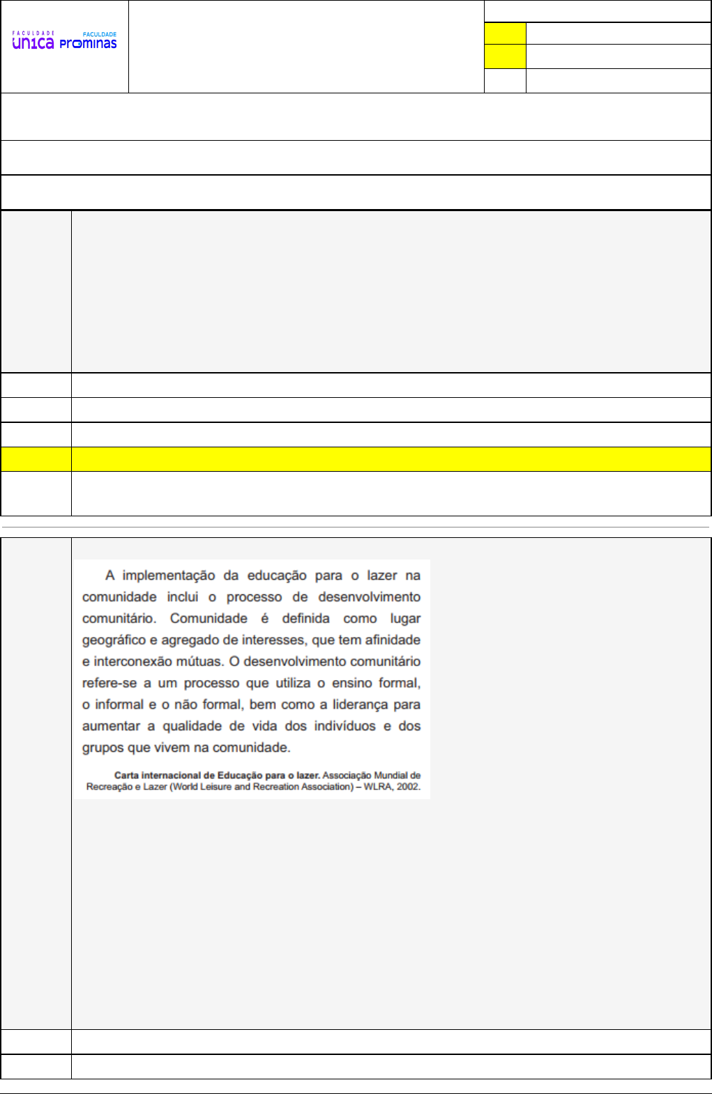 Pincel Atômico - 25/06/2024 18:49:41 1/3 JACIEL JOSÉ DA SILVA Exercício Caminho do Conhecimento - Etapa 8 (25330) Atividade finalizada em 25/06/2024 18:49:22 (2249040 / 1) LEGENDA Resposta correta na questão # Resposta correta - Questão Anulada X Resposta selecionada pelo Aluno Disciplina: FUNDAMENTOS HISTÓRICOS DA EDUCAÇÃO FÍSICA E ESPORTE [1139475] - Avaliação com 8 questões, com o peso total de 1,67 pontos [capítulos - 4] Turma: Segunda Graduação: Segunda Graduação 6 meses - Licenciatura em Educação Física - Grupo: FPD-JUN/2024 - SGegu0A070624 [127315] Aluno(a): 91623805 - JACIEL JOSÉ DA SILVA - Respondeu 8 questões corretas, obtendo um total de 1,67 pontos como nota [360983_1745 64] Questão 001 Sobre as barreiras do lazer, avalie as asserções a seguir e a relação proposta entre elas. As condições socioeconômicas podem ser consideradas uma barreira para prática do lazer. PORQUE A ausência de recursos financeiros pode limitar as escolhas dos indivíduos no seu tempo de lazer. A respeito dessas asserções, assinale a opção correta. As asserções I e II são proposições falsas. A asserção I é uma proposição falsa, e a II é uma proposição verdadeira. A asserção I é uma proposição verdadeira, e a II é uma proposição falsa. X As asserções I e II são proposições verdadeiras, e a II é uma justificativa correta da I. As asserções I e II são proposições verdadeiras, mas a II não é uma justificativa correta da I. [360983_1745 71] Questão 002 (INEP - 2010 - ENADE - Educação Física) A partir dessa citação, analise as afirmações que se seguem. I. Projetos de lazer devem trabalhar com grupos comunitários existentes, para minimizarem as barreiras e otimizarem o acesso aos serviços de lazer. II. Liderança e orientação permanentes do profissional de educação física são necessárias para que grupos comunitários se capacitem para propor formas que atendam aos seus interesses de lazer. III. As políticas de lazer comunitárias devem estimular a abrangência, respeitando a existência de grupos multiculturais, raciais, sexuais, etários e de habilidades na sociedade. Em relação à educação para o lazer na comunidade e à participação do profissional de educação física nesse processo, é correto o que se afirma em I e II, apenas. III, apenas. Pincel Atômico - 25/06/2024 18:49:41 2/3 II e III, apenas. I e III, apenas. X I, II e III. [360984_1727 96] Questão 003 Enumere a 2º coluna de acordo com a 1º e depois marque a resposta correta. ( A ) Permuta ( B ) Doação ( C ) Editais privados ( D ) face – to face ( C ) Fundos internacionais ( ) Instituições internacionais que possibilitam o financiamento do terceiro setor através de editais ou doações diretas. ( ) Grupo de pessoas que vão as ruas buscar recursos. ( ) São trocas que visam interesse recíproco e não utiliza dinheiro. ( ) Não se faz grande divulgação do nome do doador. ( ) Públicos abertos por pessoas jurídicas que selecionam ONGS para receberem um recurso ou premiação prevista. E, B, D, C, A. E, D, B, C, A. C, B, A, D, E. X E, D, A, B, C. E, C, D, B, A. [360983_1727 94] Questão 004 Marque a alternativa que representa verdadeiramente a afirmação a seguir. “Patrocinador que ajuda sem pedir nada em troca” Permuta. Patrocínio. Apoio. X Mecenato. Doação. [360984_1727 98] Questão 005 As leis de incentivo fiscal podem ser uma alternativa para conseguir angariar os fundos necessários para a realização de projetos. Relacione a 2º coluna de acordo com a 1º e marque a alternativa correta. ( A ) Lei nº 11.438 ( B ) Lei nº 8.313 ( C ) Lei nº 8.685 ( D ) Lei nº 8.069 ( E ) Lei nº 12.213 ( ) Fundo nacional do idoso. ( ) Lei de incentivo ao esporte. ( ) Lei Rouanet. ( ) Fundos de direitos da Criança e do Adolescente. ( ) Lei do audiovisual. E, A, D, B, C. X E, A, B, D, C. A, E, B, D, C. E, A, B, C, D. A, E, C, B, D. Pincel Atômico - 25/06/2024 18:49:41 3/3 [360983_1745 59] Questão 006 O Financiamento coletivo pontual é são caracterizadas por captar valores de uma grande variedade de doares de uma só vez. Geralmente, essas campanhas são realizadas pela internet, que já possui sites especializados, durante um período determinado. No Brasil esse tipo de financiamento também é conhecido por qual nome? Incentivo coletivo. Doação. Rifa. Escambo. X Vaquinha. [360983_1745 51] Questão 007 A Lei de Incentivo ao Esporte (LIE) é uma lei que estabelece a possibilidade de pessoas e empresas investir parte do que pagariam no Imposto em projetos esportivos aprovados pelo governo. Leia os tópicos abaixo sobre a LIE: I. Pessoa física pode submeter um projeto na plataforma e receber os recursos para executá-lo. II. As empresas, através da LIE, podem investir até 1% do Imposto de renda em projetos esportivos. III.O esporte contemplado pela Lei Pelé é de rendimento, que busca inclusão e socialização entre participantes. É correto apenas o que se afirma em: X II. III. I e III. I e II. I, II e III. [360984_1727 99] Questão 008 “Programa Nacional de Apoio à Atenção Oncológica (PRONON) e o Programa Nacional de Apoio à Atenção da Saúde da Pessoa com Deficiência (PRONAS/PCD)” A afirmativa acima refere-se a qual lei? Marque a alternativa correta. Lei nº 12.213. X Lei nº 12.715. Lei nº 8.813. Lei nº 11.438. Lei nº 8.685.