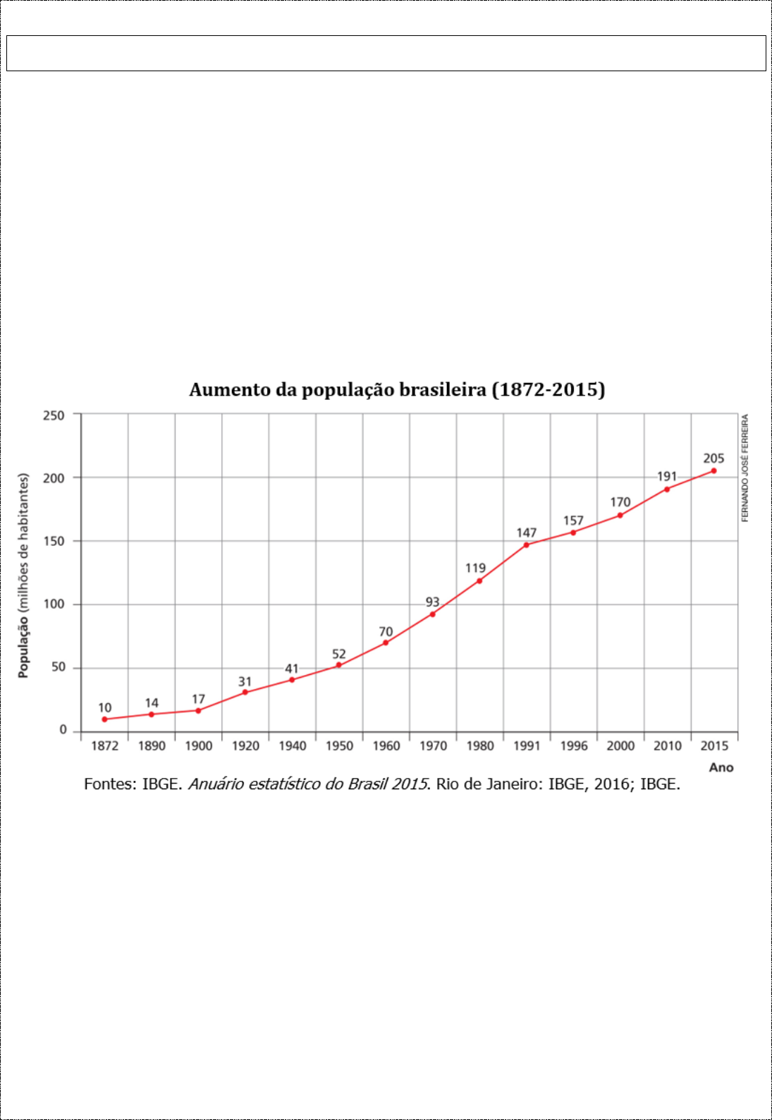 Suporte Geográfico 1 NOME: Nº: DATA: NOTA: 1. Marque com um X a alternativa que indica dois motivos que levaram ao aumento da população urbana no Brasil. a) O desenvolvimento das indústrias nas cidades e a mecanização da agricultura. b) O crescimento do comércio nas cidades e o aumento da pecuária. c) A modernização do campo e a diminuição das cidades. d) O desenvolvimento da agricultura e o fim das indústrias nas cidades. 2. Observe o gráfico e depois responda. a) Quantos milhões de habitantes havia no Brasil em 1872? ____________________________________________________________________________ b) Quantos milhões de habitantes havia no Brasil em 2015? ____________________________________________________________________________ c) Você acha que a população aumentou muito entre 1872 e 2015? Justifique. ____________________________________________________________________________ Suporte Geográfico 2 3. Elabore um pequeno texto que descreva a formação da população brasileira. ________________________________________________________________________________________ ________________________________________________________________________________________ ________________________________________________________________________________________ ________________________________________________________________________________________ ________________________________________________________________________________________ 4. Observe o mapa e marque com um X a alternativa correta. Brasil: densidade demográfica (2010) Fonte: IBGE. Sinopse do censo demográfico 2010. Rio de Janeiro: IBGE, 2011. a) A densidade demográfica é maior na Região Norte do que nas outras regiões. b) A densidade demográfica na área litorânea é maior do que em outras áreas. c) A densidade demográfica indica o total de habitantes de um país. d) A densidade demográfica na Região Centro-Oeste é maior do que na Região Sul. Suporte Geográfico 3 NOME: Nº: DATA: NOTA: 1. Marque com um X a alternativa que indica dois motivos que levaram ao aumento da população urbana no Brasil. a) O desenvolvimento das indústrias nas cidades e a mecanização da agricultura. b) O crescimento do comércio nas cidades e o aumento da pecuária. c) A modernização do campo e a diminuição das cidades. d) O desenvolvimento da agricultura e o fim das indústrias nas cidades. 2. Observe o gráfico e depois responda. a) Quantos milhões de habitantes havia no Brasil em 1872? Em 1872, havia 10 milhões de habitantes no Brasil. b) Quantos milhões de habitantes havia no Brasil em 2015? Em 2015, havia 207 milhões de habitantes no Brasil. c) Você acha que a população aumentou muito entre 1872 e 2015? Justifique. Verifique a pertinência da justificativa sobre o aumento da população brasileira. Suporte Geográfico 4 3. Elabore um pequeno texto que descreva a formação da população brasileira. Verifique a pertinência da resposta dos alunos. Nesta atividade, espera-se que os alunos reconheçam que a população brasileira é formada pela mistura de povos e apresenta grande diversidade cultural. 4. Observe o mapa e marque com um X a alternativa correta. Brasil: densidade demográfica (2010) Fonte: IBGE. Sinopse do censo demográfico 2010. Rio de Janeiro: IBGE, 2011. a) A densidade demográfica é maior na Região Norte do que nas outras regiões. b) A densidade demográfica na área litorânea é maior do que em outras áreas. c) A densidade demográfica indica o total de habitantes de um país. d) A densidade demográfica na Região Centro-Oeste é maior do que na Região Sul.