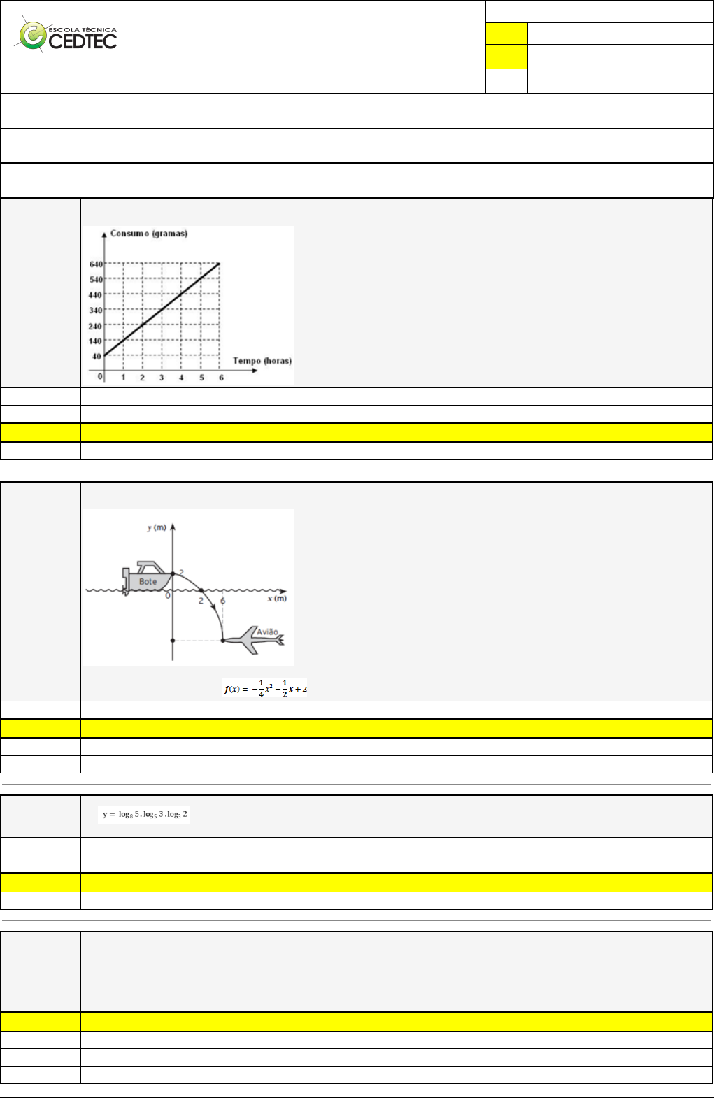 Pincel Atômico - 25/06/2024 22:22:03 1/2 VANDERLEI FERREIRA FREIRE Exercício Caminho do Conhecimento - Etapa 39 (15383) Atividade finalizada em 17/06/2024 21:58:07 (2125675 / 1) LEGENDA Resposta correta na questão # Resposta correta - Questão Anulada X Resposta selecionada pelo Aluno Disciplina: MATEMÁTICA [1058761] - Avaliação com 4 questões, com o peso total de 6,50 pontos [capítulos - 106] Turma: Curso Técnico: Mecânica - Grupo: EAD - 03/24 - EAD MEC [116680] Aluno(a): 91584633 - VANDERLEI FERREIRA FREIRE - Respondeu 4 questões corretas, obtendo um total de 6,50 pontos como nota [350073_29811] Questão 001 Analise o gráfico a seguir que mostra o consumo de gás de lampeão em 6 horas de uso, em um dia. Marque a afirmativa correta de acordo com o gráfico apresentado. O tempo é uma cariável que depende do consumo de gás. Após 4h e 30 min, foram consumidos 480 gramas de gás. X O lampeão consome 100g de gás por hora e antes do uso, no dia, já haviam sido perdidos 40g de gás. Afunção que representa o consumo de gás é C = 100.T - 40 [350072_29810] Questão 002 Um mergulhador quer resgatar a caixa preta de um avião que caiu em um rio. Como havia pouco de correnteza, a trajetória descrita pelo mergulhador foi como a figura abaixo. Sabendo-se que a distância, na horizontal, do bote de resgate ao local onde está a caixa é de 6m e que a trajetória do mergulhador é descrita pela função dada por , assinale a alternativa que representa a profundidade atingida pelo mergulhador. 9 m X 10 m 11 m 8 m [350073_29817] Questão 003 Se , então o valor de y é: log21 2 X 1/3 3 [350073_29816] Questão 004 Segundo a Organização mundial do Turismo (OMT), o Ecoturismo cresce a uma taxa de 5% ao ano. No Brasil, em 2011, o Ecoturismo foi responsável pela movimentação de 6,775 bilhões de dólares . Supondo que o percentual descrecimento inicia sobre a movimentação do ano anterior, pode-se expressar o valor movimento V (em bilhões de dólares), em função do tempo t (em anos), por V = 6,775.(1,05)t-1 com t=1 corresponde a 2011, t=2, a 2012 e assim por diante. Em que ano o valor movimentado será igual a 13,5 bilhões de dólares? Dados: log 0,3 e log 1,05 = 0,02 X 2026 2016 2025 2020 Pincel Atômico - 25/06/2024 22:22:03 2/2