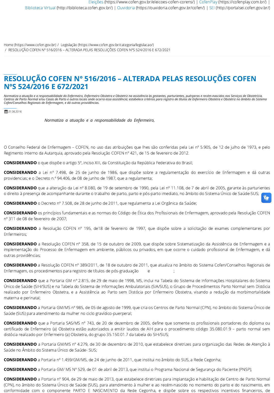 Eleições (https://www.cofen.gov.br/eleicoes-cofen-corens/) | CofenPlay (https://cofenplay.com.br/) | Biblioteca Virtual (http://biblioteca.cofen.gov.br/) | Ouvidoria (https://ouvidoria.cofen.gov.br/cofen/) | SEI (http://portalsei.cofen.gov.br/) Home (https://www.cofen.gov.br) / Legislação (https://www.cofen.gov.br/categoria/legislacao/) / RESOLUÇÃO COFEN Nº 516/2016 – ALTERADA PELAS RESOLUÇÕES COFEN NºS 524/2016 E 672/2021 RESOLUÇÃO COFEN Nº 516/2016 – ALTERADA PELAS RESOLUÇÕES COFEN NºS 524/2016 E 672/2021 Normatiza a atuação e a responsabilidade do Enfermeiro, Enfermeiro Obstetra e Obstetriz na assistência às gestantes, parturientes, puérperas e recém-nascidos nos Serviços de Obstetrícia, Centros de Parto Normal e/ou Casas de Parto e outros locais onde ocorra essa assistência; estabelece critérios para registro de títulos de Enfermeiro Obstetra e Obstetriz no âmbito do Sistema Cofen/Conselhos Regionais de Enfermagem, e dá outras providências. 27.06.2016 Normatiza a atuação e a responsabilidade do Enfermeiro, Enfermeiro Obstetra e Obstetriz na assistência às gestantes, parturientes, puérperas e recém-nascidos nos Serviços de Obstetrícia, Centros de Parto Normal e/ou Casas de Parto e demais locais onde ocorra essa assistência e estabelecer critérios para registro de títulos de Enfermeiro Obstetra e Obstetriz no âmbito do Sistema Cofen/Conselhos Regionais de Enfermagem. O Conselho Federal de Enfermagem – COFEN, no uso das atribuições que lhes são conferidas pela Lei nº 5.905, de 12 de julho de 1973, e pelo Regimento Interno da Autarquia, aprovado pela Resolução COFEN nº 421, de 15 de fevereiro de 2012. CONSIDERANDO o que dispõe o artigo 5º, inciso XIII, da Constituição da República Federativa do Brasil; CONSIDERANDO a Lei nº 7.498, de 25 de junho de 1986, que dispõe sobre a regulamentação do exercício de Enfermagem e dá outras providencias; e o Decreto n.º 94.406, de 08 de junho de 1987, que a regulamenta; CONSIDERANDO que a alteração da Lei nº 8.080, de 19 de setembro de 1990, pela Lei nº 11.108, de 7 de abril de 2005, garante às parturientes o direito à presença de acompanhante durante o trabalho de parto, parto e pós-parto imediato, no âmbito do Sistema Único de Saúde-SUS; CONSIDERANDO o Decreto nº 7.508, de 28 de junho de 2011, que regulamenta a Lei Orgânica da Saúde; CONSIDERANDO os princípios fundamentais e as normas do Código de Ética dos Pro�ssionais de Enfermagem, aprovado pela Resolução COFEN nº 311 de 08 de fevereiro de 2007; CONSIDERANDO a Resolução COFEN nº 195, de18 de fevereiro de 1997, que dispõe sobre a solicitação de exames complementares por Enfermeiros; CONSIDERANDO a Resolução COFEN nº 358, de 15 de outubro de 2009, que dispõe sobre Sistematização da Assistência de Enfermagem e a implementação do Processo de Enfermagem em ambiente, públicos ou privados, em que ocorre o cuidado pro�ssional de Enfermagem, e dá outras providências; CONSIDERANDO a Resolução COFEN nº 389/2011, de 18 de outubro de 2011, que atualiza no âmbito do Sistema Cofen/Conselhos Regionais de Enfermagem, os procedimentos para registro de títulos de pós-graduação lato e stricto sensu; CONSIDERANDO que a Portaria GM nº 2.815, de 29 de maio de 1998, MS, inclui na Tabela do Sistema de Informações Hospitalares do Sistema Único de Saúde (SIH/SUS) e na Tabela do Sistema de Informações Ambulatoriais (SIA/SUS), o Grupo de Procedimentos Parto Normal sem Distócia realizado por Enfermeiro Obstetra, e a Assistência ao Parto sem Distócia por Enfermeiro Obstetra, visando a redução da morbimortalidade materna e perinatal; CONSIDERANDO a Portaria GM/MS nº 985, de 05 de agosto de 1999, que cria os Centros de Parto Normal (CPN), no âmbito do Sistema Único de Saúde (SUS) para atendimento da mulher no ciclo gravídico-puerperal; CONSIDERANDO que a Portaria SAS/MS nº 743, de 20 de dezembro de 2005, de�ne que somente os pro�ssionais portadores do diploma ou certi�cado de Enfermeiro (a) Obstetra estão autorizados a emitir laudos de AIH para o procedimento código 35.080.01.9 – parto normal sem distócia realizado por Enfermeiro (a) Obstetra, do grupo 35.150.01.7 da tabela do SIH/SUS; CONSIDERANDO a Portaria GM/MS nº 4.279, de 30 de dezembro de 2010, que estabelece diretrizes para organização das Redes de Atenção à Saúde no Âmbito do Sistema Único de Saúde- SUS; CONSIDERANDO a Portaria nº 1.459/GM/MS, de 24 de junho de 2011, que institui no âmbito do SUS, a Rede Cegonha; CONSIDERANDO a Portaria GM/ MS Nº 529, de 01 de abril de 2013, que institui o Programa Nacional de Segurança do Paciente (PNSP); CONSIDERANDO a Portaria nº 904, de 29 de maio de 2013, que estabelece diretrizes para implantação e habilitação de Centro de Parto Normal (CPN), no âmbito do Sistema Único de Saúde (SUS), para atendimento à mulher e ao recém-nascido no momento do parto e do nascimento, em conformidade com o componente PARTO E NASCIMENTO da Rede Cegonha, e dispõe sobre os respectivos incentivos �nanceiros, de https://www.cofen.gov.br/eleicoes-cofen-corens/ https://www.cofen.gov.br/eleicoes-cofen-corens/ https://cofenplay.com.br/ https://cofenplay.com.br/ http://biblioteca.cofen.gov.br/ http://biblioteca.cofen.gov.br/ https://ouvidoria.cofen.gov.br/cofen/ https://ouvidoria.cofen.gov.br/cofen/ http://portalsei.cofen.gov.br/ http://portalsei.cofen.gov.br/ https://www.cofen.gov.br/ https://www.cofen.gov.br/ https://www.cofen.gov.br/categoria/legislacao/ https://www.cofen.gov.br/categoria/legislacao/ investimento, custeio e custeio mensal; CONSIDERANDO a Resolução da Diretoria Colegiada da Agência Nacional de Vigilância Sanitária (ANVISA), nº 36, de 03 de junho de 2008, que dispõe sobre Regulamento Técnico para funcionamento de serviços de atenção obstétrica e neonatal; CONSIDERANDO a Portaria MS-SAS Nº 371, de 7 de maio de 2014, que institui diretrizes para a organização d