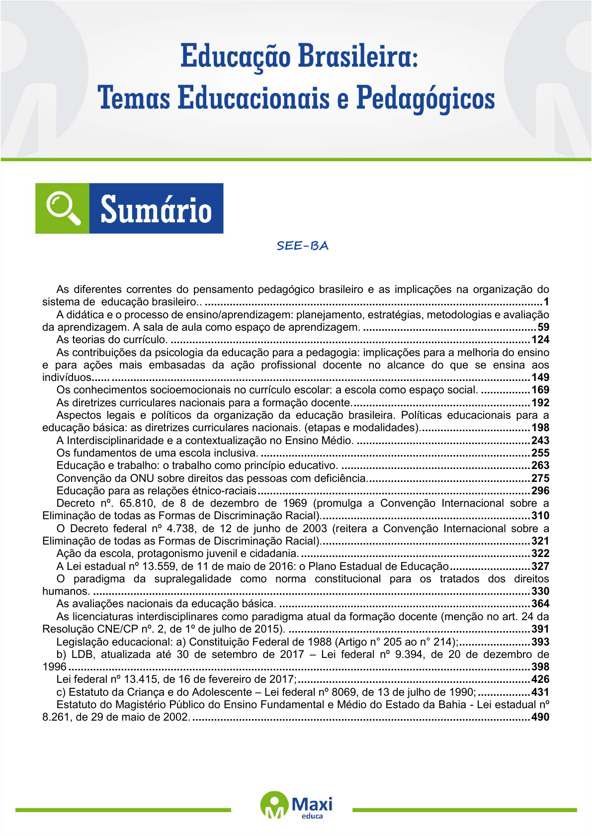 . 1 SEE-BA As diferentes correntes do pensamento pedagógico brasileiro e as implicações na organização do sistema de educação brasileiro.. ............................................................................................................. 1 A didática e o processo de ensino/aprendizagem: planejamento, estratégias, metodologias e avaliação da aprendizagem. A sala de aula como espaço de aprendizagem. ........................................................ 59 As teorias do currículo. .................................................................................................................... 124 As contribuições da psicologia da educação para a pedagogia: implicações para a melhoria do ensino e para ações mais embasadas da ação profissional docente no alcance do que se ensina aos indivíduos...... ....................................................................................................................................... 149 Os conhecimentos socioemocionais no currículo escolar: a escola como espaço social. ................ 169 As diretrizes curriculares nacionais para a formação docente. ......................................................... 192 Aspectos legais e políticos da organização da educação brasileira. Políticas educacionais para a educação básica: as diretrizes curriculares nacionais. (etapas e modalidades). ................................... 198 A Interdisciplinaridade e a contextualização no Ensino Médio. ........................................................ 243 Os fundamentos de uma escola inclusiva. ....................................................................................... 255 Educação e trabalho: o trabalho como princípio educativo. ............................................................. 263 Convenção da ONU sobre direitos das pessoas com deficiência. .................................................... 275 Educação para as relações étnico-raciais ........................................................................................ 296 Decreto nº. 65.810, de 8 de dezembro de 1969 (promulga a Convenção Internacional sobre a Eliminação de todas as Formas de Discriminação Racial). ................................................................... 310 O Decreto federal nº 4.738, de 12 de junho de 2003 (reitera a Convenção Internacional sobre a Eliminação de todas as Formas de Discriminação Racial). ................................................................... 321 Ação da escola, protagonismo juvenil e cidadania. .......................................................................... 322 A Lei estadual nº 13.559, de 11 de maio de 2016: o Plano Estadual de Educação .......................... 327 O paradigma da supralegalidade como norma constitucional para os tratados dos direitos humanos. ............................................................................................................................................. 330 As avaliações nacionais da educação básica. ................................................................................. 364 As licenciaturas interdisciplinares como paradigma atual da formação docente (menção no art. 24 da Resolução CNE/CP nº. 2, de 1º de julho de 2015). .............................................................................. 391 Legislação educacional: a) Constituição Federal de 1988 (Artigo n° 205 ao n° 214); ....................... 393 b) LDB, atualizada até 30 de setembro de 2017 – Lei federal nº 9.394, de 20 de dezembro de 1996 ..................................................................................................................................................... 398 Lei federal nº 13.415, de 16 de fevereiro de 2017; ........................................................................... 426 c) Estatuto da Criança e do Adolescente – Lei federal nº 8069, de 13 de julho de 1990; ................. 431 Estatuto do Magistério Público do Ensino Fundamental e Médio do Estado da Bahia - Lei estadual nº 8.261, de 29 de maio de 2002. ............................................................................................................. 490 1381340 E-book gerado especialmente para DIEGO SALES DE OLIVEIRA . 2 Candidatos ao Concurso Público, O Instituto Maximize Educação disponibiliza o e-mail professores@maxieduca.com.br para dúvidas relacionadas ao conteúdo desta apostila como forma de auxiliá-los nos estudos para um bom desempenho na prova. As dúvidas serão encaminhadas para os professores responsáveis pela matéria, portanto, ao entrar em contato, informe: - Apostila (concurso e cargo); - Disciplina (matéria); - Número da página onde se encontra a dúvida; e - Qual a dúvida. Caso existam dúvidas em disciplinas diferentes, por favor, encaminhá-las em e-mails separados. O professor terá até cinco dias úteis para respondê-la. Bons estudos! 1381340 E-book gerado especialmente para DIEGO SALES DE OLIVEIRA . 1 Caro(a) candidato(a), antes de iniciar nosso estudo, queremos nos colocar à sua disposição, durante todo o prazo do concurso para auxiliá-lo em suas dúvidas e receber suas sugestões. Muito zelo e técnica foram empregados na edição desta obra. No entanto, podem ocorrer erros de digitação ou dúvida conceitual. Em qualquer situação, solicitamos a comunicação ao nosso serviço de atendimento ao cliente para que possamos esclarecê-lo. Entre em contato conosco pelo e-mail: professores@maxieduca.com.br História da Educação Brasileira Conforme o texto de Bello1, a História da Educação Brasileira não é uma História difícil de ser estudada e compreendida. Ela evolui em rupturas marcantes e fáceis de serem observadas. A primeira grande ruptura travou-se com a chegada mesmo dos portugueses ao território do Novo Mundo. Não podemos deixar de reconhecer que os portugueses trouxeram um padrão de educação p