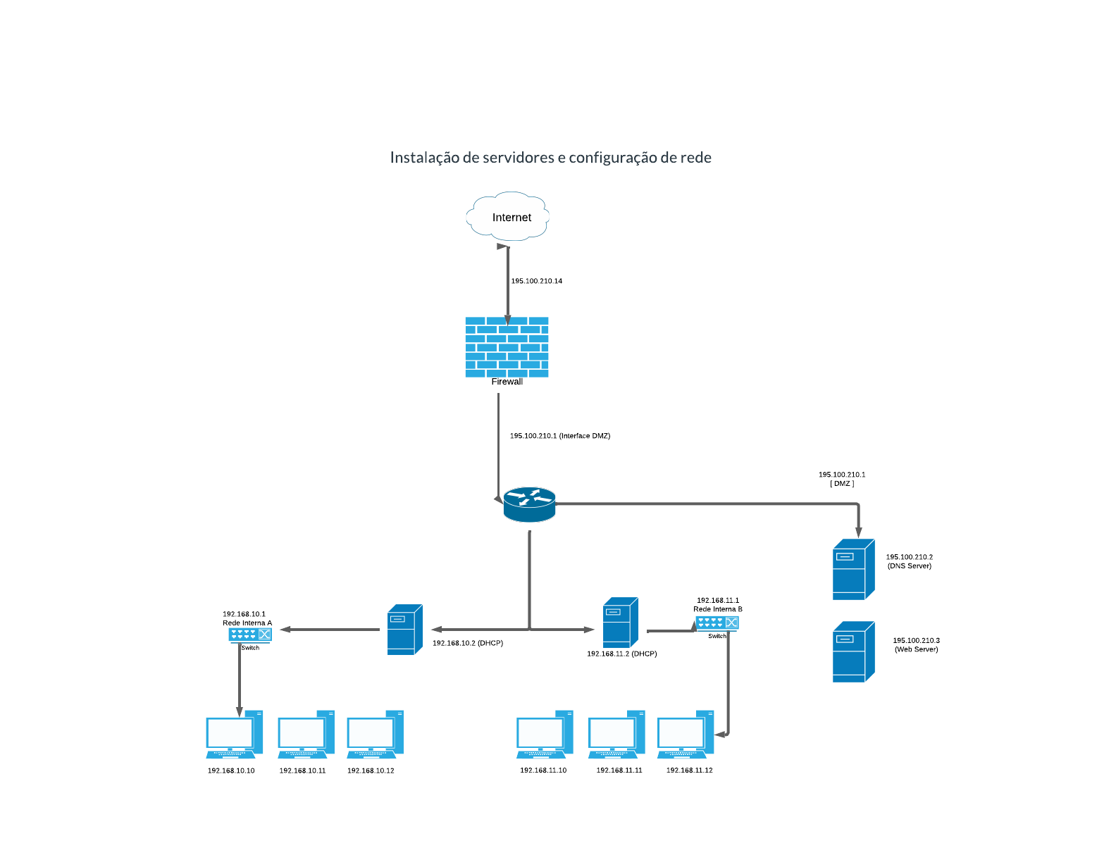 Internet Firewall 195.100.210.3 (Web Server) 195.100.210.2 (DNS Server) 195.100.210.14 195.100.210.1 (Interface DMZ) 195.100.210.1 [ DMZ ] 192.168.10.1 Rede Interna A 192.168.11.1 Rede Interna B 192.168.10.2 (DHCP) 192.168.11.2 (DHCP) 192.168.10.12192.168.10.10 192.168.10.11 192.168.11.10 192.168.11.11 192.168.11.12 Switch Switch Instalação de servidores e configuração de rede