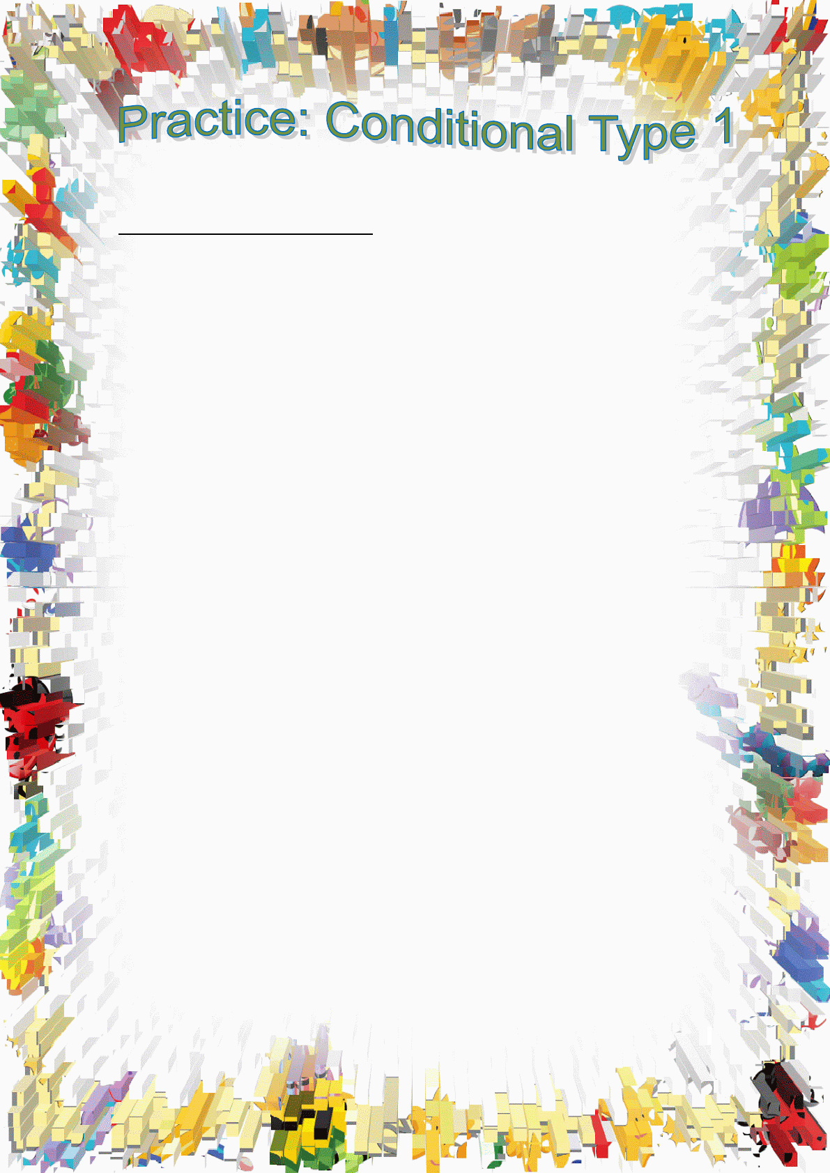 Complete using your own ideas. 1. If I don’t do my English homework, _______________________________ 2. My sister won’t go to work if __________________________________ 3. If you go to the cinema, _______________________________________ 4. If I had studied more for the exam, ______________________________ 5. If you drink too much, _________________________________________ 6. Sea animals will be in serious danger _____________________________ 7. I'll pass all my tests___________________________________________ 8. If my husband doesn’t go to work, _______________________________ 9. If it rains all weekend__________________________________________ 10. I'll go to bed early ___________________________________________ 11. If the weather is bad this weekend, _____________________________ 12. He’ll lose his job _________________________________________ 13. If I buy that car, _____________________________________________ 14. If I feel sick tomorrow morning_________________________________ 15. I won’t go the party _________________________________________
