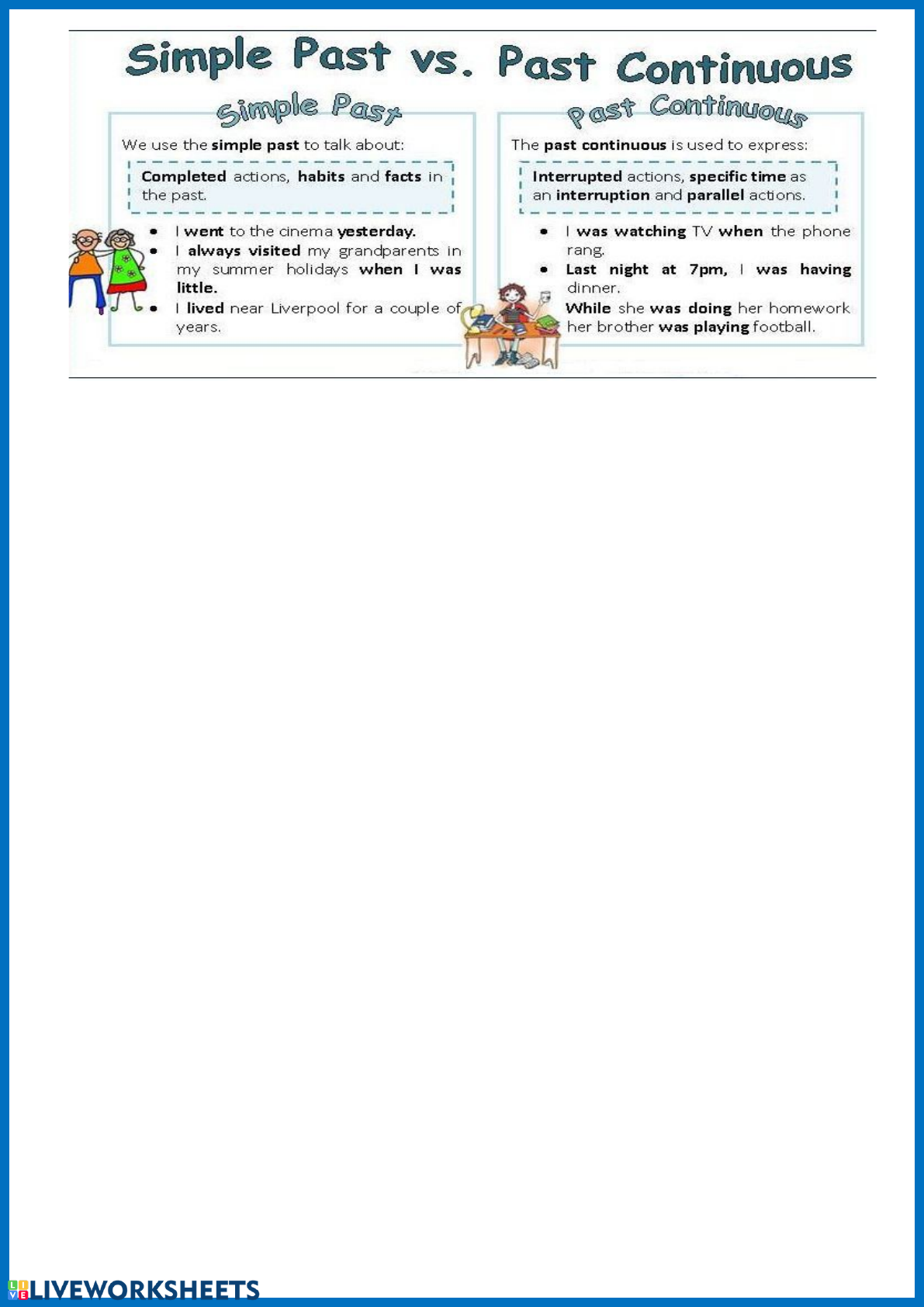 Complete the sentences with past simple or continuous 1. We (cycle) when the rain (start). 2. He (break) the vase while he (play) ball at home. 3. My mum (come) in while I (surf) on the net. 4. The electricity (go off) as I (bake) a cake. 5. Sandra (catch) when her sister (fall) down the stairs. 6. I (play) golf when it (begin) to rain. 7. While she (read) a novel, her sister (turn on) the CD player. 8. They (walk) along the beach when they (see)the accident. 9. We (study) when we (hear) a terrible noise. 10. While she (do) the ironing, her husband (set) the table. 11. We (dance) when he (faint). 12. When he (fall) down the tree, he (break) his leg. 13. I (be) shocked when I (hear)the bad news. 14. She (cry) when I (see) her. 15. My parents (sit) in the garden while we (play) badminton. 16. you (swim) in the sea at 6.00 am? 17. Bob (lie) in the garden when it (start) to rain. 18. As I (put) the baby to bed, the phone (ring). 19. What you (do) when Dan (fall)? 20. How you (break) the window? 21. I (write) an e-mail when the postman (deliver) his letter! 22. When I (leave) home yesterday, some dogs (sit) near the front gate. 23. John (not swim) at four o’clock. He (play) football. 24. While I (swim) in the river, I (see) some frogs. 25. Jim (not pay) attention when he (drive) his car into a tree. 26. What you (do) while she (sleep)? 27. Everyone (sleep) when the robbers (break in). 28. We (arrive) at the station just as the train (leave). Complete the sentences with while or when. 1. We were playing basketball it began to rain. 2. The dog was barking we were sleeping. 3. I was watching TV she called. 4. the phone rang, she was writing a letter. 5. we were having the picnic, it started to rain. 6. What were you doing the earthquake started? 7. You were not listening to me I told you to turn the oven off. 8. John was sleeping last night, someone stole his car. 9. I was just getting into the bath the telephone rang. 10. Were you listening he was talking? 11. Ellen was reading, Tim was watching television. 12. she came home from school she really didn't look well Complete the text with past simple or past continuous A lorry driver (drive) 200 penguins to London Zoo when his lorry (break) down on the motorway. The driver (get) out of the cab and (look) at the engine when a second lorry driver (stop) in front of him and (ask) if he (need) help. The penguins' driver (explain) that he (take) the penguins to the zoo and (ask) if the other man would take the penguins there. He (agreed). Today (not be) not a good day. First of all, my alarm clock (not ring). Then, while I (have) a shower, my dad (go) to work so I had to walk to school. It (rain) and I got very wet. When I (walk) into class everyone (study) hard and in silence. The teacher (look) at me and said, ‘Good afternoon John. How nice of you to join us. ’Everyone (laugh). I (be) so embarrassed.