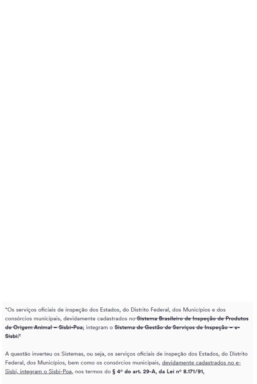 QUESTÕES DE Politica Agricola com Gabarito Resposta Questão 1. De acordo com a Lei nº 8.171, de 17 de janeiro 1991, que dispõe sobre a Política Agrícola, no que se refere ao Ministério da Agricultura, Pecuária e Abastecimento, julgue o item a seguir. O Ministério da Agricultura, Pecuária e Abastecimento editará norma para definir os objetivos e as metas nacionais de inocuidade e de conformidade dos produtos de origem animal, que deverá ser observada pelos serviços de inspeção dos Estados, do Distrito Federal, dos Municípios e dos consórcios municipais integrantes do Sistema Brasileiro de Inspeção de Produtos de Origem Animal – Sisbi-Poa. Certo. Errado. RESPOSTA: CERTO Questão 2. De acordo com a Lei nº 8.171, de 17 de janeiro 1991, que dispõe sobre a Política Agrícola, no que se refere aos serviços oficiais de inspeção, julgue o item a seguir. Os serviços oficiais de inspeção dos Estados, do Distrito Federal, dos Municípios e dos consórcios municipais, devidamente cadastrados no Sistema Brasileiro de Inspeção de Produtos de Origem Animal – Sisbi-Poa, integram o Sistema de Gestão de Serviços de Inspeção – e-Sisbi. Certo. Errado. RESPOSTA: ERRADO Questão 3. De acordo com a Lei nº 8.171, de 17 de janeiro 1991, que dispõe sobre a Política Agrícola, no que se refere ao Sistema de Gestão de Serviços de Inspeção – e-Sisbi, julgue o item a seguir. É instituído o Sistema de Gestão de Serviços de Inspeção – e-Sisbi no âmbito do Ministério da Agricultura, Pecuária e Abastecimento, para cadastro dos serviços oficiais de inspeção e fiscalização dos Estados, do Distrito Federal, dos Municípios e dos consórcios estaduais, bem como dos estabelecimentos e dos produtos de origem animal. Certo. Errado. RESPOSTA: ERRADO Questão 4. De acordo com a Lei nº 8.171, de 17 de janeiro 1991, que dispõe sobre a Política Agrícola, no que se refere ao Sistema Unificado de Atenção à Sanidade Agropecuária, julgue o item a seguir. Como parte do Sistema Unificado de Atenção à Sanidade Agropecuária, serão constituídos um sistema brasileiro de inspeção de produtos de origem vegetal e um sistema brasileiro de inspeção de produtos de origem animal, bem como sistemas específicos de inspeção para insumos usados na agropecuária. Certo. Errado. RESPOSTA: CERTO Questão 5. De acordo com a Lei nº 8.171, de 17 de janeiro 1991, que dispõe sobre a Política Agrícola, no que se refere à inspeção industrial e sanitária, julgue o item a seguir. A inspeção industrial e sanitária de produtos de origem vegetal e animal, bem como a dos insumos agropecuários, será gerida de maneira que os procedimentos e a organização da inspeção se façam por métodos universalizados e aplicados equitativamente em todos os estabelecimentos inspecionados, podendo ser adotado na inspeção o método de análise de riscos e pontos críticos de controle. Certo. Errado. RESPOSTA: CERTO image1.png image2.png