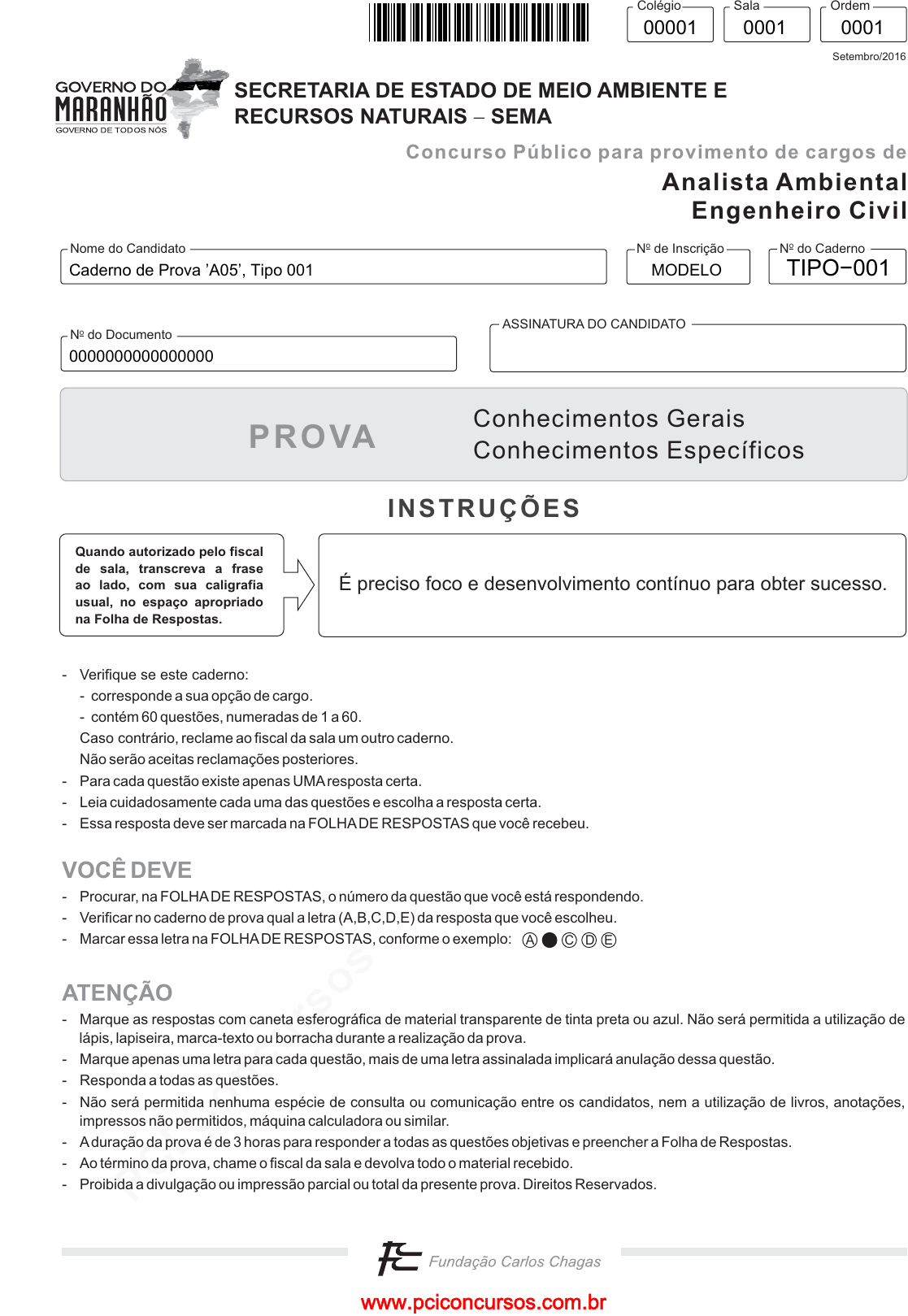 pcimarkpci MjgwNDowMWIwOjE4NDE6NDQ5ODo1ZGZhOmU1ZGY6Y2Y5ODo4MDFh:V2VkLCAwNyBGZWIgMjAyNCAxNTozNzozOSAtMDMwMA== www.pciconcursos.com.br N do CadernooN de Inscriçãoo ASSINATURA DO CANDIDATO N do Documentoo Nome do Candidato Analista Ambiental Engenheiro Civil Concurso Público para provimento de cargos de Setembro/2016 Colégio Sala Ordem SECRETARIA DE ESTADO DE MEIO AMBIENTE E RECURSOS NATURAIS SEMA� Quando autorizado pelo fiscal de sala, transcreva a frase ao lado, com sua caligrafia usual, no espaço apropriado na Folha de Respostas. INSTRUÇÕES PROVA É preciso foco e desenvolvimento contínuo para obter sucesso. A C D E - Verifique se este caderno: - corresponde a sua opção de cargo. - contém 60 questões, numeradas de 1 a 60. Caso contrário, reclame ao fiscal da sala um outro caderno. Não serão aceitas reclamações posteriores. - Para cada questão existe apenas UMAresposta certa. - Leia cuidadosamente cada uma das questões e escolha a resposta certa. - Essa resposta deve ser marcada na FOLHADE RESPOSTAS que você recebeu. - Procurar, na FOLHADE RESPOSTAS, o número da questão que você está respondendo. - Verificar no caderno de prova qual a letra (A,B,C,D,E) da resposta que você escolheu. - Marcar essa letra na FOLHADE RESPOSTAS, conforme o exemplo: - Marque as respostas com caneta esferográfica de material transparente de tinta preta ou azul. Não será permitida a utilização de lápis, lapiseira, marca-texto ou borracha durante a realização da prova. - Marque apenas uma letra para cada questão, mais de uma letra assinalada implicará anulação dessa questão. - Responda a todas as questões. - Não será permitida nenhuma espécie de consulta ou comunicação entre os candidatos, nem a utilização de livros, anotações, impressos não permitidos, máquina calculadora ou similar. - Aduração da prova é de 3 horas para responder a todas as questões objetivas e preencher a Folha de Respostas. - Ao término da prova, chame o fiscal da sala e devolva todo o material recebido. - Proibida a divulgação ou impressão parcial ou total da presente prova. Direitos Reservados. VOCÊ DEVE ATENÇÃO Conhecimentos Gerais Conhecimentos Específicos Caderno de Prova ’A05’, Tipo 001 MODELO 0000000000000000 TIPO−001 00001 0001 0001 www.pciconcursos.com.br pcimarkpci MjgwNDowMWIwOjE4NDE6NDQ5ODo1ZGZhOmU1ZGY6Y2Y5ODo4MDFh:V2VkLCAwNyBGZWIgMjAyNCAxNTozNzozOSAtMDMwMA== www.pciconcursos.com.br 2 SEMAD-Conhecimentos Gerais1 CONHECIMENTOS GERAIS Língua Portuguesa Atenção: Para responder às questões de números 1 a 8, considere o texto abaixo. COP-21 já foi. E agora, o que virá? O Acordo do Clima aprovado em Paris em dezembro de 2015 não resolve o problema do aquecimento global, apenas cria um ambiente político mais favorável à tomada de decisão para que os objetivos assinalados formalmente por 196 países sejam alcançados. Como todo marco regulatório, o acordo estabelece apenas as condições para que algo aconteça, e, nesse caso, não há sequer prazos ou metas. As propostas apresentadas voluntariamente pelos países passam a ser consideradas “metas” que serão reavaliadas a cada 5 anos, embora a soma dessas propostas não elimine hoje o risco de enfrentarmos os piores cenários climáticos com a iminente elevação média de temperatura acima de 2 ºC. Sendo assim, o que precisa ser feito para que o Acordo de Paris faça alguma diferença para a humanidade? A 21 a Conferência do Clima (COP-21) sinaliza um caminho. Para segui-lo, é preciso realizar muito mais − e melhor − do que tem sido feito até agora. A quantidade de moléculas de CO2 na atmosfera já ultrapassou as 400 ppm (partes por milhão), indicador que confirmaria − segundo o Painel Intergovernamental de Mudança Climática (IPCC) da ONU − a progressão rápida da temperatura acima dos 2 °C. A decisão mais urgente deveria ser a eliminação gradual dos U$ 700 bilhões anuais em subsídios para os combustíveis fósseis. Sem essa medida, como imaginar que a nossa atual dependência de petróleo, carvão e gás (75% da energia do mundo é suja) se modifique no curto prazo? Para piorar a situação, apesar dos investimentos crescentes que acontecem mundo afora em fontes limpas e renováveis de energia (solar, eólica, biomassa, etc.), nada sugere, pelo andar da carruagem, que testemunhemos a inflexão da curva de emissões de gases estufa. Segundo a vice-presidente do IPCC, a climatologista brasileira Thelma Krug, a queima de combustíveis fósseis segue em alta e não há indícios de que isso se modifique tão cedo. Como promover tamanho freio de arrumação em um planeta tão acostumado a emitir gases estufa sem um novo projeto educacional? Desde cedo a garotada precisa entender o gigantesco desafio civilizatório embutido no combate ao aquecimento global. O Acordo do Clima é certamente um dos maiores e mais importantes da história da diplomacia mundial. Mas não nos iludamos. Tal como a Declaração Universal dos Direitos Humanos (adotada pela ONU em 1948), o Acordo sinaliza rumo e perspectiva, aponta o que é o certo, e se apresenta como um compromisso coletivo. Tornar o Acordo realidade exige atitude. Diária e obstinada. (Adaptado de: TRIGUEIRO, André. http://g1.globo.com/natureza/blog/mundo-sustentavel/2.html) 1. Na opinião do autor, o Acordo do Clima (A) teve como mérito o fato de reunir formalmente muitos países em prol de um único objetivo, que consiste em reduzir, ainda que parcialmente, a exploração de combustíveis fósseis em um prazo inicial de cinco anos. (B) tem o importante papel de estabelecer as bases políticas para que se desenvolvam planos de redução de emissão de gases de efeito estufa, conquanto não tenha determinado ações concretas que os viabilizem a curto prazo. (C) contribuirá de maneira eficaz para que a temperatura do planeta não ultrapasse os 2 ºC estipulados pelo Painel Intergo- vernamental de Mudança Climática da ONU, tendo em vista