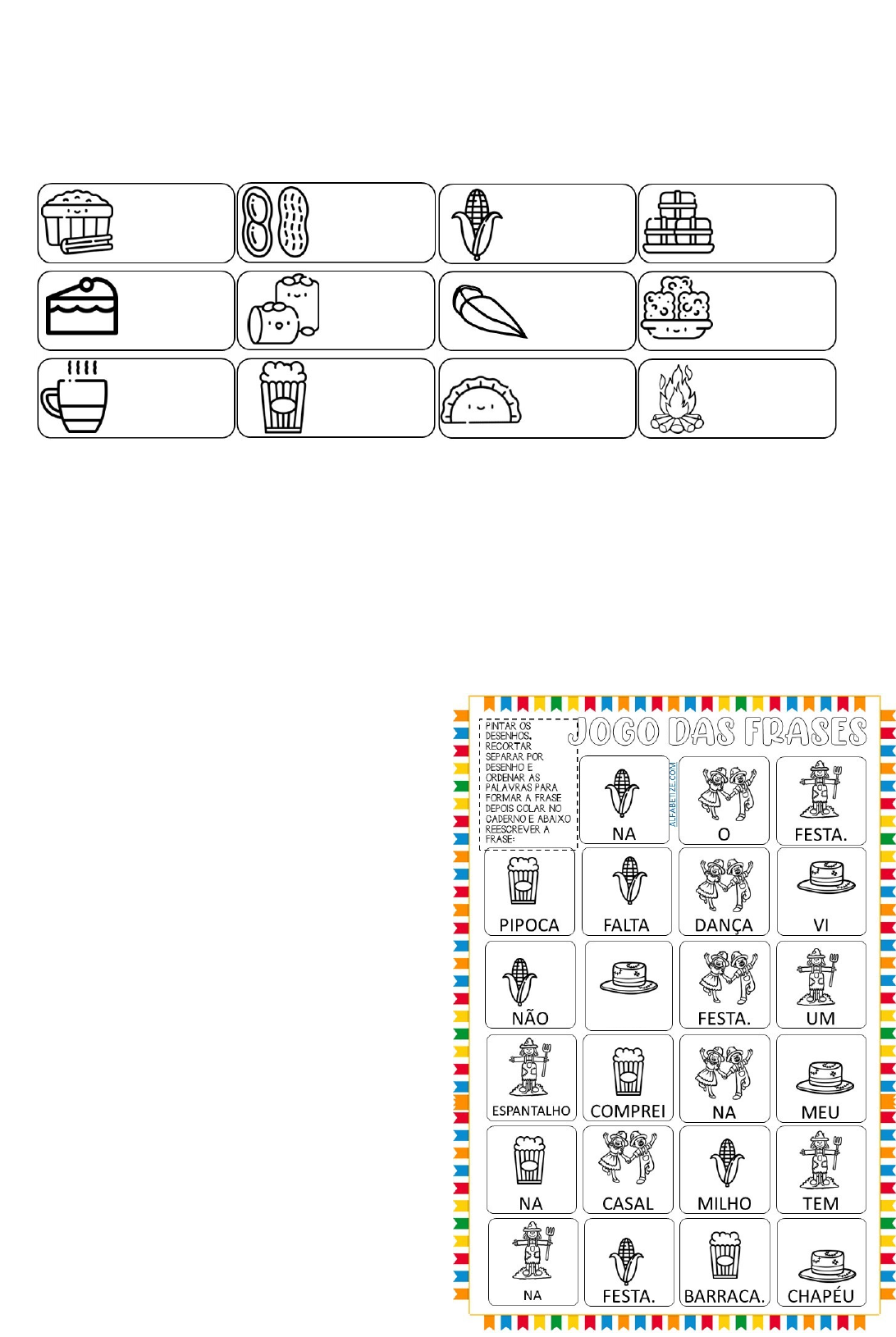 AULA DO DIA 17/06/2024 1º Momento: Acolhida, calendário, colocar a data no quadro: Canguçu, 17 de junho de 2024. 2º Momento: O que tem na festa junina? Escreva o nome de cada figura: AMENDOIM PAMONHA FOGUEIRA RAPADURA PASTEL PINHÃO MILHO BOLO CANJICA PAÇOCA PIPOCA QUENTÃO 3º Momento: COPIAR NO QUADRO: ESCREVA UMA FRASE COM: BALÃO: _______________________________________________________________________________ PIPOCA: _______________________________________________________________________________ FOGUEIRA: ____________________________________________________________________________ MILHO: ________________________________________________________________________________ CAIR. 4º Momento: Montar frases: · Pintar os desenhos; · Recortar os quadradinhos; · Juntar os quadradinhos com os mesmos desenhos; · Organizar as palavras para formar frases; · Colar os quadradinhos com a frase organizada no caderno; · Reescrever a frase abaixo (se possível, com letra cursiva); FRASES: O casal dança na festa; Não falta milho na festa; Tem um espantalho na festa; Comprei pipoca na barraca. Vi meu chapéu cair. 5º Momento: Atividade de matemática - Adição e subtração. Explicar para os alunos como realizar os cálculos de adição e subtração com unidades e dezenas. 6º Momento: Construção do Jogo da Velha Junino. · Primeiro pinte a cartela e os marcadores; · Recorte a cartela e os marcadores; · Se tiver cartolina na escola, colar na cartolina para ficar mais firme; · Formar duplas para jogar o Jogo da Velha Junino; · Quem perder paga uma prenda escolhida pelo adversário. Exemplo: pular de um pé só, correr com as mãos para cima, imitar um animal. Use a criatividade! · Fazer um envelope de papel para cada aluno guardar o jogo. Jogo da Velha Junino Jogo da Velha Junino Jogo da Velha Junino O QUE TEM NA FESTA JUNINA? ESCREVA O NOME DE CADA FIGURA: CAIR. image4.jpeg image4.png image5.png image6.png image7.png image8.png image9.png image10.png image11.png image12.png image14.png image120.png image110.png image2.jpeg image3.jpeg