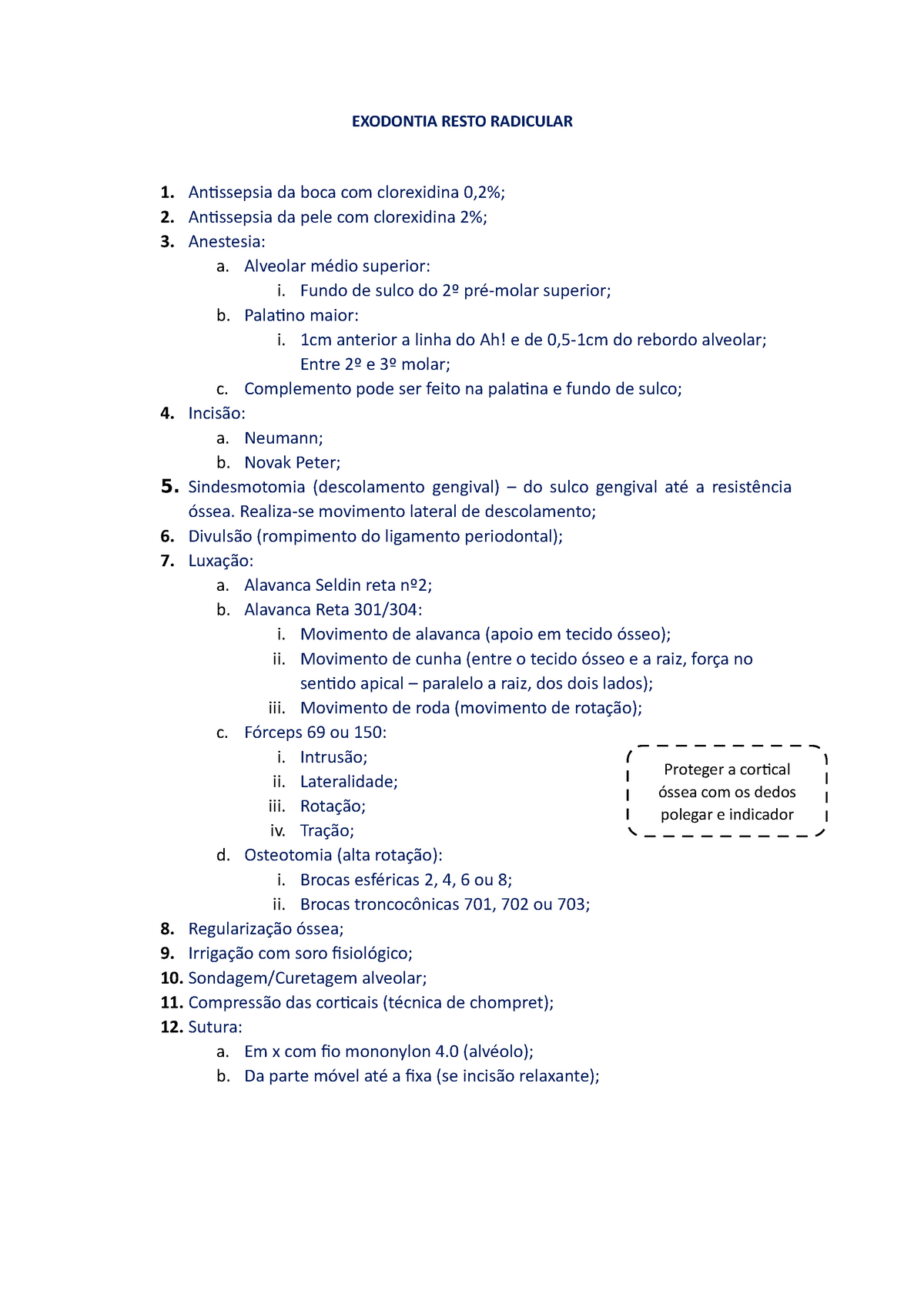 EXODONTIA RESTO RADICULAR 1. Antissepsia da boca com clorexidina 0,2%; 2. Antissepsia da pele com clorexidina 2%; 3. Anestesia: a. Alveolar médio superior: i. Fundo de sulco do pré-molar superior; b. Palatino maior: i. 1cm anterior a linha do Ah! e de 0,5-1cm do rebordo alveolar; Entre e molar; Complemento pode ser feito na palatina e fundo de sulco; 4. Incisão: a. Neumann; b. Novak Peter; 5. Sindesmotomia (descolamento gengival) - do sulco gengival até a resistência óssea. Realiza-se movimento lateral de descolamento; 6. Divulsão (rompimento do ligamento periodontal); 7. Luxação: a. Alavanca Seldin reta b. Alavanca Reta 301/304: i. Movimento de alavanca (apoio em tecido ii. Movimento de cunha (entre o tecido ósseo e a raiz, força no sentido apical - paralelo a raiz, dos dois lados); iii. Movimento de roda (movimento de rotação); Fórceps 69 ou 150: i. Intrusão; Proteger a cortical ii. Lateralidade; óssea com os dedos iii. Rotação; polegar e indicador iv. Tração; d. Osteotomia (alta rotação): i. Brocas esféricas 2, 4, 6 ou 8; ii. Brocas troncocônicas 701, 702 ou 703; 8. Regularização óssea; 9. Irrigação com soro fisiológico; 10. Sondagem/Curetagem alveolar; 11. Compressão das corticais (técnica de chompret); 12. Sutura: a. Em X com fio mononylon 4.0 (alvéolo); b. Da parte móvel até a fixa (se incisão relaxante);