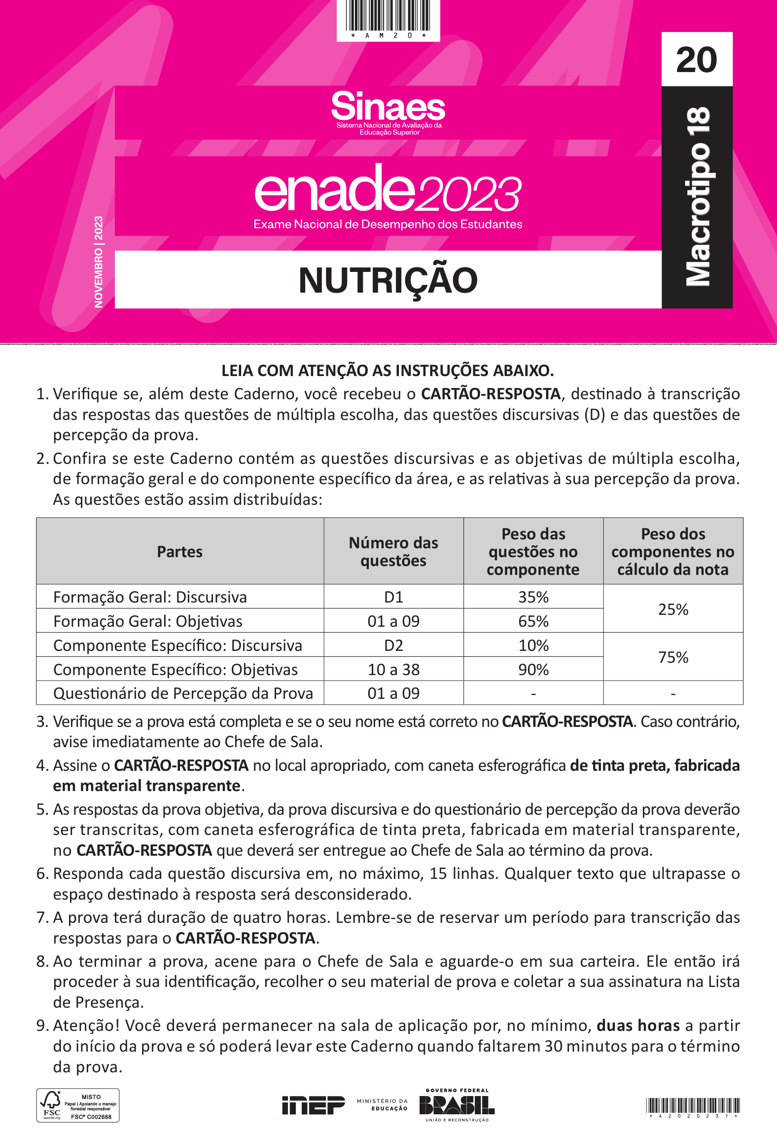 M I N I S T É R I O D A E D U C A Ç Ã O LEIA COM ATENÇÃO AS INSTRUÇÕES ABAIXO. 1. Verifi que se, além deste Caderno, você recebeu o CARTÃO-RESPOSTA, desti nado à transcrição das respostas das questões de múlti pla escolha, das questões discursivas (D) e das questões de percepção da prova. 2. Confira se este Caderno contém as questões discursivas e as objetivas de múltipla escolha, de formação geral e do componente específi co da área, e as relati vas à sua percepção da prova. As questões estão assim distribuídas: Partes Número das questões Peso das questões no componente Peso dos componentes no cálculo da nota Formação Geral: Discursiva D1 35% 25% Formação Geral: Objeti vas 01 a 09 65% Componente Específi co: Discursiva D2 10% 75% Componente Específi co: Objeti vas 10 a 38 90% Questi onário de Percepção da Prova 01 a 09 - - 3. Verifi que se a prova está completa e se o seu nome está correto no CARTÃO-RESPOSTA. Caso contrário, avise imediatamente ao Chefe de Sala. 4. Assine o CARTÃO-RESPOSTA no local apropriado, com caneta esferográfi ca de ti nta preta, fabricada em material transparente. 5. As respostas da prova objeti va, da prova discursiva e do questi onário de percepção da prova deverão ser transcritas, com caneta esferográfica de tinta preta, fabricada em material transparente, no CARTÃO-RESPOSTA que deverá ser entregue ao Chefe de Sala ao término da prova. 6. Responda cada questão discursiva em, no máximo, 15 linhas. Qualquer texto que ultrapasse o espaço desti nado à resposta será desconsiderado. 7. A prova terá duração de quatro horas. Lembre-se de reservar um período para transcrição das respostas para o CARTÃO-RESPOSTA. 8. Ao terminar a prova, acene para o Chefe de Sala e aguarde-o em sua carteira. Ele então irá proceder à sua identi fi cação, recolher o seu material de prova e coletar a sua assinatura na Lista de Presença. 9. Atenção! Você deverá permanecer na sala de aplicação por, no mínimo, duas horas a partir do início da prova e só poderá levar este Caderno quando faltarem 30 minutos para o término da prova. 20 M ac ro tip o 18 NUTRIÇÃO VALIDINEP2023VALIDINEP2023VALIDINEP2023VALIDINEP2023VALIDIN3P2023VALIDINEP2023VALIDINEP2023VALIDINEP2023VALIDINEP2023VALIDINEP2023VALIDINEP2023VALIDINEP2023VALIDINEP2023VALIDINEP2023VALIDINEP2023VALIDINEP2023VALIDINEP2023VALIDINEP2023VALIDINEP2023VALIDINEP2023VALIDINEP2023VALIDINEP2023VALIDINEP2023VALIDINEEP2023VALIDINEP2023VALIDINEP2023VALIDINEP2023VALIDINEP2023VALIDINEP2023VALIDINEP2023VALIDINEP2023VALIDINEP2023VALIDDINVALIDINEP2023VALIDINEP2023VALIDINEP2023VALIDINEP2023VALIDINEP2023VALIDINEP2023VALIDINEP2023VALIDINEP2023VALIDINEP2023VALIDINEP2023VALIDINEP2023VALIDINEP2023VALIDINEP N O VE M BR O | 20 23 *a2020231* creo 2 Nutrição FORMAÇÃO GERAL 2 MATÉRIA QUESTÃO DISCURSIVA 01 Na publicação Síntese de Indicadores Sociais, divulgada pelo Insti tuto Brasileiro de Geografi a e Estatí sti ca (IBGE) em 2022, é sistemati zado um conjunto de informações sobre a realidade social brasileira. Os indicadores ilustram a heterogeneidade da sociedade sob a perspecti va das desigualdades sociais e, de modo geral, demonstram que todas as Grandes Regiões do Brasil registraram aumento da extrema pobreza em 2021. Pelos critérios do Banco Mundial, cerca de 29,4% da população do Brasil estavam em situação de pobreza e 8,4%, de extrema pobreza, sendo esses os maiores percentuais de ambos os grupos desde o início da série, em 2012. O índice de Gini, indicador que permite analisar o nível de igualdade ou desigualdade de uma região ou de um país, teve seu valor elevado e ati ngiu o segundo maior patamar da série. Com esses resultados, o Brasil permanece entre os países mais desiguais do mundo. Além disso, a urbanização desigual e acelerada resultou na expansão e no agravamento de diversos problemas socioambientais. São evidentes as desigualdades territoriais no acesso a áreas com infraestrutura adequada nas cidades brasileiras. É na periferia, marcada pela estrati fi cação e segregação socioespacial, que se consolida a exclusão da população vulnerabilizada socioeconomicamente. Disponível em: htt ps://agenciadenoti cias.ibge.gov.br/agencia-noti cias/2012-agencia-de-noti cias/noti cias/ 35687-em-2021-pobreza-tem-aumento-recorde-e-ati nge-62-5-milhoes-de-pessoas-maior-nivel-desde-2012. Acesso em: 9 jun. 2023 (adaptado). A parti r das ideias apresentadas no texto, faça o que se pede nos itens a seguir. a) Explique a relação entre o perfi l da população brasileira ati ngida pelas desigualdades sociais nas cidades e os fenômenos de risco socioambiental. (valor: 5,0 pontos) b) Apresente duas propostas que possam ser desenvolvidas em bairros periféricos com condições habitacionais precárias, de forma a serem minimizados os riscos socioambientais, e que envolvam ação governamental e parti cipação da comunidade. (valor: 5,0 pontos) RASCUNHO 1 2 3 4 5 6 7 8 9 10 11 12 13 14 15 FORMAÇÃO GERAL *2* VALIDINEP2023VALIDINEP2023VALIDINEP2023VALIDINEP2023VALIDIN3P2023VALIDINEP2023VALIDINEP2023VALIDINEP2023VALIDINEP2023VALIDINEP2023VALIDINEP2023VALIDINEP2023VALIDINEP2023VALIDINEP2023VALIDINEP2023VALIDINEP2023VALIDINEP2023VALIDINEP2023VALIDINEP2023VALIDINEP2023VALIDINEP2023VALIDINEP2023VALIDINEP2023VALIDINEP2023VALIDINEP2023VALIDINEP2023VALIDINEP2023VALIDINEP2023VALIDINEP2023VALIDINEP2023VALIDINEP2023VALIDINEP2023VALIDINEP2023VALIDINEP2023VALIDINEP2023VALIDINEP2023VALIDINEP2023VAL1DINEP2023VALIDINEP20233VALIDINEP2023VALIDDINEP2023 VALIDINEP2023VALIDINEP2023VALIDIN3P2023VALIDINEP2023VALIDIN3P2VALIDINEP 3MATÉRIA QUESTÃO 01 A fome e a insegurança alimentar, anti gos problemas da sociedade, são agravados em regiões com elevados índices de desigualdade social. Propor soluções para esse quadro requer uma abordagem multi dimensional, que possibilite a interação entre as dimensões sociais, culturais, políti cas, econômicas e ambient