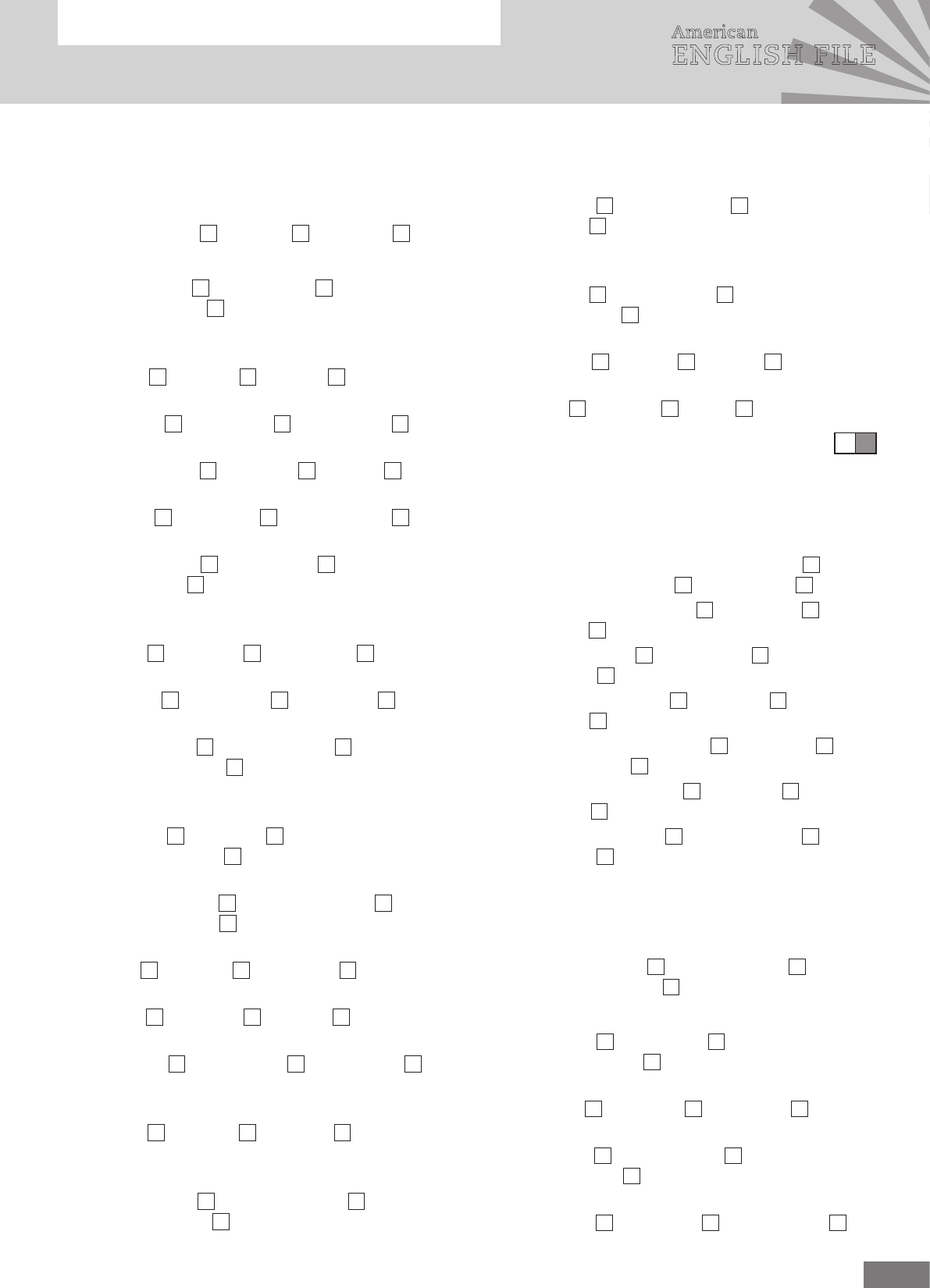 1 NAME CLASS American ENGLISH FILE Starter American English File Starter Photocopiable © Oxford University Press 2013 6 Quick Test GRAMMAR Check (✓) A, B, or C to complete the sentences. Example: John ________ chocolate. A like B likes ✓ C is like 1 Sally ________ newspapers. A don’t read B reads not C doesn’t read 2 A Do you work in an office? B Yes, ________. A do I B I am C I do 3 She ________ TV in the evening. A watch B watchs C watches 4 I ________ drink tea. A don’t never B never C not 5 What ________ do you get up? A time B is time C is the time 6 ________ Samantha have lunch? A When does B When is C When do 7 A Does he live in an apartment? B No, he ________. A not B don’t C doesn’t 8 Jamie ________ Chinese in college. A study B studies C studys 9 ________ coffee? A She drinks B Is she drink C Does she drink 10 A He works in a hospital. Is he a doctor? B No, he’s a ________. A waiter B nurse C factory worker 11 Peggy _____ at six. A gets up always B always gets up C gets always up 12 Does John ________ to the gym on the weekends? A go B goes C can go 13 ________ you listen to the radio sometimes? A Do B Does C Are 14 Minnie’s a salesperson. She works in ________. A a store B an office C a school 15 A Does Alan live at home? B Yes, he ________. A live B lives C does 16 A Does she speak French? B ________. A Yes, she do B No, she don’t C Yes, she does 17 A Does she eat in restaurants? B No, she ________ eats in restaurants. A always B sometimes C never 18 A Do you like ________? B Yes, I do. I usually get up at 5:00. A lunch B mornings C tomorrow 19 He’s an assistant. He doesn’t ________ his job. A watch B like C live 20 What ________ he eat for breakfast? A do B does C is VOCABULARY a Which word is different from the bold word? Check (✓) A, B, or C. Example: on the street A in a restaurant B in a school C go home ✓ 1 hairdresser A teacher B lawyer C sugar 2 office A shop B hospital C doctor 3 factory A hospital B office C nurse 4 doctor A factory worker B school C salesperson 5 always A sometimes B never C finish 6 lunch A breakfast B housework C dinner b Check (✓) the correct place A, B, or C. Example: Sonia is an assistant in ________. A a shop B a restaurant C an office ✓ 7 Sue’s a ________. She works in a hospital. A doctor B teacher C policewoman 8 Jerry works in a ________. A bank B home C waiter 9 He’s a ________. He takes tourists to museums. A waiter B tour guide C policeman 10 I’m a waiter. I work in a ________. A school B dinner C restaurant 20 2 NAME CLASS American ENGLISH FILE Starter American English File Starter Photocopiable © Oxford University Press 2013 6 Quick Test 11 We go ________ in a store. A shopping B have dinner C go to bed 12 I study Portuguese on Fridays. I go to ________ downtown. A a restaurant B a museum C a school c Check (✓) A, B, or C to complete the phrases. Example: Do you sometimes go _____? A shopping ✓ B dinner C movies 13 When do you finish ________? A home B work C bed 14 In the morning, do you take a ________? A TV B breakfast C shower 15 Do you go to ________? A the gym B shopping C home 16 What do you usually have ________? A dinner B for dinner C on dinner 17 Does she take ________ at night? A a bath B dinner C TV 18 When does he ________? A go housework B do housework C housework do 19 What time does he ________ work on a typical day? A stay B live C finish 20 In the morning, do you always make ________? A breakfast B dinner C a shower PRONUNCIATION a Which word has a different sound? Check (✓) A, B, or C. Example: A writes B finds ✓ C walks 1 A likes B watches C finishes 2 A speaks B is C works 3 A lives B has C asks 4 A does B speaks C listens 5 A reads B eats C drinks b Which is the stressed syllable? Check (✓) A, B, or C. Example: A factory ✓ B factory C factory 6 A assistant B assistant C assistant 7 A salesperson B salesperson C salesperson 8 A policeman B policeman C policeman 9 A messages B messages C messages 10 A sandwiches B sandwiches C sandwiches 10 50Grammar, Vocabulary, and Pronunciation total 20