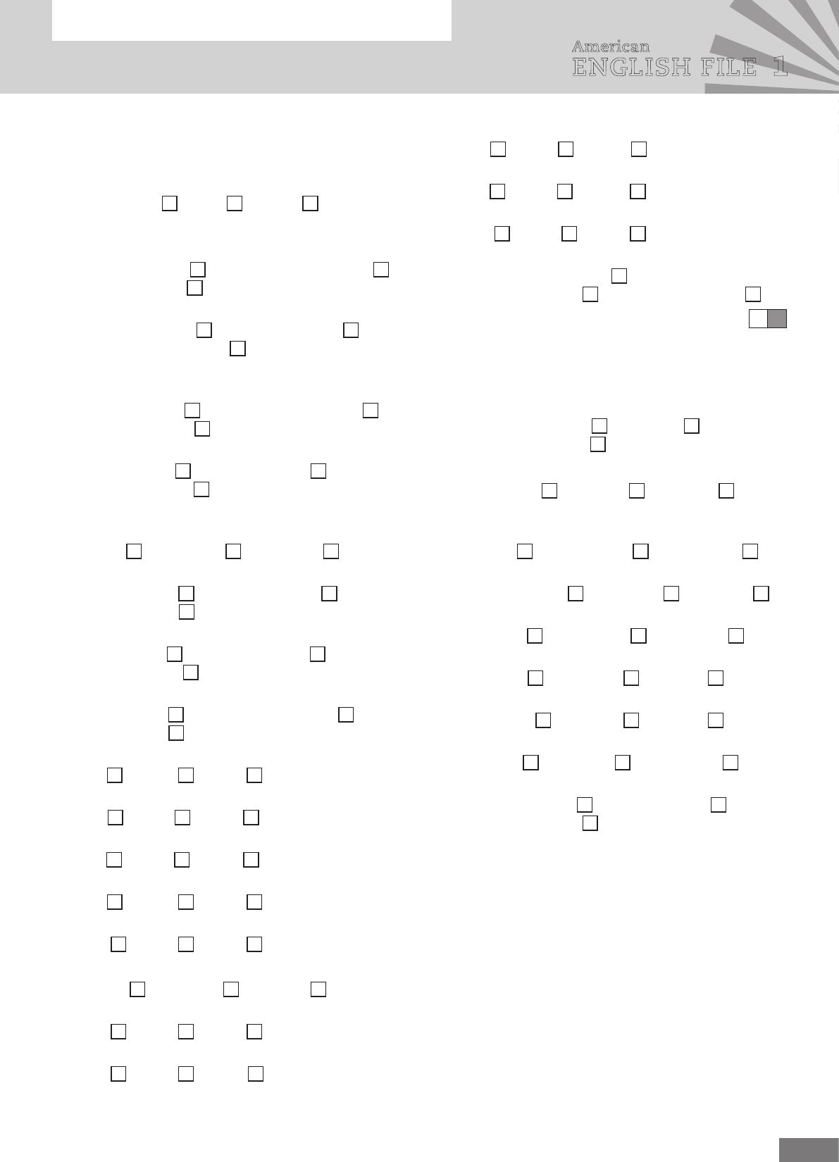 1 NAME CLASS 4 Quick Test American English File 1 Photocopiable © Oxford University Press 2013 American ENGLISH FILE 1 17 What do you usually do _____the weekend? A in ■ B to ■ C on ■ 18 I only drink coffee _____ the morning. A at ■ B in ■ C on ■ 19 I work in a bar _____ Saturday evenings. A on ■ B in ■ C at ■ 20 This is _____. A the end of the exercise ■ B the exercise’s end ■ C the end’s exercise ■ 20 VOCABULARY a Check (✓) A, B, or C to complete the sentences. Example: My grandmother’s son is my _____. A nephew ■ B father ■✓ C brother ■ 1 My mother’s son is my _____. A brother ■ B niece ■ C uncle ■ 2 My sister got married last year. Her _____ is a lawyer. A son ■ B boyfriend ■ C husband ■ 3 My mother’s father is my _____. A grandfather ■ B cousin ■ C uncle ■ 4 My sister’s son is my _____. A niece ■ B nephew ■ C cousin ■ 5 My father’s brother is my _____. A uncle ■ B cousin ■ C aunt ■ 6 My mother’s sister is my _____. A cousin ■ B uncle ■ C aunt ■ 7 My son and daughter are my _____. A sons ■ B childs ■ C children ■ 8 My grandfather and grandmother are my _____. A grandparents ■ B grandfathers ■ C grandchildren ■ GRAMMAR Check (✓) A, B, or C to complete the sentences. Example: My name _____ Robert. A am ■ B is ■✓ C are ■ 1 A Who’s that boy? B _____. A Helen’s brother ■ B The brother of Helen ■ C Helens brother ■ 2 Is that _____? A your parents’ car ■ B your parent car ■ C the car of your parents ■ 3 A Whose shoes are these? B _____. A They’re Henry ■ B They’re from Henry ■ C They’re Henry’s ■ 4 What time _____? A get you home ■ B you get home ■ C do you get home ■ 5 A _____ laptop is this? B It’s Daniela’s. A Who ■ B Whose ■ C Who’s ■ 6 _____ to bed late. A We usually go ■ B We usually are ■ C We go usually ■ 7 My girlfriend is angry with me. _____. A I always late ■ B I’m late always ■ C I’m always late ■ 8 He _____ on Saturdays. A never works ■ B doesn’t never work ■ C works never ■ 9 I never study _____the evening. A in ■ B on ■ C at ■ 10 All my family goes home _____Christmas. A to ■ B in ■ C at ■ 11 What time does she go _____ school? A at ■ B to ■ C in ■ 12 I sometimes have lunch _____ my office. A in ■ B on ■ C at ■ 13 Our daughter always wakes up _____ 5:30. A on ■ B in ■ C at ■ 14 _____ time do you get up in the morning? A What ■ B When ■ C How ■ 15 My wife is a doctor. She often works _____ night. A on ■ B in ■ C at ■ 16 Her daughters are _____ college. A on ■ B in ■ C to ■ 2 NAME CLASS 4 Quick Test American English File 1 Photocopiable © Oxford University Press 2013 American ENGLISH FILE 1 PRONUNCIATION a Which word has a different sound? Check (✓) A, B, or C. Example: A am ■ B thanks ■ C car ■✓ 1 A doctor ■ B No ■ C Scotland ■ 2 A young ■ B come ■ C model ■ 3 A aunt ■ B cousin ■ C son ■ 4 A twice ■ B wife ■ C niece ■ 5 A family ■ B hardly ■ C father ■ b Which is the stressed syllable? Check (✓) A, B, or C. Example: A computer ■✓ B computer ■ C computer ■ 6 A restaurant ■ B restaurant ■ C restaurant ■ 7 A grandparents ■ B grandparents ■ C grandparents ■ 8 A exercise ■ B exercise ■ C exercise ■ 9 A customer ■ B customer ■ C customer ■ 10 A usually ■ B usually ■ C usually ■ 10 Grammar, Vocabulary, and Pronunciation total 50 b Check (✓) A, B, or C to complete the sentences. Example: My sister’s birthday is _____ December 14. A in ■ B on ■✓ C at ■ 9 I take my dog for a walk _____ a day. A two ■ B twice ■ C every ■ 10 We have pizza for dinner _____. A once a week ■ B one week ■ C one a week ■ 11 A What’s the time? B _____. A It’s four and thirty ■ B It’s four thirty ■ C It’s four after thirty ■ 12 I never _____ breakfast in the morning. A do ■ B take ■ C have ■ 13 I often _____ shopping in town. A go ■ B have ■ C take ■ 14 I’m very healthy. I’m hardly _____ sick. A ever ■ B never ■ C always ■ 15 _____ your homework before you go to bed. A Have ■ B Make ■ C Do ■ 16 He always wakes _____ two or three times at night. A up ■ B at ■ C on ■ 17 When the class finishes I ____ home. A make ■ B go ■ C leave ■ 18 My parents never _____ TV. A start ■ B do ■ C watch ■ 19 I get up early _____ day. A every ■ B all ■ C once ■ 20 They go on vacation three _____ a year. A times ■ B time ■ C day ■ 20