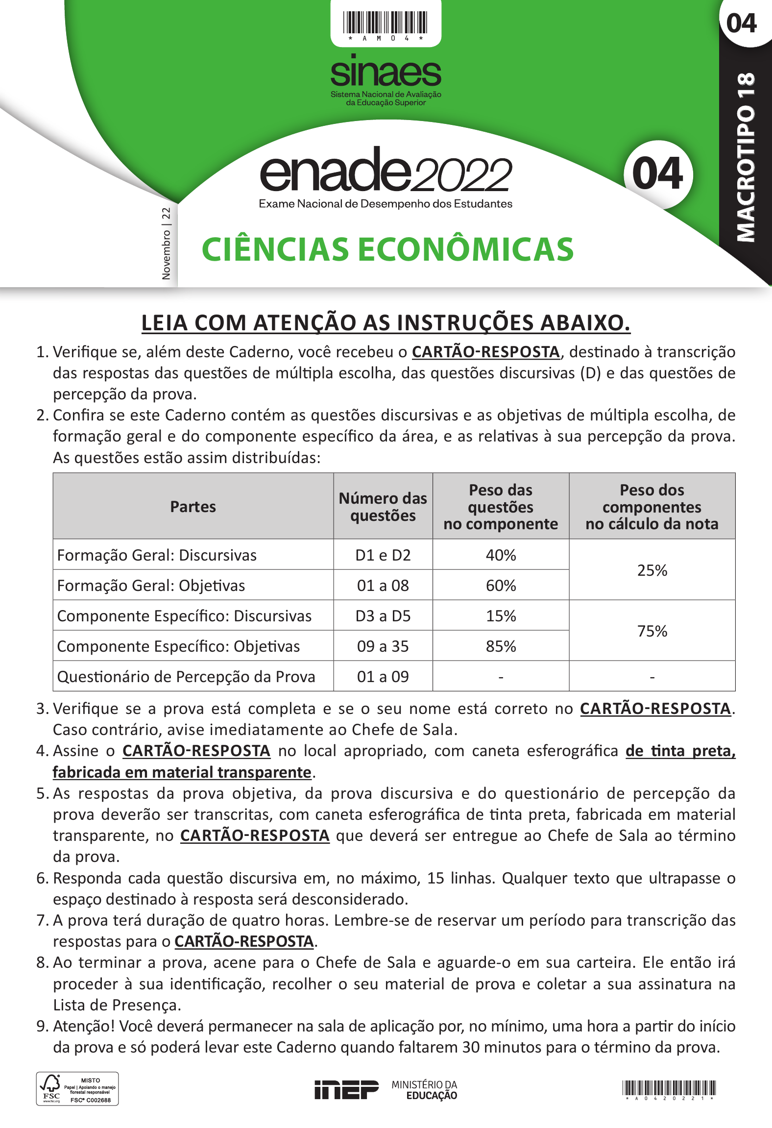 M A CR O TI PO 1 8 04 CIênCIAs ECOnôMICAs N ov em br o | 22 04*AM04* LEIA COM ATENÇÃO AS INSTRUÇÕES ABAIXO. 1. Verifique se, além deste Caderno, você recebeu o CArTÃo-reSPoSTA, destinado à transcrição das respostas das questões de múltipla escolha, das questões discursivas (D) e das questões de percepção da prova. 2. Confira se este Caderno contém as questões discursivas e as objetivas de múltipla escolha, de formação geral e do componente específico da área, e as relativas à sua percepção da prova. As questões estão assim distribuídas: Partes Número das questões Peso das questões no componente Peso dos componentes no cálculo da nota Formação Geral: Discursivas D1 e D2 40% 25% Formação Geral: Objetivas 01 a 08 60% Componente Específico: Discursivas D3 a D5 15% 75% Componente Específico: Objetivas 09 a 35 85% Questionário de Percepção da Prova 01 a 09 - - 3. Verifique se a prova está completa e se o seu nome está correto no CArTÃo-reSPoSTA. Caso contrário, avise imediatamente ao Chefe de Sala. 4. Assine o CArTÃo-reSPoSTA no local apropriado, com caneta esferográfica de tinta preta, fabricada em material transparente. 5. As respostas da prova objetiva, da prova discursiva e do questionário de percepção da prova deverão ser transcritas, com caneta esferográfica de tinta preta, fabricada em material transparente, no CArTÃo-reSPoSTA que deverá ser entregue ao Chefe de Sala ao término da prova. 6. Responda cada questão discursiva em, no máximo, 15 linhas. Qualquer texto que ultrapasse o espaço destinado à resposta será desconsiderado. 7. A prova terá duração de quatro horas. Lembre-se de reservar um período para transcrição das respostas para o CArTÃo-reSPoSTA. 8. Ao terminar a prova, acene para o Chefe de Sala e aguarde-o em sua carteira. Ele então irá proceder à sua identificação, recolher o seu material de prova e coletar a sua assinatura na Lista de Presença. 9. Atenção! Você deverá permanecer na sala de aplicação por, no mínimo, uma hora a partir do início da prova e só poderá levar este Caderno quando faltarem 30 minutos para o término da prova. *A0420221* creo 2 Ciências Econômicas FORMAÇÃO GERAL 2 MATÉRIA QUESTÃO DISCURSIVA 01 TEXTO 1 A Fiocruz é uma instituição de ciência, saúde e educação, vinculada ao Ministério da Saúde, que completou 120 anos. Com várias ações de pesquisa, de desenvolvimento de tecnologias, de produção de vacinas e medicamentos, a Fiocruz se dedica a enfrentar grandes desafios sanitários. Seu trabalho é fundamental para pensarmos em um país com mais justiça e equidade. Disponível em: htt ps: //www.anped.org.br/News/sbpc-divulga-manifesto-em-defesa-da- educação-da-ciencia-eda-democracia. Acesso em: 8 ago. 2022 (adaptado). TEXTO 2 Com a pandemia do novo coronavírus, intensifi caram-se as difi culdades e limitações fí sicas, orçamentárias e estruturais para a pesquisa cientí fi ca. Durante o período de isolamento social, com o fechamento das salas de aula e dos laboratórios, as universidades, com seus professores, acadêmicos e funcionários, precisaram se reinventar. O fazer ciência é um processo complexo que envolve pesquisadores, acadêmicos, estrutura fí sica, horas de dedicação, testes, erros e acertos. Muitas vezes, é preciso também recomeçar, buscar novas metodologias, olhar o resultado por outro viés e reaprender a ler o que se descobriu. Por tudo isso, a pesquisa não é algo que se faz da noite para o dia, e produzi-la é ainda mais desafi ador. Disponível em: htt ps://www.upf.br. Acesso em: 6 jun. 2022 (adaptado). TEXTO 3 A tabela a seguir apresenta a variação do orçamento federal nos anos de 2020 e 2021. Pasta orçamento Federal em 2021 (em bilhões de r$) Variação (2020 - 2021) Agricultura 10,42 - 0,2% Cidadania 103,9 + 22,1% Ciência, Tecnologia e Inovações 8,36 - 28,7% Defesa 65,33 - 9,8% Desenvolvimento Regional 10,68 + 23,6% Economia 569,49 - 4,6% Educação 74,56 - 27,1% Infraestrutura 17,29 - 8,1% Justi ça e Segurança Pública 11,46 - 11,7% Meio Ambiente 2 - 25,1% Minas e Energia 8,94 + 44,2% Mulher, Família e Direitos Humanos 0,52 + 44,4% Relações Exteriores 1,97 - 17,2% Saúde 136,23 + 4,8% Turismo 1,73 - 5,5% PLOA – PLN 28/2020, com as alterações do Congresso Nacional e Consultoria de Orçamento do Senado Federal. Agência Senado. FORMAÇÃO GERAL *2* 3MATÉRIA Com base nas informações dos textos e da tabela apresentados e considerando o contexto da pandemia de Covid-19, faça o que se pede nos itens a seguir. a) Discuta por que os investi mentos públicos em educação, ciência, tecnologia e inovação são estratégicos e contribuem para o desenvolvimento cientí fi co de um país. (valor: 5,0 pontos) b) Explique como o fomento público ao desenvolvimento cientí fi co pode atender à justi ça social e à equidade, em contextos como o da pandemia de Covid-19. (valor: 5,0 pontos) RASCUNHO 1 2 3 4 5 6 7 8 9 10 11 12 13 14 15 Área livre *3**A0420222* 3Ciências Econômicas2 MATÉRIA QUESTÃO DISCURSIVA 01 TEXTO 1 A Fiocruz é uma instituição de ciência, saúde e educação, vinculada ao Ministério da Saúde, que completou 120 anos. Com várias ações de pesquisa, de desenvolvimento de tecnologias, de produção de vacinas e medicamentos, a Fiocruz se dedica a enfrentar grandes desafios sanitários. Seu trabalho é fundamental para pensarmos em um país com mais justiça e equidade. Disponível em: htt ps: //www.anped.org.br/News/sbpc-divulga-manifesto-em-defesa-da- educação-da-ciencia-eda-democracia. Acesso em: 8 ago. 2022 (adaptado). TEXTO 2 Com a pandemia do novo coronavírus, intensifi caram-se as difi culdades e limitações fí sicas, orçamentárias e estruturais para a pesquisa cientí fi ca. Durante o período de isolamento social, com o fechamento das salas de aula e dos laboratórios, as universidades, com seus professores, acadêmicos e funcionários, precisaram se reinventar. 