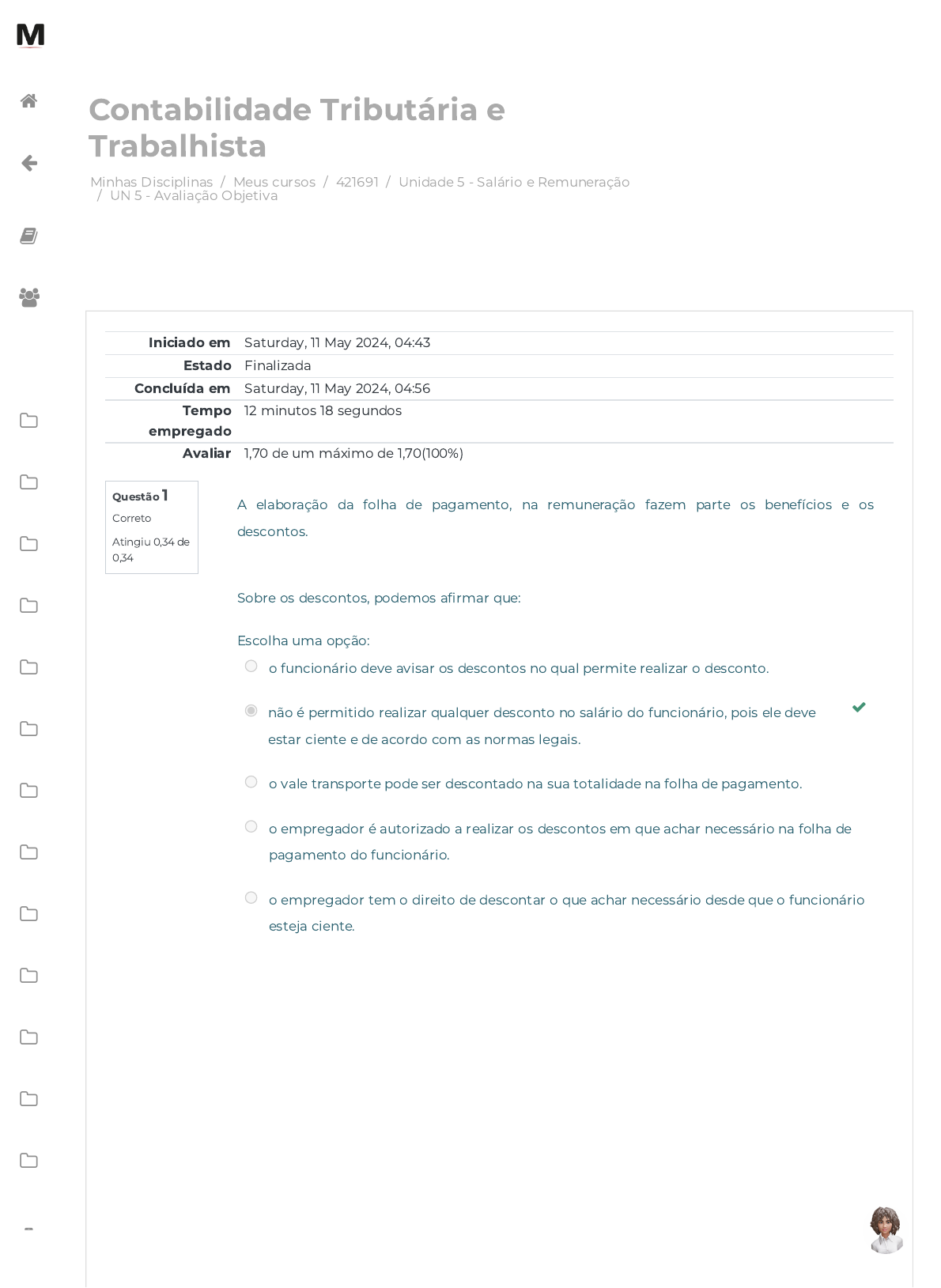 Minhas Disciplinas / Meus cursos / 421691 / Unidade 5 - Salário e Remuneração / UN 5 - Avaliação Objetiva Contabilidade Tributária e Trabalhista Questão 1 Correto Atingiu 0,34 de 0,34 Iniciado em Saturday, 11 May 2024, 04:43 Estado Finalizada Concluída em Saturday, 11 May 2024, 04:56 Tempo empregado 12 minutos 18 segundos Avaliar 1,70 de um máximo de 1,70(100%) A elaboração da folha de pagamento, na remuneração fazem parte os benefícios e os descontos. Sobre os descontos, podemos a�rmar que: Escolha uma opção: o funcionário deve avisar os descontos no qual permite realizar o desconto. não é permitido realizar qualquer desconto no salário do funcionário, pois ele deve estar ciente e de acordo com as normas legais. o vale transporte pode ser descontado na sua totalidade na folha de pagamento. o empregador é autorizado a realizar os descontos em que achar necessário na folha de pagamento do funcionário. o empregador tem o direito de descontar o que achar necessário desde que o funcionário esteja ciente. https://avap.multivix.edu.br/my/ https://avap.multivix.edu.br/course/view.php?id=26329 https://avap.multivix.edu.br/course/view.php?id=26329§ion=6 https://avap.multivix.edu.br/mod/quiz/view.php?id=1636888 https://avap.multivix.edu.br/my/ https://avap.multivix.edu.br/course/view.php?id=26329 https://avap.multivix.edu.br/user/index.php?id=26329 https://avap.multivix.edu.br/course/view.php?id=26329§ion=1 https://avap.multivix.edu.br/course/view.php?id=26329§ion=2 https://avap.multivix.edu.br/course/view.php?id=26329§ion=3 https://avap.multivix.edu.br/course/view.php?id=26329§ion=4 https://avap.multivix.edu.br/course/view.php?id=26329§ion=5 https://avap.multivix.edu.br/course/view.php?id=26329§ion=6 https://avap.multivix.edu.br/course/view.php?id=26329§ion=7 https://avap.multivix.edu.br/course/view.php?id=26329§ion=8 https://avap.multivix.edu.br/course/view.php?id=26329§ion=9 https://avap.multivix.edu.br/course/view.php?id=26329§ion=10 https://avap.multivix.edu.br/course/view.php?id=26329§ion=11 https://avap.multivix.edu.br/course/view.php?id=26329§ion=12 https://avap.multivix.edu.br/course/view.php?id=26329§ion=13 https://avap.multivix.edu.br/hooks/portal/ https://avap.multivix.edu.br/mod/page/view.php?id=1252%2F%22%20target%3D%22_blank https://avap.multivix.edu.br/ https://avap.multivix.edu.br/ https://avap.multivix.edu.br/ https://avap.multivix.edu.br/ https://avap.multivix.edu.br/ Questão 2 Correto Atingiu 0,34 de 0,34 Sobre os proventos que fazem parte da remuneração, além do salário base, podemos citar: Escolha uma opção: Vale transporte. Convênio de saúde. Hora extra. INSS. https://avap.multivix.edu.br/my/ https://avap.multivix.edu.br/course/view.php?id=26329 https://avap.multivix.edu.br/user/index.php?id=26329 https://avap.multivix.edu.br/course/view.php?id=26329§ion=1 https://avap.multivix.edu.br/course/view.php?id=26329§ion=2 https://avap.multivix.edu.br/course/view.php?id=26329§ion=3 https://avap.multivix.edu.br/course/view.php?id=26329§ion=4 https://avap.multivix.edu.br/course/view.php?id=26329§ion=5 https://avap.multivix.edu.br/course/view.php?id=26329§ion=6 https://avap.multivix.edu.br/course/view.php?id=26329§ion=7 https://avap.multivix.edu.br/course/view.php?id=26329§ion=8 https://avap.multivix.edu.br/course/view.php?id=26329§ion=9 https://avap.multivix.edu.br/course/view.php?id=26329§ion=10 https://avap.multivix.edu.br/course/view.php?id=26329§ion=11 https://avap.multivix.edu.br/course/view.php?id=26329§ion=12 https://avap.multivix.edu.br/course/view.php?id=26329§ion=13 https://avap.multivix.edu.br/hooks/portal/ https://avap.multivix.edu.br/mod/page/view.php?id=1252%2F%22%20target%3D%22_blank https://avap.multivix.edu.br/ https://avap.multivix.edu.br/ https://avap.multivix.edu.br/ https://avap.multivix.edu.br/ https://avap.multivix.edu.br/ Questão 3 Correto Atingiu 0,34 de 0,34 Questão 4 Correto Atingiu 0,34 de 0,34 Questão 5 Correto Atingiu 0,34 de 0,34 Desconto farmácia. É muito comum muitos confundirem salário e remuneração. Sobre a diferenciação entre eles, podemos a�rmar que: Escolha uma opção: salário é o salário base somados aos benefícios. salário é o somatório dos benefícios e remuneração é o salário reduzido dos descontos. salário e remuneração são considerados todas as somas dos rendimentos. salário é o somatório dos rendimentos e remuneração é o valor base. salário é conhecido como salário base e a remuneração é o somatório de todos os rendimentos. A folha de pagamento é formada por vários proventos e descontos. De todos os proventos, conceitua-se salário: Escolha uma opção: o valor acordado entre empregado e empregador pela prestação de serviços. todos os rendimentos recebidos pelo empregador no período de 30 dias. o valor dos serviços prestados somados aos benefícios. todos os benefícios deduzidos com os descontos. o pagamento da prestação de serviço na sua totalidade. A remuneração engloba o salário. Sobre o conceito de remuneração, podemos a�rmar que: Escolha uma opção: é o valor do salário base deduzido os descontos. é o mesmo valor do salário. é o valor do salário deduzido os benefícios. é o valor de todos os rendimentos deduzidos os descontos. é o valor do salário somado aos benefícios. https://avap.multivix.edu.br/my/ https://avap.multivix.edu.br/course/view.php?id=26329 https://avap.multivix.edu.br/user/index.php?id=26329 https://avap.multivix.edu.br/course/view.php?id=26329§ion=1 https://avap.multivix.edu.br/course/view.php?id=26329§ion=2 https://avap.multivix.edu.br/course/view.php?id=26329§ion=3 https://avap.multivix.edu.br/course/view.php?id=26329§ion=4 https://avap.multivix.edu.br/course/view.php?id=26329§ion=5 https://avap.multivix.edu.br/course/view.php?id=26329§ion=6 https://avap.multivix.edu.br/course/view.php?id=26329§ion=7 https://avap.multivix.edu.br/course/view.php?id=26329§ion=8 https://avap.multi