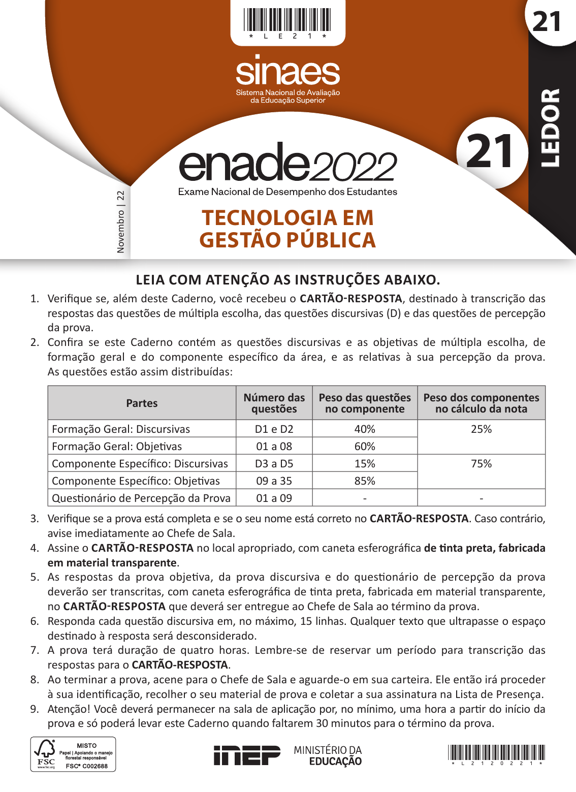 LE D O R 21 TEcnOLOgia Em gEsTãO PúbLicaN ov em br o | 22 21*LE21* LEIA COM ATENÇÃO AS INSTRUÇÕES ABAIXO. 1. Verifique se, além deste Caderno, você recebeu o CArTÃo-reSPoSTA, destinado à transcrição das respostas das questões de múltipla escolha, das questões discursivas (D) e das questões de percepção da prova. 2. Confira se este Caderno contém as questões discursivas e as objetivas de múltipla escolha, de formação geral e do componente específico da área, e as relativas à sua percepção da prova. As questões estão assim distribuídas: Partes Número das questões Peso das questões no componente Peso dos componentes no cálculo da nota Formação Geral: Discursivas D1 e D2 40% 25% Formação Geral: Objetivas 01 a 08 60% Componente Específico: Discursivas D3 a D5 15% 75% Componente Específico: Objetivas 09 a 35 85% Questionário de Percepção da Prova 01 a 09 - - 3. Verifique se a prova está completa e se o seu nome está correto no CArTÃo-reSPoSTA. Caso contrário, avise imediatamente ao Chefe de Sala. 4. Assine o CArTÃo-reSPoSTA no local apropriado, com caneta esferográfica de tinta preta, fabricada em material transparente. 5. As respostas da prova objetiva, da prova discursiva e do questionário de percepção da prova deverão ser transcritas, com caneta esferográfica de tinta preta, fabricada em material transparente, no CArTÃo-reSPoSTA que deverá ser entregue ao Chefe de Sala ao término da prova. 6. Responda cada questão discursiva em, no máximo, 15 linhas. Qualquer texto que ultrapasse o espaço destinado à resposta será desconsiderado. 7. A prova terá duração de quatro horas. Lembre-se de reservar um período para transcrição das respostas para o CArTÃo-reSPoSTA. 8. Ao terminar a prova, acene para o Chefe de Sala e aguarde-o em sua carteira. Ele então irá proceder à sua identificação, recolher o seu material de prova e coletar a sua assinatura na Lista de Presença. 9. Atenção! Você deverá permanecer na sala de aplicação por, no mínimo, uma hora a partir do início da prova e só poderá levar este Caderno quando faltarem 30 minutos para o término da prova. *L2120221* creo 2 Tecnologia em Gestão Pública FORMAÇÃO GERAL 2 MATÉRIA QUESTÃO DISCURSIVA 01 TEXTO 1 A Fiocruz é uma insti tuição de ciência, saúde e educação, vinculada ao Ministério da Saúde, que completou 120 anos. Com várias ações de pesquisa, de desenvolvimento de tecnologias, de produção de vacinas e medicamentos, a Fiocruz se dedica a enfrentar grandes desafi os sanitários. Seu trabalho é fundamental para pensarmos em um país com mais justi ça e equidade. Disponível no site da anped.org . Acesso em: 8 ago. 2022 (adaptado). TEXTO 2 Com a pandemia do novo coronavírus, intensifi caram-se as difi culdades e limitações fí sicas, orçamentárias e estruturais para a pesquisa cientí fi ca. Durante o período de isolamento social, com o fechamento das salas de aula e dos laboratórios, as universidades, com seus professores, acadêmicos e funcionários, precisaram se reinventar. O fazer ciência é um processo complexo que envolve pesquisadores, acadêmicos, estrutura fí sica, horas de dedicação, testes, erros e acertos. Muitas vezes, é preciso também recomeçar, buscar novas metodologias, olhar o resultado por outro viés e reaprender a ler o que se descobriu. Por tudo isso, a pesquisa não é algo que se faz da noite para o dia, e produzi-la é ainda mais desafi ador. Disponível no site da UPF. Acesso em: 6 jun. 2022 (adaptado). TEXTO 3 A tabela a seguir apresenta a variação do orçamento federal nos anos de 2020 e 2021. Descrição da Tabela: As pastas que apresentaram variação de orçamento positi va foram as seguintes: • Cidadania (+22,1%); • Desenvolvimento Regional (+23,6%); • Minas e Energia (+44,2%); • Mulher, Família e Direitos Humanos (+44,4%); • Saúde (+4,8%). Já as de variação negati va são as seguintes pastas: • Agricultura (-0,2%); • Ciência, Tecnologia e Inovações (-28,7%); • Defesa (-9,8%); • Economia (-4,6%); • Educação (-27,1%); • Infraestrutura (-8,1%); • Justi ça e Segurança Pública (-11,7%); • Meio Ambiente (-25,1%); • Relações Exteriores (-17,2%); • Turismo (-5,5%). Fonte do Texto: PLOA – PLN 28/2020, com as alterações do Congresso Nacional e Consultoria de Orçamento do Senado Federal. FORMAÇÃO GERAL *2* 3MATÉRIA Com base nas informações dos textos e da tabela apresentados e considerando o contexto da pandemia de Covid-19, faça o que se pede nos itens a seguir. a) Discuta por que os investi mentos públicos em educação, ciência, tecnologia e inovação são estratégicos e contribuem para o desenvolvimento cientí fi co de um país. (valor: 5,0 pontos) b) Explique como o fomento público ao desenvolvimento cientí fi co pode atender à justi ça social e à equidade, em contextos como o da pandemia de Covid-19. (valor: 5,0 pontos) RASCUNHO 1 2 3 4 5 6 7 8 9 10 11 12 13 14 15 Área livre *3**L2120222* 3Tecnologia em Gestão Pública2 MATÉRIA QUESTÃO DISCURSIVA 01 TEXTO 1 A Fiocruz é uma insti tuição de ciência, saúde e educação, vinculada ao Ministério da Saúde, que completou 120 anos. Com várias ações de pesquisa, de desenvolvimento de tecnologias, de produção de vacinas e medicamentos, a Fiocruz se dedica a enfrentar grandes desafi os sanitários. Seu trabalho é fundamental para pensarmos em um país com mais justi ça e equidade. Disponível no site da anped.org . Acesso em: 8 ago. 2022 (adaptado). TEXTO 2 Com a pandemia do novo coronavírus, intensifi caram-se as difi culdades e limitações fí sicas, orçamentárias e estruturais para a pesquisa cientí fi ca. Durante o período de isolamento social, com o fechamento das salas de aula e dos laboratórios, as universidades, com seus professores, acadêmicos e funcionários, precisaram se reinventar. O fazer ciência é um processo complexo que envolve pesquisadores, acad