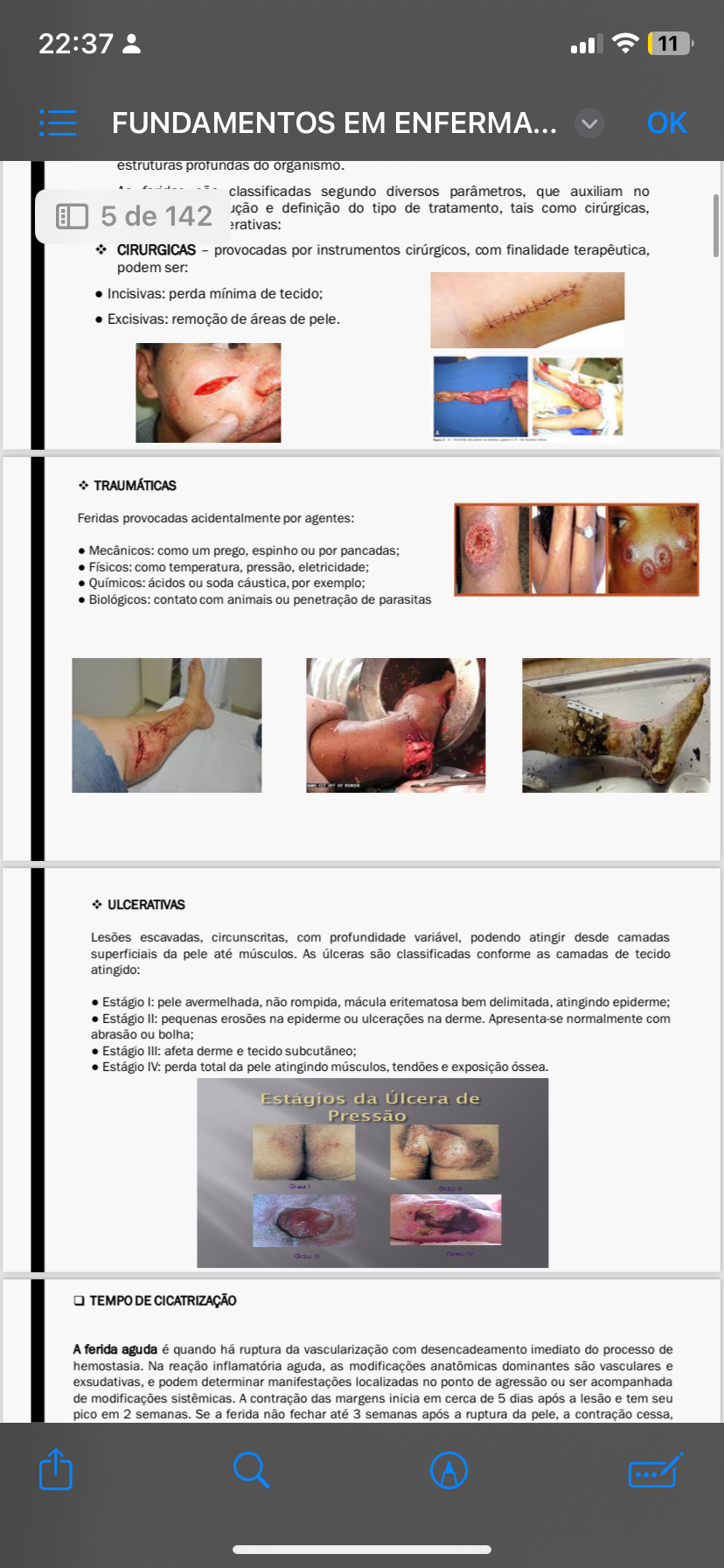 22:37 11 FUNDAMENTOS EM ENFERMA. OK estruturas profundas do organismo. classificadas segundo diversos parâmetros, que auxiliam no 5 de 142 e definição do tipo de tratamento, tais como cirúrgicas, erativas: CIRURGICAS - provocadas por instrumentos cirúrgicos, com finalidade terapêutica, podem ser: Incisivas: perda mínima de tecido; Excisivas: remoção de áreas de pele. TRAUMÁTICAS Feridas provocadas acidentalmente por agentes: Mecânicos: como um prego, espinho ou por pancadas; Físicos: como temperatura, pressão, eletricidade; Químicos: ácidos ou soda cáustica, por exemplo; Biológicos: contato com animais ou penetração de parasitas ULCERATIVAS Lesões escavadas, circunscritas, com profundidade variável, podendo atingir desde camadas superficiais da pele até músculos. As úlceras são classificadas conforme as camadas de tecido atingido: Estágio I: pele avermelhada, não rompida, mácula eritematosa bem delimitada, atingindo epiderme; Estágio II: pequenas erosões na epiderme ou ulcerações na derme. Apresenta-se normalmente com abrasão ou bolha; Estágio III: afeta derme e tecido Estágio IV: perda total da pele atingindo tendões e exposição Estágios da Úlcera de Pressão TEMPO DE CICATRIZAÇÃO A ferida aguda é quando há ruptura da vascularização com desencadeamento imediato do processo de hemostasia. Na reação inflamatória aguda, as modificações anatômicas dominantes são vasculares e exsudativas, e podem determinar manifestações localizadas no ponto de agressão ou ser acompanhada de modificações sistêmicas. A contração das margens inicia em cerca de 5 dias após a lesão e tem seu pico em 2 semanas. Se a ferida não fechar até 3 semanas após a ruptura da pele, a contração cessa,