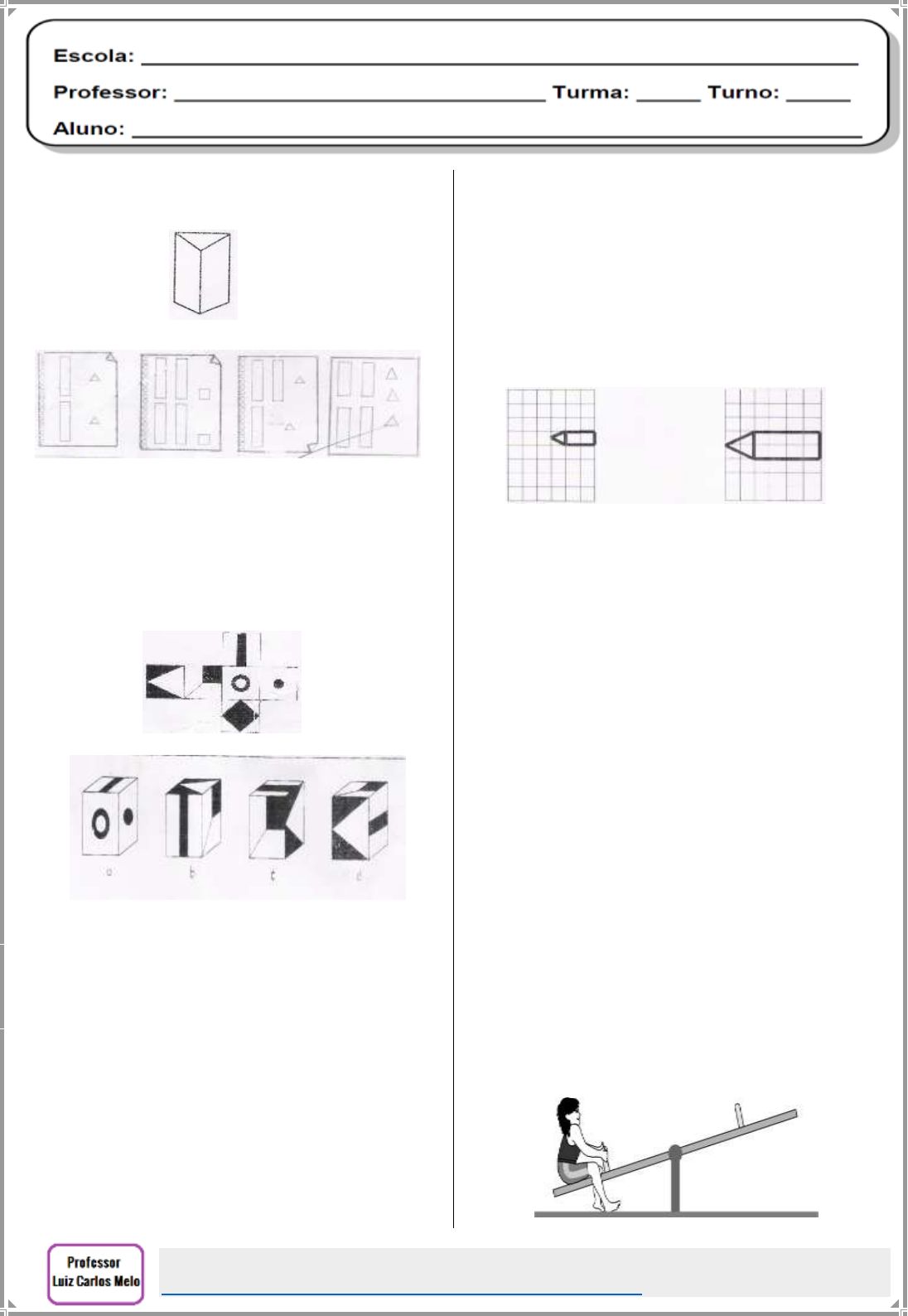 Matemática Séries Iniciais: http://desafiosmate.com.br/material-professor-4-e-5-ano 1. Em qual das folhas abaixo foi desenhado todas as faces deste prisma? a) b) c) d) 2. Veja o molde de um cubo. Dos itens abaixo, qual representa o mesmo cubo depois de fechado? a) A b) D c) B d) C 3. Observe a planta da casa da tia Drica: Olhando de frente para a planta, o quarto da tia Drica é o: a) Primeiro à direita da sala b) Segundo a direita da sala. c) Terceiro à direita da sala. d) Primeiro à esquerda da sala. 4. O lápis (2) é ampliação do lápis (1). I II Quantas vezes a área do lápis (2) é maior do que o lápis (1)? a) 1 vez b) 2 vezes c) 6 vezes d) 12 vezes 5. Entre os dias 22 e 31 de dezembro de 2005, passaram pelos pedágios de uma rodovia, em direção ao litoral, setecentos e três mil, quatrocentos e vinte e quatro veículos. Esse número equivale a a) 73.424 veículos. b) 703.424 veículos. c) 7.003.424 veículos. d) 7.324 veículos. 6. (D8) Para chegar à cidade de Natal um ônibus demora 3 dias. Quantas horas ele demora? a) 2 horas. b) 12 horas. c) 72 horas. d) 48 horas. 7. (D2) Observe a figura abaixo. http://desafiosmate.com.br/material-professor-4-e-5-ano Matemática Séries Iniciais: http://desafiosmate.com.br/material-professor-4-e-5-ano Um dos pesos indicados abaixo, colocado no outro extremo do balanço, equilibra o menino. Que peso poderá ser? a) um peso de 30 g b) um peso de 30 kg c) um peso de 300 mg d) um peso de 3000 g 8. (D3) João contou 3 quadrados na figura A. Quantos quadrados há na figura B? a) 5 b) 6 c) 3 d) 4 9. (D16) Edna recebeu em sua sala 4 caixas de 100 livros, mais 5 caixas de 1000 cadernos e 3 caixas de lápis. Edna recebeu a) 4550 materiais b) 4500 materiais c) 5500 materiais d) 5550 materiais 10. (D19) Em um sítio havia 425 árvores frutíferas. Com o inverno, um cento dessas árvores caíram. Quantas árvores restaram? a) 325 b) 352 c) 253 d) 420 11. (D26) A turma da professora Márcia, no mês de março, obteve 50% de PARA CASA NÃO - FEITOS. Sabendo-se que a turma tem 36 alunos, quantos deixaram de fazer o PARA CASA? a) 18 b) 9 c) 24 d) 26 12. (D4) As figuras mostram o início da formação de um padrão. Se continuasse o padrão, quantos quadrados pequenos haveria na figura seguinte? a) 20 b) 25 c) 10 d) 5 13. (D24) João abriu um pacote de pão de forma que tinha 8 fatias. Ele pegou 2 fatias para fazer um sanduíche. Que fração do pão ele pegou? a) 1 8 b) 2 8 c) 3 7 d) 8 14. (D15) Quantas centenas existem em 1942 unidades? a) 9 b) 19 c) 90 d) 29 15. (D17) Em uma escola há 840 alunos. Foram transferidos 123 alunos e foram matriculados mais 20 alunos. A escola ficou com quantos alunos? a) 465 b) 537 c) 737 d) 730 16. (D19) Observe as ofertas desta loja. Qual o desconto que a loja dá na compra de uma bicicleta para crianças? a) seis reais b) sete reais c) dez reais http://desafiosmate.com.br/material-professor-4-e-5-ano Matemática Séries Iniciais: http://desafiosmate.com.br/material-professor-4-e-5-ano d) quatro reais 17. (D19) Se Paulo comprar uma bicicleta de adulto e uma de criança, quanto vai gastar? a) R$153,00 b) R$213,00 c) R$195,00 d) R$171,00 18. (D8) Observe o calendário dos meses de Maio e de Junho de 2000. O aniversário da Mariana foi na quinta-feira, dia 18 de Maio. O seu irmão Pedro faz anos três semanas mais tarde. Em que data fez anos o Pedro? a) 21 de Maio b) 1º de Junho c) 8 de Junho d) 15 de Junho 19. (D28) Cada um dos alunos da turma do professor José votou no tipo de programa de televisão de que mais gosta. Cada aluno só podia escolher um tipo de programa. O gráfico refere-se aos resultados da votação. Que tipo de programa foi escolhido por mais alunos? a) Notícias b) Músicas c) Desenhos animados d) Filmes de aventura 20. (D8) Uma peça de teatro teve início às 8h00min e encerrou duas horas e 15 minutos depois. Que horas marcava o relógio quando encerrou a peça? a) 10h00min b) 10h15min c) 11h00min d) 11h15min http://desafiosmate.com.br/material-professor-4-e-5-ano