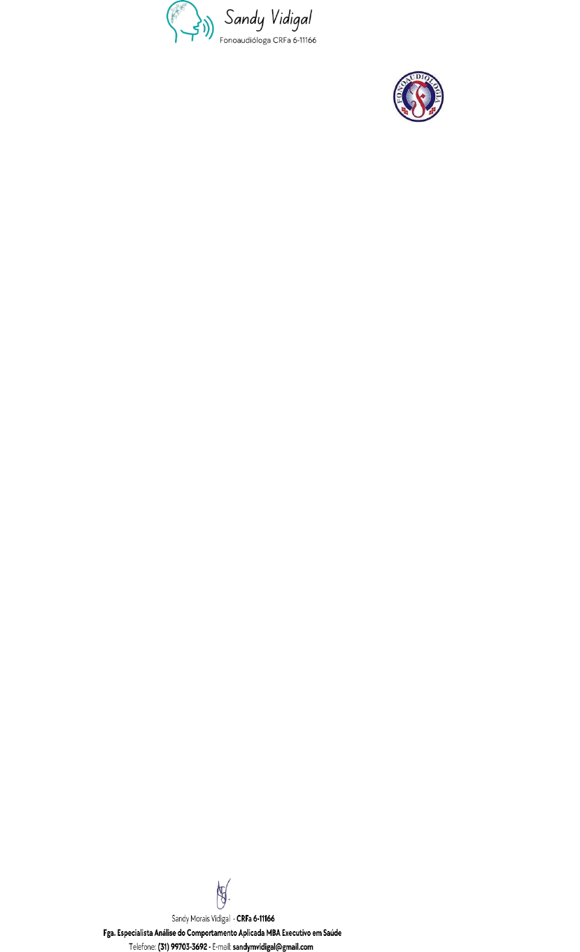 DECLARAÇÃO ALTA FONOAUDIOLÓGICA Declaro para os devidos fins que o paciente Bernardo Machado de Oliveira, Idade: 8 anos e 7 meses se encontra de alta fonoaudiológica. Os atendimentos aconteceram em um horário por dia, 30min/ sessão. Semanal, no espaço Terapias especiais - Unimed. Realizamos atividades com foco em ampliar as habilidades comunicativas, estimulação da fala e linguagem, proporcionando aumento de vocabulário, treino troca de turno. Foi realizado teste de linguagem ABFW e estimulação da linguagem oral, foco em principal queixa dificuldade em produção dos fonemas, testes de cognição com foco em memória e atenção através de atividades de compreensão de leitura (narrada pela terapeuta, como treino de fluência, posteriormente treino de leitura realizada pelo paciente). Foram realizados durante esse período exercícios de reconhecimento, nível de consciência fonológica, teste de consciência fonética, “Ataque de palavras”; aumento considerável do vocabulário e boa interação com a terapeuta. Considero resultados compatível com seu nível intelectual, sendo considerado dentro do padrão de normalidade através de observação direta do comportamento, durante o período terapêutico iniciado 16 de novembro de 2023 , na anamnese fonoaudiologica, estava acompanhado pela mãe, indicação do neuropediatra e da escola, relatório escolar em anexo, iniciou com psicopedagoga há duas semanas, antes de iniciar a intervenção fonoaudiológica, trabalhamos na mesma linha de apoio, mantivemos contato, e trocamos relatórios de evolução do Bernardo. Comorbidades relatadas em anamnese: Paciente com seletividade alimentar severa, por vezes demonstra ansiedade e choro quando fica nervoso e agitado ao não reconhecer silabas na escola, solicitei trazer na próxima sessão caderno de português. O mesmo aconteceu na sessão seguinte, onde o paciente trouxe caderno de portugues, em ótimo estado e muitos exercícios, poucos erros ortográficos, relata que a mãe tem o ajudado nas tarefas, treinamos a escrita tambem durante as sessões. Sugiro portanto, para permanecer em estímulo com foco em habilidades a nível educacional, manter frequência escolar com atividades adequadas ao ano e idade. Paciente está desenvolvendo conceitos de numeral, não confunde ordem numérica e alfabética não há necessidade de apoio visual, não apresenta dificuldades no traçado e na identificação mesmo não sendo necessário o auxílio da terapeuta, necessita por vezes desenvolver percepção visual para realizar a diferenciação dos sons e formato. Paciente recebe bem a ordens e comandos, não questiona a necessidade em realizar as atividades propostas na maioria das sessões, Foi sugerido através de plano terapêutico treino diário exercícios de voz, e hidratação direta e indireta. O desenvolvimento da autonomia está em processo devido a idade de transição, não apresenta insegurança para realizar as atividades propostas, porém é preciso ser firme nos comandos. É importante ressaltar que os itens observados estão relacionados ao desenvolvimento global e sofrem interferência de questões emocionais, sociais, físicas e anatomofuncionais. Dessa forma, as informações deste relatório referem-se ao desempenho atual do Bernardo, podem ser modificados de acordo com a resposta ou ausência de intervenção. Conduta manter treinos diariamente em sua rotina (domiciliar) e seguir orientações que foram ensinadas durante as sessões de terapia. Declaro, para os fins que se fizeram necessários, alta fonoaudiológica na presente data. À disposição para qualquer esclarecimento. Agradeço. Por ser verdade, firmo o presente. Viçosa, 27 de junho de 2024