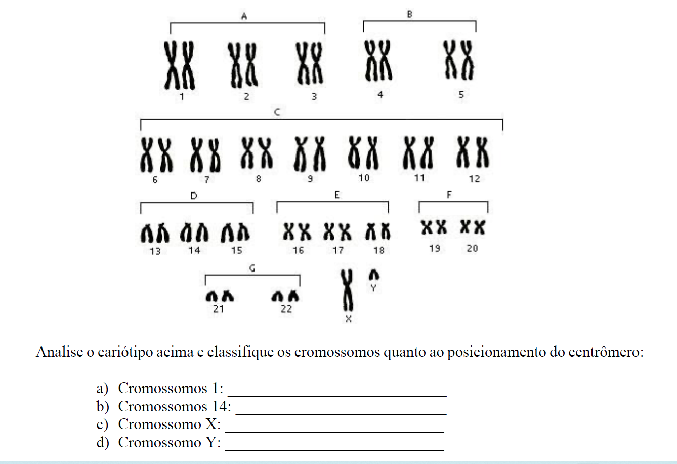 A B XX XX 1 2 3 4 5 C XX XX XX X 6 7 8 9 10 11 12 D E F XX 13 14 15 16 17 18 19 20 G 21 22 X Analise o cariótipo acima e classifique os cromossomos quanto ao posicionamento do centrômero: a) Cromossomos 1: b) Cromossomos 14: c) Cromossomo X: d) Cromossomo Y: