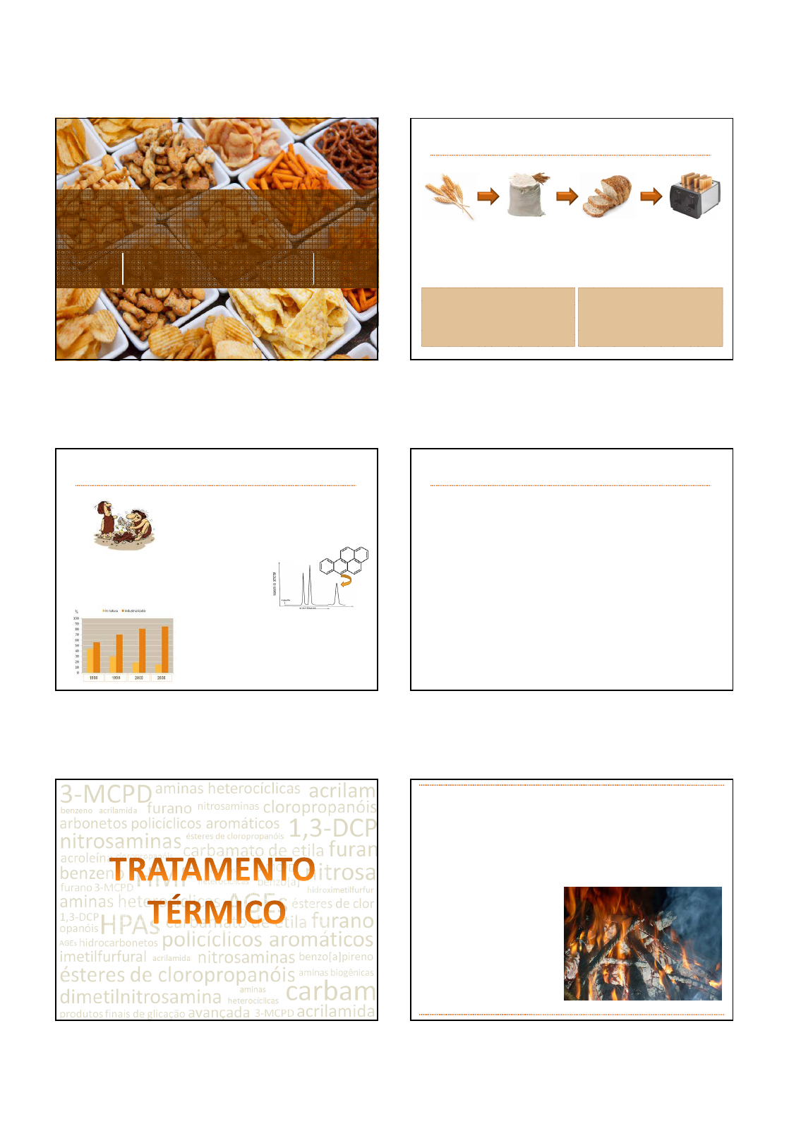 08/11/2017 1 COMPOSTOS TÓXICOS FORMADOS DURANTE O PROCESSAMENTO Profa. Adriana Pavesi Arisseto Bragotto Faculdade de Engenharia de Alimentos – UNICAMP Departamento de Ciência de Alimentos 2017 TA-611 Definição São substâncias indesejáveis, potencialmente tóxicas, que não ocorrem na matéria-prima, mas que estão presentes em alimentos e bebidas como resultado do seu processamento/preparação Formados no alimento, por reações envolvendo precursores naturalmente presentes ou adicionados Formados no processo, contaminando os alimentos nas condições em que são submetidos Presentes na dieta há várias gerações, provavelmente desde a descoberta das primeiras formas de conservação de alimentos (salga, defumação, fogo) Começaram a ser identificados nos alimentos por volta de 1950-1960, com o avanço das técnicas analíticas instrumentais O aumento do consumo de alimentos processados/industrializados tem exigido uma avaliação criteriosa das condições de processamento, de forma a minimizar a ocorrência dessas substâncias Histórico Exemplos Fermentação Uso de aditivos • Aminas biogênicas (histamina, tiramina, putrescina, cadaverina): descarboxilação enzimática de aminoácidos • Nitrosaminas: uso de nitrato/nitrito em produtos cárneos processados • Benzeno: uso de sais de benzoato em refrigerantes Hidrocarbonetos policíclicos aromáticos (HPAs) • Contaminantes ambientais: fontes naturais e antropogênicas • Combustão incompleta de matéria orgânica • Detectados em carne grelhada, defumada e churrasco em 1965 08/11/2017 2 Formação Hidrocarbonetos policíclicos aromáticos Pirólise (400-1000 °C) Pirossíntese Matéria orgânica Estrutura Compostos que contêm dois ou mais anéis aromáticos condensados. Mais de 100 HPAs já foram identificados. Hidrocarbonetos policíclicos aromáticos Fonte: Park & Penning (2009). Toxicidade Hidrocarbonetos policíclicos aromáticos Alta absorção: Lipossolubilidade Ativação metabólica � Roedores: câncer em diversos órgãos (via de administração) � 13 HPAs considerados carcinogênicos e genotóxicos (JECFA, 2005) � IARC: Grupo 1 (1), Grupo 2A (2), Grupo 2B (9), Grupo 3 (1) � Estudos epidemiológicos positivos � Não existem níveis seguros de ingestão HPAs em alimentos Hidrocarbonetos policíclicos aromáticos Churrasco Defumação Secagem HPAs em alimentos Alimentos Benzo[a]pireno (µg/kg) Óleo vegetal 0,41-1,4 (97,2) Chá 3,9 Embutido defumado 0,8 Arenque defumado 1,0 Filé grelhado na brasa 0,8 (54,2) Costela grelhada na brasa 10,5 Hidrocarbonetos policíclicos aromáticos Fonte: Shibamoto & Bjeldanes (2014). • Quantidade de gordura • Tempo e temperatura do processo • Distância entre o alimento e a fonte de calor • Tipo de churrasqueira • Tipo de defumação/secagem (direto ↑) • Tipo de madeira/material a ser queimado (madeiras moles ↑) Fatores importantes: HPAs em alimentos Hidrocarbonetos policíclicos aromáticos Outras fontes: frutas, vegetais, cereais, peixes e frutos do mar (contaminação ambiental), café (torrefação) 08/11/2017 3 Aminas aromáticas heterocíclicas (AAHs) • Descobertas por pesquisadores japoneses em 1977 • Peixes, carnes e frango grelhados/fritos • Mais de 20 compostos já identificados Aminas aromáticas heterocíclicas Pirólise de aminoácidos (> 250 °C) Reação de Maillard (150 - 250 °C) Formação Aminas aromáticas heterocíclicas Pirolíticas Pirólise de aminoácidos individuais ou proteínas (triptofano, ácido glutâmico, fenilalanina, ornitina, globulina, caseína) em T > 250 °C Fonte: Turesky (2009). Aminas aromáticas heterocíclicas Aminoimidazoarenas Reação de Maillard (creatina, aminoácidos livres, hexoses) em T entre 150 - 250 °C Fonte: Turesky (2009). Aminas aromáticas heterocíclicas Toxicidade Fonte: Turesky (2009). � Forte atividade mutagênica (genotoxicidade) in vitro e in vivo � MeIQ, IQ e 8-MeIQx (aminoimidazoarenas) estão entre as mais potentes � Carcinogenicidade: fígado, pulmão, cólon, mama, próstata � Elevado consumo de carnes bem-passadas x câncer � IARC: Grupos 2A e 2B � Não existem níveis seguros de ingestão Aminas aromáticas heterocíclicas AAHs em alimentos Fonte: Turesky (2009). Hambúrguer bovino frito • Tempo • Temperatura 08/11/2017 4 • Método de cozimento (ex: frigideira ↑, churrasco ↑, forno ↓) • Pré-cozimento em micro-ondas (↓ precursores) • “Fundo de frigideira” para molhos • Inibidores: antioxidantes (sintéticos e naturais) • Marinadas (resultados contraditórios) Aminas aromáticas heterocíclicas Outros fatores importantes: AAHs em alimentos Cloropropanóis • Descobertos por pesquisadores tchecos em 1978 • Proteína vegetal hidrolisada (PVH), molho de soja, alimentos processados (cereais), óleos refinados • Encontrados na forma livre ou esterificada com ácidos graxos (ésteres de cloropropanóis) Cloropropanóis Formação Cloropropanóis Formas livres Derivados clorados do glicerol Fonte: Hamlet & Sadd (2009). Cloropropanóis Toxicidade • 3-MCPD • 1,3-DCP: carcinógeno genotóxico Cloropropanóis 3-MCPD em alimentos Matéria-prima Hidrólise Neutralização Filtração DesidrataçãoClarificação HCl 70-135ºC NaOH pH 5 - 9 PVH • Concentrações de até 30 mg/kg já foram reportadas • Tipo de hidrólise (ácida x enzimática) • Tipo de ácido (clorídrico, sulfúrico) • Tempo e temperatura 08/11/2017 5 Cloropropanóis 3-MCPD em alimentos Molho de soja Cloropropanóis Formas esterificadas Cloropropanóis Formas esterificadas Karsulínová, L.; Folprechtová, B.; Dolezal, M.; Dostálová, J.; Velísek, J.; Czech J. Food Sci. 2007, 25, 257. Óleos vegetais refinados Desodorização Cloropropanóis Formas esterificadas https://www.youtube.com/watch?v=ElRzdLJ_XEc Acrilamida • Sólido branco altamente solúvel em água • Descoberta em alimentos por pesquisadores suecos em 2002 • Alimentos fritos, torrados e assad