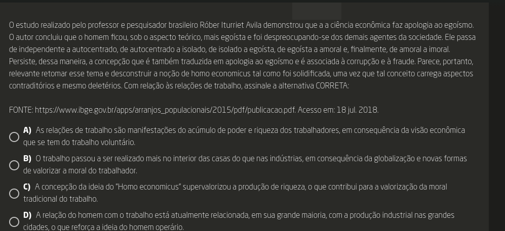0 estudo realizado pelo professor e pesquisador brasileiro Róber Iturriet Avila demonstrou que a a ciência econômica faz apologia ao egoísmo. 0 autor concluiu que homem ficou, sob aspecto teórico, mais e foi despreocupando-se dos demais agentes da sociedade. Ele passa de independente a autocentrado, de autocentrado a isolado, de isolado a egoista, de a amoral e, finalmente, de amoral a imoral. Persiste, dessa maneira, a concepção que é também traduzida em apologia ao egoísmo e é associada à corrupção e à fraude. Parece, portanto, relevante retomar esse tema e desconstruir a noção de homo economicus tal como foi solidificada, uma vez que tal conceito carrega aspectos contraditórios e mesmo deletérios. Com relação às relações de trabalho, assinale a alternativa CORRETA: Acesso em: 18 jul. 2018. A) As relações de trabalho são manifestações do acúmulo de poder e riqueza dos trabalhadores, em da visão econômica que se tem do trabalho voluntário. B) trabalho passou a ser realizado mais no interior das casas do que nas indústrias, em da globalização e novas formas de valorizar a moral do C) A concepção da ideia do "Homo supervalorizou a produção de que contribui para a valorização da moral tradicional do trabalho. D) A relação do homem com trabalho está atualmente relacionada, em sua grande maioria, com a produção industrial nas grandes cidades, que reforca a ideia do homem operário.