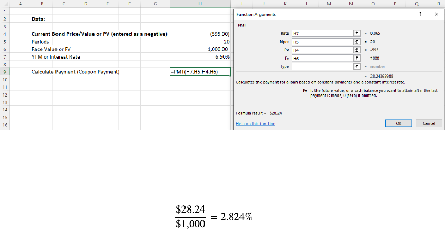 Figure 10.21 Completed Data Entry Menu 3. When arguments have all been entered, the answer will appear in the lower left of the Function Arguments box, as per the above. We arrive at a final answer of $28.24 as the coupon payment. The coupon rate can be calculated by taking this coupon payment amount and dividing it by the face value: So, the coupon rate is 2.824%. 312 10 • Bonds and Bond Valuation Access for free at openstax.org Summary 10.1 Characteristics of Bonds Bonds are typically a basic form of investment that entails a straightforward financial agreement between issuer and purchaser. There are three primary categories of bonds: government bonds, corporate bonds, and convertible bonds. These different types of bond vary depending on their issuer, length until maturity, interest rate, and risk. 10.2 Bond Valuation It is important to ascertain what a given bond is worth to a willing buyer and a willing seller. We can price a bond using an equation, a calculator, or a spreadsheet. The essential steps are (1) identify the amount and timing of the future cash flow; (2) determine the discount rate; (3) find the present values of the lump sum principal and the annuity stream of coupons; and (4) add the present value of the lump sum principal and the present value of the coupons. 10.3 Using the Yield Curve When interest rate yields are plotted against their respective maturity periods and these plotted points are connected, the resulting line is called the yield curve. The yield curve is a graphical representation of the term structure of interest rates. A yield curve always shows the value of yields (rates) on the y-axis and maturities or time periods on the x-axis. 10.4 Risks of Interest Rates and Default Because bonds are fixed-income investments, they are subject to a number of risks that could have negative effects on their market value. The most common and best-known risks are interest rate risk and default risk, but there are some others risks that should be understood, such as credit risk, liquidity risk, duration risk, call risk, investment risk, and term risk. To assist potential bond investors in understanding some of these risks, bond ratings have been developed and are regularly published by a number of organizations to express their assessment of the risk quality of various bond issues. 10.5 Using Spreadsheets to Solve Bond Problems Microsoft Excel can be used to solve common bond problems. It can be used to calculate the value of a coupon bond, the yield to maturity (interest rate) of a bond, the maturity period of a bond, and the coupon rate and interest (coupon) payments of a bond. Key Terms bond call a feature of certain bonds or other fixed-income instruments that allows the issuer to repurchase and retire these instruments before maturity bond price the present, discounted value of the future cash stream generated by a bond; the sum of the present values of all likely coupon payments and the present value of the par value at maturity bond ratings grades assigned to bonds by rating services that indicate their overall credit quality Business Cycle Dating Committee a subdivision of the National Bureau of Economic Research (NBER), the US government agency that maintains a chronology of US business cycles call risk the risk that a bond issuer will redeem a callable bond prior to maturity capital gains the increase in a capital asset’s value that is realized when the asset is sold cash rate the interest rate that a central bank, such as the Reserve Bank of Australia or the US Federal Reserve System, will charge commercial banks for loans; also known as the bank rate or the base interest rate convertible bonds fixed-income corporate debt securities that yield interest payments but can be converted into a predetermined number of common stock or equity shares 10 • Summary 313 coupon payment the periodic dollar value of interest that is paid to a bondholder by the bond issuer coupon rate the amount of annual interest paid by the bond issuer; is multiplied by the face value of a bond to determine annual interest or coupon payment amounts credit risk the risk taken by a bond investor that the bond issuer will default by failing to pay interest and repay the principal on schedule deep discount bonds bonds that sell at significantly lower values than their par values default when an issuer fails to make scheduled interest or principal payments on its bonds default risk the risk taken by investors that payments will be delayed or will not occur discount bond a bond currently trading for less than its par value in the secondary market; offers a coupon rate that is lower than prevailing interest rates duration a measure of how much bond prices are likely to change if and when interest rates move duration risk the risk associated with the sensitivity of a bond’s price to a 1% change in interest rates Federal Reserve funds rate (federal funds rate) the target interest rate, set by the Federal Reserve, at which commercial banks borrow and lend their excess reserves to each other Federal Reserve System (the Fed) the central banking system of the United States, responsible for administering fiscal policy for the country fixed-income securities investments that provide a return in the form of fixed, periodic interest payments and the eventual return of principal at maturity; the most common forms are bonds floating-rate bonds bonds with variable interest rates that allow investors to benefit from rising interest rates interest income annual interest amounts paid, or coupon payments made, on a bond between its issue date and the date of maturity interest rate risk the risk of investment losses that result from changes in interest rates investment grade describes a municipal or corporate bond with a rating that indicates it presents a low risk of default junk bonds bonds that have been given a low credit rating, below investment grade; riskier than other bonds due to a greater chance