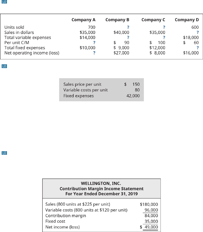 PB3. 3.2 Fill in the missing amounts for the four companies. Each case is independent of the others. Assume that only one product is being sold by each company. PB4. 3.2 West Island distributes a single product. The company’s sales and expenses for the month of June are shown. Using the information presented, answer these questions: A. What is the break-even point in units sold and dollar sales? B. What is the total contribution margin at the break-even point? C. If West Island wants to earn a profit of $21,000, how many units would they have to sell? D. Prepare a contribution margin income statement that reflects sales necessary to achieve the target profit. PB5. 3.2 Wellington, Inc., reports the following contribution margin income statement for the month of May. The company has the opportunity to purchase new machinery that will reduce its variable cost per unit by $10 but will increase fixed costs by 20%. Prepare a projected contribution margin income statement for Wellington, Inc., assuming it purchases the new equipment. Assume sales level remains unchanged. Chapter 3 Cost-Volume-Profit Analysis 181 PB6. 3.3 Karen’s Quilts is considering the purchase of a new Long-arm Quilt Machine that will cost $17,500 and will increase her fixed costs by $119. What would happen if she purchased the new quilt machine to realize the variable cost savings of $5.00 per quilt, and what would happen if she raised her price by just $5.00? She feels confident that such a small price increase will not decrease the sales in units that will help her offset the increase in fixed costs. Given the following current prices how would the break-even in units and dollars change? Complete the monthly contribution margin income statement for each of these cases. PB7. 3.4 Abilene Industries manufactures and sells three products (XX, YY, and ZZ). The sales price and unit variable cost for the three products are as follows: Their sales mix is reflected as a ratio of 4:2:1. Annual fixed costs shared by the three products are $345,000 per year. A. What are total variable costs for Abilene with their current product mix? B. Calculate the number of units of each product that will need to be sold in order for Abilene to break even. C. What is their break-even point in sales dollars? D. Using an income statement format, prove that this is the break-even point. 182 Chapter 3 Cost-Volume-Profit Analysis This OpenStax book is available for free at http://cnx.org/content/col25479/1.11 PB8. 3.4 Tim-Buck-II rents jet skis at a beach resort. There are three models available to rent: Junior, Adult, and Expert. The rental price and variable costs for these three models are as follows: The current product mix is 5:4:1. The three models share total fixed costs of $114,750 A. Calculate the sales price per composite unit. B. What is the contribution margin per composite unit? C. Calculate Tim-Buck-II’s break-even point in both dollars and units. D. Using an income statement format, prove that this is the break-even point. PB9. 3.5 Fire Company is a service firm with current service revenue of $900,000 and a 40% contribution margin. Its fixed costs are $200,000. Ice Company has current sales of $420,000 and a 30% contribution margin. Its fixed costs are $90,000. A. What is the margin of safety for Fire and Ice? B. Compare the margin of safety in dollars between the two companies. Which is stronger? C. Compare the margin of safety in percentage between the two companies. Now which one is stronger? D. Compute the degree of operating leverage for both companies. Which company will benefit most from a 10% increase in sales? Explain why. Illustrate your findings in an Income Statement that is increased by 10%. Thought Provokers TP1. 3.1 Mariana Manufacturing and Bellow Brothers compete in the same industry and in all respects their products are virtually identical. However, most of Mariana’s costs are fixed while Bellow’s costs are primarily variable. If sales increase for both companies, which will realize the greatest increase in profits? Why? TP2. 3.2 Roald is the sales manager for a small regional manufacturing firm you own. You have asked him to put together a plan for expanding into nearby markets. You know that Roald’s previous job had him working closely with many of your competitors in this new market, and you believe he will be able to facilitate the company expansion. He is to prepare a presentation to you and your partners outlining his strategy for taking the company into this expanded market. The day before the presentation, Roald comes to you and explains that he will not be making a presentation on market expansion but instead wants to discuss several ways he believes the company can reduce both fixed and variable costs. Why would Roald want to focus on reducing costs rather than on expanding into a new market? Chapter 3 Cost-Volume-Profit Analysis 183 TP3. 3.3 As a manager, you have to choose between two options for new production equipment. Machine A will increase fixed costs by a substantial margin but will produce greater sales volume at the current price. Machine B will only slightly increase fixed costs but will produce considerable savings on variable cost per unit. No additional sales are anticipated if Machine B is selected. What are the relative merits of both machines, and how could you go about analyzing which machine is the better investment for the company in terms of both net operating income and break-even? TP4. 3.5 Couture’s Creations is considering offering Joe, an hourly employee, the opportunity to become a salaried employee. Why is this a good idea for Couture’s Creations? Is this a good idea for Joe? What if Couture’s Creations entices Joe to agree to the change by offering him a salaried position with no risk of layoff during the winter lull? What if Joe agrees and Couture’s Creations lays him off anyway six months into the agreement? 184 Chapter 3 Cost-Volume-Profit Analysis This Ope