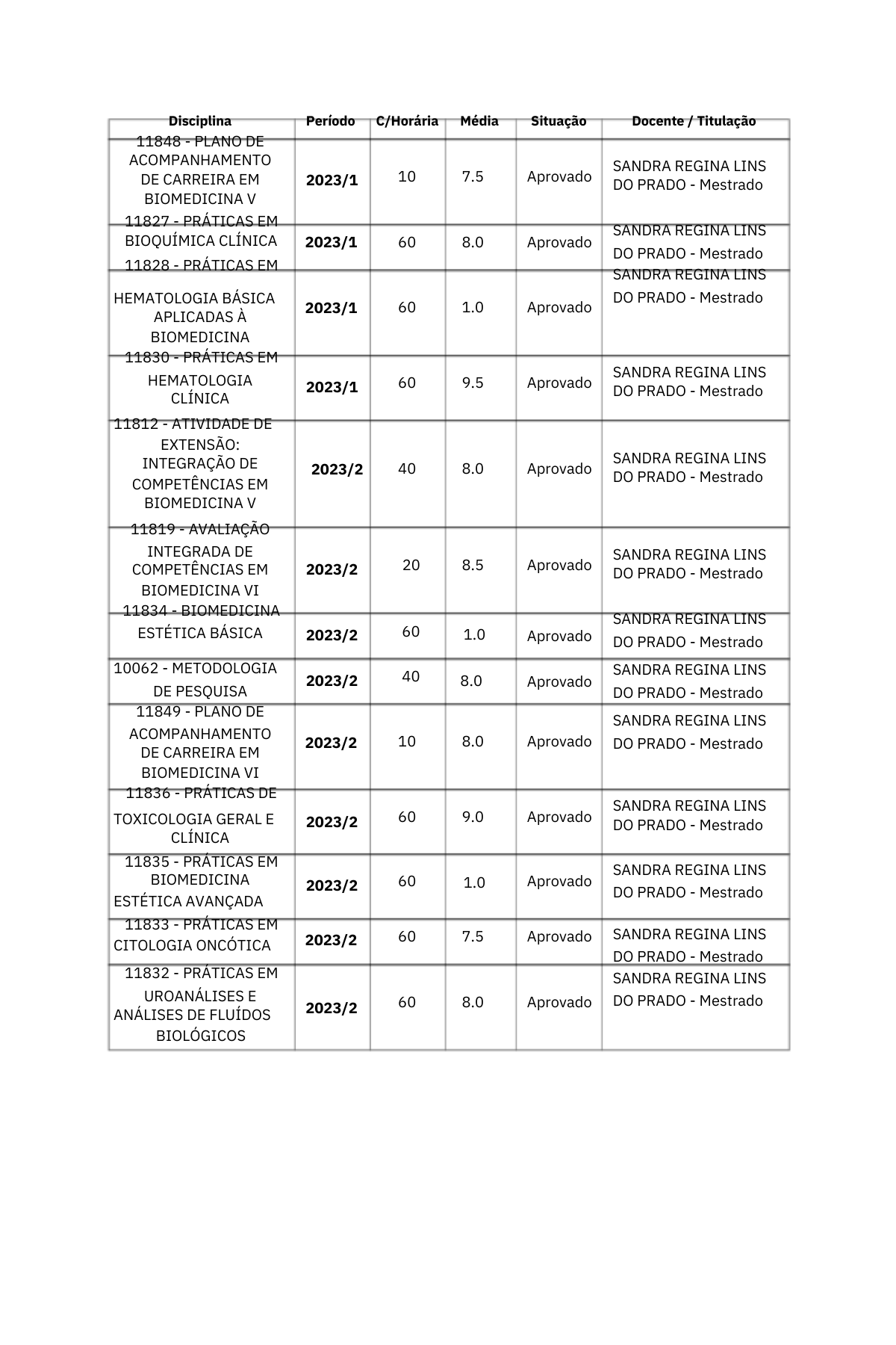 Disciplina Período C/Horária Média Situação Docente Titulação 11848 - PLANO DE ACOMPANHAMENTO SANDRA REGINA LINS DE CARREIRA EM 2023/1 10 7.5 Aprovado DO PRADO - Mestrado BIOMEDICINA V 11827 - EM SANDRA REGINA LINS BIOQUÍMICA CLÍNICA 2023/1 60 8.0 Aprovado DO PRADO - Mestrado 11828 - PRÁTICAS EM SANDRA REGINA LINS HEMATOLOGIA BÁSICA DO PRADO - Mestrado APLICADAS À 2023/1 60 1.0 Aprovado BIOMEDICINA 11830 - SANDRA REGINA LINS HEMATOLOGIA 2023/1 60 9.5 Aprovado CLÍNICA DO PRADO - Mestrado 11812 - ATIVIDADE DE EXTENSÃO: INTEGRAÇÃO DE SANDRA REGINA LINS 2023/2 40 8.0 Aprovado COMPETÊNCIAS EM DO PRADO Mestrado BIOMEDICINA V 11819 AVALIAÇÃO INTEGRADA DE SANDRA REGINA LINS COMPETÊNCIAS EM 2023/2 20 8.5 Aprovado DO PRADO - Mestrado BIOMEDICINA VI 11834 - BIOMEDICINA SANDRA REGINA LINS ESTÉTICA BÁSICA 2023/2 60 1.0 Aprovado DO - 10062 - METODOLOGIA 40 SANDRA REGINA LINS 2023/2 8.0 Aprovado DE PESQUISA DO PRADO Mestrado 11849 - PLANO DE SANDRA REGINA LINS ACOMPANHAMENTO 2023/2 10 8.0 Aprovado DO PRADO - Mestrado DE CARREIRA EM BIOMEDICINA VI 11836 - PRÁTICAS DE SANDRA REGINA LINS TOXICOLOGIA GERAL E 2023/2 60 9.0 Aprovado DO PRADO - Mestrado CLÍNICA 11835 - EM SANDRA REGINA LINS BIOMEDICINA 2023/2 60 1.0 Aprovado DO PRADO - Mestrado ESTÉTICA AVANÇADA 11833 - PRÁTICAS EM CITOLOGIA ONCÓTICA 2023/2 60 7.5 Aprovado SANDRA REGINA LINS DO PRADO - Mestrado 11832 - EM SANDRA REGINA LINS UROANÁLISES E 2023/2 60 8.0 Aprovado DO PRADO - Mestrado ANÁLISES DE FLUÍDOS BIOLÓGICOS