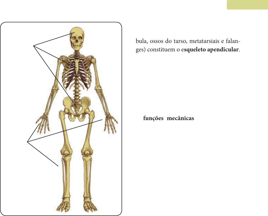 39Osteologia Esqueleto Axial Esqueleto Apendicular Figura 2.12 - Desenho esquemático dos esqueletos axial e apendicular metacarpiais e falanges) e dos membros inferiores (quadril, fêmur, patela, tíbia, fí- bula, ossos do tarso, metatarsiais e falan- ges) constituem o esqueleto apendicular. 2.7 Funções do Esqueleto O esqueleto possui funções muito impor- tantes do ponto de vista mecânico e biológi- co. Entre elas podemos destacar as seguintes: • funções mecânicas: proteção e sus- tentação das partes moles do corpo (sistema nervoso central, coração e pulmões), conformação do corpo (dá forma ao corpo) e auxílio no sistema de alavancas biológicas para a realiza- ção dos movimentos; • funções biológicas: o esqueleto é res- ponsável pela produção de células san- guíneas e nele ficam depositados os íons de cálcio, fósforo e zinco. Resumo A Osteologia é a parte da Anatomia que estuda os ossos. O corpo humano possui 206 ossos classificados em ossos axiais e apendicu- lares. Os ossos axiais localizam-se na cabeça, no pescoço e no tron- co, e os ossos apendiculares localizam-se nos membros superiores e inferiores. Quanto à forma, os ossos são classificados em: longos, alongados, planos, curtos, irregulares, pneumáticos e sesamoides. O osso apresenta dois tipos de substância óssea, a substância óssea compacta e a substância óssea esponjosa. A compacta é a camada externa do osso, e a esponjosa é a camada interna do osso. Além disso, o osso é revestido externamente pelo periósteo e internamente pelo endósteo.