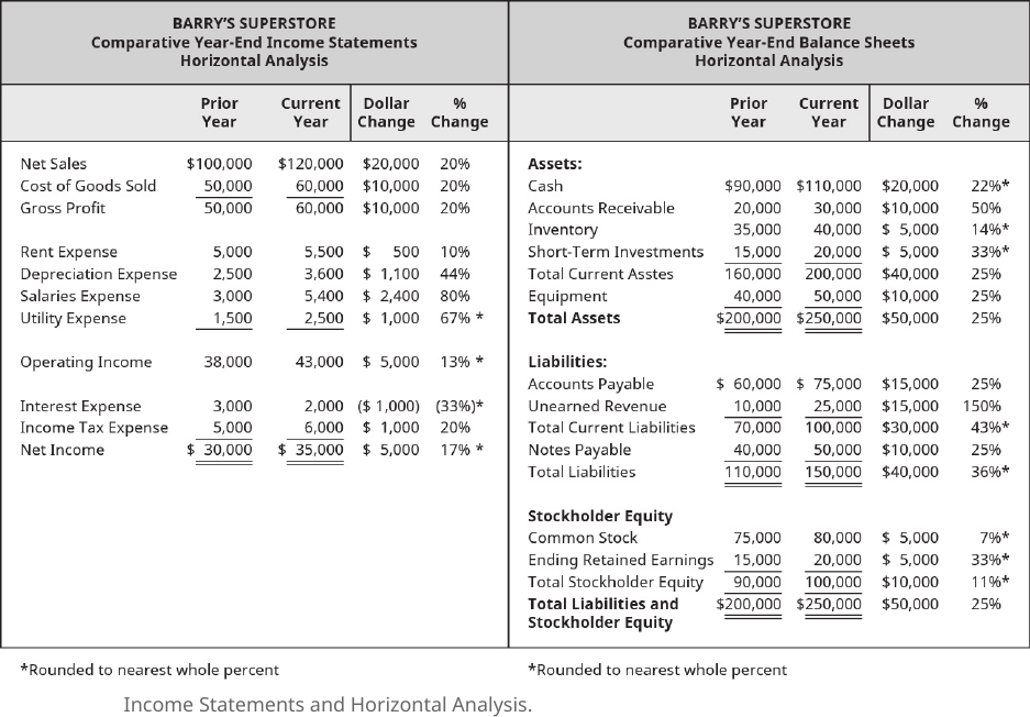 Figure A.2 Income Statements and Horizontal Analysis. Depending on their expectations, Banyan Goods could make decisions to alter operations to produce expected outcomes. For example, Banyan saw a 50% accounts receivable increase from the prior year to the current year. If they were only expecting a 20% increase, they may need to explore this line item further to determine what caused this difference and how to correct it going forward. It could possibly be that they are extending credit more readily than anticipated or not collecting as rapidly on outstanding accounts receivable. The company will need to further examine this difference before deciding on a course of action. Another method of analysis Banyan might consider before making a decision is vertical analysis. Vertical Analysis Vertical analysis shows a comparison of a line item within a statement to another line item within that same statement. For example, a company may compare cash to total assets in the current year. This allows a company to see what percentage of cash (the comparison line item) makes up total assets (the other line item) during the period. This is different from horizontal analysis, which compares across years. Vertical analysis compares line items within a statement in the current year. This can help a business to know how much of one item is contributing to overall operations. For example, a company may want to know how much inventory contributes to total assets. They can then use this information to make business decisions such as preparing the budget, cutting costs, increasing revenues, or capital investments. The company will need to determine which line item they are comparing all items to within that statement and then calculate the percentage makeup. These percentages are considered common-size because they make businesses within industry comparable by taking out fluctuations for size. It is typical for an income statement to use net sales (or sales) as the comparison line item. This means net sales will be set at 100% and all other Appendix A 1011 line items within the income statement will represent a percentage of net sales. On the balance sheet, a company will typically look at two areas: (1) total assets, and (2) total liabilities and stockholders’ equity. Total assets will be set at 100% and all assets will represent a percentage of total assets. Total liabilities and stockholders’ equity will also be set at 100% and all line items within liabilities and equity will be represented as a percentage of total liabilities and stockholders’ equity. The line item set at 100% is considered the base amount and the comparison line item is considered the comparison amount. The formula to determine the common-size percentage is: For example, if Banyan Goods set total assets as the base amount and wanted to see what percentage of total assets were made up of cash in the current year, the following calculation would occur. (A3)Common-size percentage = ⎛⎝$110,000 $250,000 ⎞ ⎠× 100 = 44% Cash in the current year is $110,000 and total assets equal $250,000, giving a common-size percentage of 44%. If the company had an expected cash balance of 40% of total assets, they would be exceeding expectations. This may not be enough of a difference to make a change, but if they notice this deviates from industry standards, they may need to make adjustments, such as reducing the amount of cash on hand to reinvest in the business. Figure A.3 shows the common-size calculations on the comparative income statements and comparative balance sheets for Banyan Goods. Figure A.3 Income Statements and Vertical Analysis. 1012 Appendix A This OpenStax book is available for free at http://cnx.org/content/col25448/1.4 Even though vertical analysis is a statement comparison within the same year, Banyan can use information from the prior year’s vertical analysis to make sure the business is operating as expected. For example, unearned revenues increased from the prior year to the current year and made up a larger portion of total liabilities and stockholders’ equity. This could be due to many factors, and Banyan Goods will need to examine this further to see why this change has occurred. Let’s turn to financial statement analysis using financial ratios. Overview of Financial Ratios Financial ratios help both internal and external users of information make informed decisions about a company. A stakeholder could be looking to invest, become a supplier, make a loan, or alter internal operations, among other things, based in part on the outcomes of ratio analysis. The information resulting from ratio analysis can be used to examine trends in performance, establish benchmarks for success, set budget expectations, and compare industry competitors. There are four main categories of ratios: liquidity, solvency, efficiency, and profitability. Note that while there are more ideal outcomes for some ratios, the industry in which the business operates can change the influence each of these outcomes has over stakeholder decisions. (You will learn more about ratios, industry standards, and ratio interpretation in advanced accounting courses.) Liquidity Ratios Liquidity ratios show the ability of the company to pay short-term obligations if they came due immediately with assets that can be quickly converted to cash. This is done by comparing current assets to current liabilities. Lenders, for example, may consider the outcomes of liquidity ratios when deciding whether to extend a loan to a company. A company would like to be liquid enough to manage any currently due obligations but not too liquid where they may not be effectively investing in growth opportunities. Three common liquidity measurements are working capital, current ratio, and quick ratio. Working Capital Working capital measures the financial health of an organization in the short-term by finding the difference between current assets and current liabilities. A company 