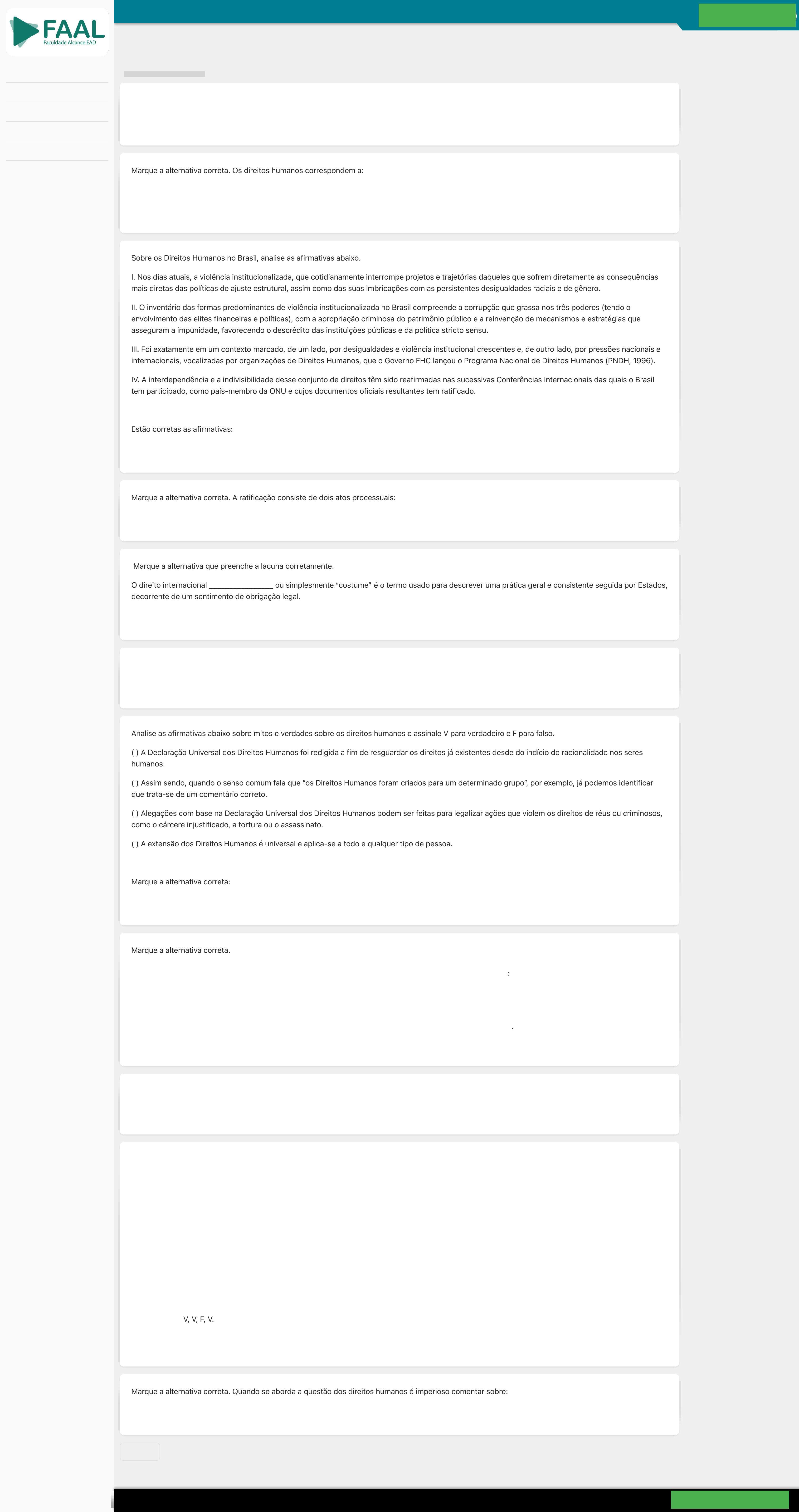 Curso: LICITAÇÕES E COMPRAS SUSTENTÁVEIS Disciplina: DIREITOS HUMANOS AVALIAÇÃO Para sua análise, estão sendo exibidas somente as questões respondidas. Marque a alternativa correta. Os direitos humanos correspondem a: Sobre os Direitos Humanos no Brasil, analise as afirmativas abaixo. I. Nos dias atuais, a violência institucionalizada, que cotidianamente interrompe projetos e trajetórias daqueles que sofrem diretamente as consequências mais diretas das políticas de ajuste estrutural, assim como das suas imbricações com as persistentes desigualdades raciais e de gênero. II. O inventário das formas predominantes de violência institucionalizada no Brasil compreende a corrupção que grassa nos três poderes (tendo o envolvimento das elites financeiras e políticas), com a apropriação criminosa do patrimônio público e a reinvenção de mecanismos e estratégias que asseguram a impunidade, favorecendo o descrédito das instituições públicas e da política stricto sensu. III. Foi exatamente em um contexto marcado, de um lado, por desigualdades e violência institucional crescentes e, de outro lado, por pressões nacionais e internacionais, vocalizadas por organizações de Direitos Humanos, que o Governo FHC lançou o Programa Nacional de Direitos Humanos (PNDH, 1996). IV. A interdependência e a indivisibilidade desse conjunto de direitos têm sido reafirmadas nas sucessivas Conferências Internacionais das quais o Brasil tem participado, como país-membro da ONU e cujos documentos oficiais resultantes tem ratificado. Estão corretas as afirmativas: Marque a alternativa correta. A ratificação consiste de dois atos processuais: Marque a alternativa que preenche a lacuna corretamente. O direito internacional ________________ ou simplesmente “costume” é o termo usado para descrever uma prática geral e consistente seguida por Estados, decorrente de um sentimento de obrigação legal. Marque a alternativa correta. A criação das Nações Unidas viabilizou: Analise as afirmativas abaixo sobre mitos e verdades sobre os direitos humanos e assinale V para verdadeiro e F para falso. ( ) A Declaração Universal dos Direitos Humanos foi redigida a fim de resguardar os direitos já existentes desde do indício de racionalidade nos seres humanos. ( ) Assim sendo, quando o senso comum fala que “os Direitos Humanos foram criados para um determinado grupo”, por exemplo, já podemos identificar que trata-se de um comentário correto. ( ) Alegações com base na Declaração Universal dos Direitos Humanos podem ser feitas para legalizar ações que violem os direitos de réus ou criminosos, como o cárcere injustificado, a tortura ou o assassinato. ( ) A extensão dos Direitos Humanos é universal e aplica-se a todo e qualquer tipo de pessoa. Marque a alternativa correta: Marque a alternativa correta. A expressão “direitos humanos” é uma forma abreviada de mencionar os direitos fundamentais da pessoa humana. Sem esses direitos a pessoa não consegue existir ou não é capaz de se desenvolver e de participar plenamente da vida. Todos seres humanos devem ter assegurados, desde o nascimento, as condições mínimas necessárias para se tornarem úteis à humanidade, como também: Marque a alternativa correta. Os direitos humanos tem sua origem na: Analise as afirmativas abaixo sobre as funções e características dos direitos humanos e assinale V para verdadeiro e F para falso. ( ) Ensina Canotilho que os direitos humanos desempenham quatro funções fundamentais: função de defesa ou de liberdade, função de prestação social, função classificação coloca em clara evidência o papel de sujeito passivo do Estado frente aos direitos humanos. ( ) A função de defesa ou de liberdade é decorrência da histórica preocupação com a limitação do poder estatal, gênese dos direitos humanos, que põem, então, os interesses do cidadão (em especial a sua liberdade) a salvo da intervenção arbitrária do Estado, fazendo-o em dupla perspectiva: objetiva e subjetiva. ( ) Na perspectiva objetiva, os direitos humanos consubstanciam “normas de competência negativa para os poderes públicos”, permitindo e até incentivnado ingerências abusivas na esfera jurídica do indivíduo. ( ) A função de prestação social está associada aos direitos humanos cuja con- cretização (otimização) dependa de providências positivas do Estado, v.g., saúde, educação e segurança. Marque a alternativa correta: Marque a alternativa correta. Quando se aborda a questão dos direitos humanos é imperioso comentar sobre: VOLTAR ☑ Necessidades essenciais da pessoa humana. ☑ Todas as afirmativas estão corretas. ☑ A nível interno e a nível internacional. ☑ Consuetudinário. ☑ Viabilizou um fórum ideal para o desenvolvimento e a adoção dos instrumentos internacionais de direitos humanos. ❎ F, V, F, V. ☑ devem ter a possibilidade de receber os benefícios que a vida em sociedade pode proporcionar. ☑ Dignidade humana. ☑ V, V, F, V. ☑ Declaração Universal dos Direitos Humanos. CLEUBER LUIZ SOBRINHO Home 📔 Meus cursos Financeiro Documentos 🗪 Protocolos Sair FACULDADE ALCANCE Eduno EAD | HotSystems Soluções em TI Ltda https://ead.eduno.com.br/abriravaliacaoaluno/137d8472667d812c882eb490414208ff# https://ead.eduno.com.br/alteradadospessoais