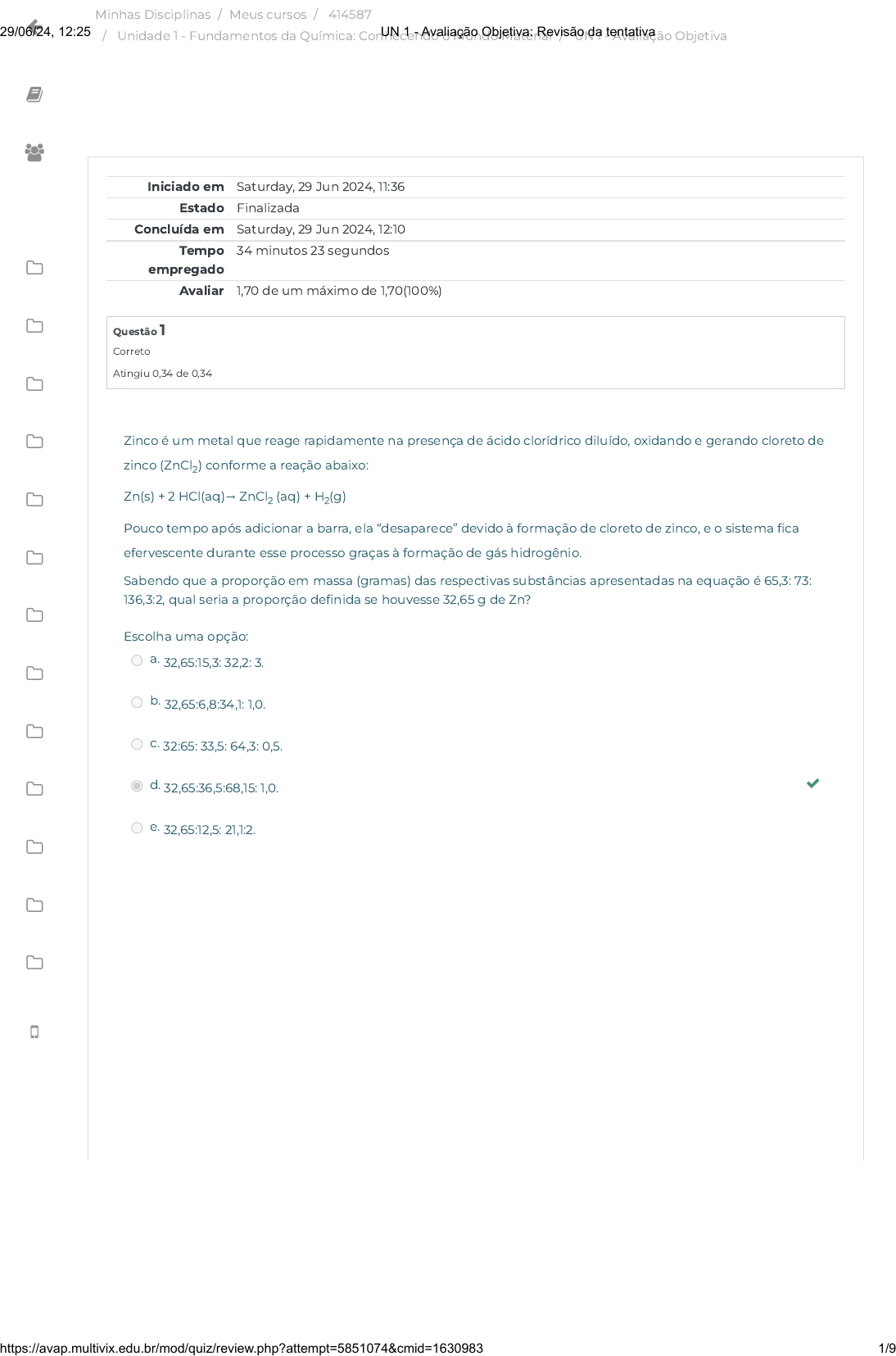 Minhas Disciplinas / Meus cursos / 414587 / Unidade 1 - Fundamentos da Química: Conhecendo o Mundo Material / UN 1 - Avaliação Objetiva Iniciado em Saturday, 29 Jun 2024, 11:36 Estado Finalizada Concluída em Saturday, 29 Jun 2024, 12:10 Tempo empregado 34 minutos 23 segundos Avaliar 1,70 de um máximo de 1,70(100%) Questão 1 Correto Atingiu 0,34 de 0,34 Zinco é um metal que reage rapidamente na presença de ácido clorídrico diluído, oxidando e gerando cloreto de zinco (ZnCl ) conforme a reação abaixo: Zn(s) + 2 HCl(aq)→ ZnCl (aq) + H (g) Pouco tempo após adicionar a barra, ela “desaparece” devido à formação de cloreto de zinco, e o sistema �ca efervescente durante esse processo graças à formação de gás hidrogênio. Sabendo que a proporção em massa (gramas) das respectivas substâncias apresentadas na equação é 65,3: 73: 136,3:2, qual seria a proporção de�nida se houvesse 32,65 g de Zn? Escolha uma opção: a. 32,65:15,3: 32,2: 3. b. 32,65:6,8:34,1: 1,0. c. 32:65: 33,5: 64,3: 0,5. d. 32,65:36,5:68,15: 1,0. e. 32,65:12,5: 21,1:2. 2 2 2 29/06/24, 12:25 UN 1 - Avaliação Objetiva: Revisão da tentativa https://avap.multivix.edu.br/mod/quiz/review.php?attempt=5851074&cmid=1630983 1/9 https://avap.multivix.edu.br/my/ https://avap.multivix.edu.br/course/view.php?id=26148 https://avap.multivix.edu.br/course/view.php?id=26148§ion=2 https://avap.multivix.edu.br/mod/quiz/view.php?id=1630983 https://avap.multivix.edu.br/my/ https://avap.multivix.edu.br/course/view.php?id=26148 https://avap.multivix.edu.br/user/index.php?id=26148 https://avap.multivix.edu.br/course/view.php?id=26148§ion=1 https://avap.multivix.edu.br/course/view.php?id=26148§ion=2 https://avap.multivix.edu.br/course/view.php?id=26148§ion=3 https://avap.multivix.edu.br/course/view.php?id=26148§ion=4 https://avap.multivix.edu.br/course/view.php?id=26148§ion=5 https://avap.multivix.edu.br/course/view.php?id=26148§ion=6 https://avap.multivix.edu.br/course/view.php?id=26148§ion=7 https://avap.multivix.edu.br/course/view.php?id=26148§ion=8 https://avap.multivix.edu.br/course/view.php?id=26148§ion=9 https://avap.multivix.edu.br/course/view.php?id=26148§ion=10 https://avap.multivix.edu.br/course/view.php?id=26148§ion=11 https://avap.multivix.edu.br/course/view.php?id=26148§ion=12 https://avap.multivix.edu.br/course/view.php?id=26148§ion=13 https://avap.multivix.edu.br/hooks/portal/ https://avap.multivix.edu.br/ https://avap.multivix.edu.br/ https://avap.multivix.edu.br/ https://avap.multivix.edu.br/ https://avap.multivix.edu.br/ https://avap.multivix.edu.br/ https://avap.multivix.edu.br/ https://avap.multivix.edu.br/ https://avap.multivix.edu.br/ https://avap.multivix.edu.br/ 29/06/24, 12:25 UN 1 - Avaliação Objetiva: Revisão da tentativa https://avap.multivix.edu.br/mod/quiz/review.php?attempt=5851074&cmid=1630983 2/9 https://avap.multivix.edu.br/my/ https://avap.multivix.edu.br/course/view.php?id=26148 https://avap.multivix.edu.br/user/index.php?id=26148 https://avap.multivix.edu.br/course/view.php?id=26148§ion=1 https://avap.multivix.edu.br/course/view.php?id=26148§ion=2 https://avap.multivix.edu.br/course/view.php?id=26148§ion=3 https://avap.multivix.edu.br/course/view.php?id=26148§ion=4 https://avap.multivix.edu.br/course/view.php?id=26148§ion=5 https://avap.multivix.edu.br/course/view.php?id=26148§ion=6 https://avap.multivix.edu.br/course/view.php?id=26148§ion=7 https://avap.multivix.edu.br/course/view.php?id=26148§ion=8 https://avap.multivix.edu.br/course/view.php?id=26148§ion=9 https://avap.multivix.edu.br/course/view.php?id=26148§ion=10 https://avap.multivix.edu.br/course/view.php?id=26148§ion=11 https://avap.multivix.edu.br/course/view.php?id=26148§ion=12 https://avap.multivix.edu.br/course/view.php?id=26148§ion=13 https://avap.multivix.edu.br/hooks/portal/ https://avap.multivix.edu.br/ https://avap.multivix.edu.br/ https://avap.multivix.edu.br/ https://avap.multivix.edu.br/ https://avap.multivix.edu.br/ https://avap.multivix.edu.br/ https://avap.multivix.edu.br/ https://avap.multivix.edu.br/ https://avap.multivix.edu.br/ https://avap.multivix.edu.br/ https://www.shutterstock.com/pt/image-vector/atomic-orbitals-basic-vector-illustration-types-176273831? src=KlZ5SoEMkTYHhclJfDkVgQ-1-16 Fonte: SHUTTERSTOCK, 2018. Figura 2 – Modelo atômico quântico https://www.shutterstock.com/pt/image-illustration/hydrogen-atom-bohr-model-proton-electron-1036576219? src=mNR5NjUIcegYQD-l3_53Kw-1-8 Fonte: SHUTTERSTOCK, 2018. Assinale a alternativa que apresenta a diferença entre os modelos apresentados nas Figuras 1 e 2. 29/06/24, 12:25 UN 1 - Avaliação Objetiva: Revisão da tentativa https://avap.multivix.edu.br/mod/quiz/review.php?attempt=5851074&cmid=1630983 3/9 https://www.shutterstock.com/pt/image-vector/atomic-orbitals-basic-vector-illustration-types-176273831?src=KlZ5SoEMkTYHhclJfDkVgQ-1-16 https://www.shutterstock.com/pt/image-vector/atomic-orbitals-basic-vector-illustration-types-176273831?src=KlZ5SoEMkTYHhclJfDkVgQ-1-16 https://www.shutterstock.com/pt/image-illustration/hydrogen-atom-bohr-model-proton-electron-1036576219?src=mNR5NjUIcegYQD-l3_53Kw-1-8 https://www.shutterstock.com/pt/image-illustration/hydrogen-atom-bohr-model-proton-electron-1036576219?src=mNR5NjUIcegYQD-l3_53Kw-1-8 https://avap.multivix.edu.br/my/ https://avap.multivix.edu.br/course/view.php?id=26148 https://avap.multivix.edu.br/user/index.php?id=26148 https://avap.multivix.edu.br/course/view.php?id=26148§ion=1 https://avap.multivix.edu.br/course/view.php?id=26148§ion=2 https://avap.multivix.edu.br/course/view.php?id=26148§ion=3 https://avap.multivix.edu.br/course/view.php?id=26148§ion=4 https://avap.multivix.edu.br/course/view.php?id=26148§ion=5 https://avap.multivix.edu.br/course/view.php?id=26148§ion=6 https://avap.multivix.edu.br/course/view.php?id=26148§ion=7 https://avap.multivix.edu.br/course/view.php?id=26148§ion=8 https://avap.multivix.edu.br/course/view.php?id=26148§ion=9 https://av