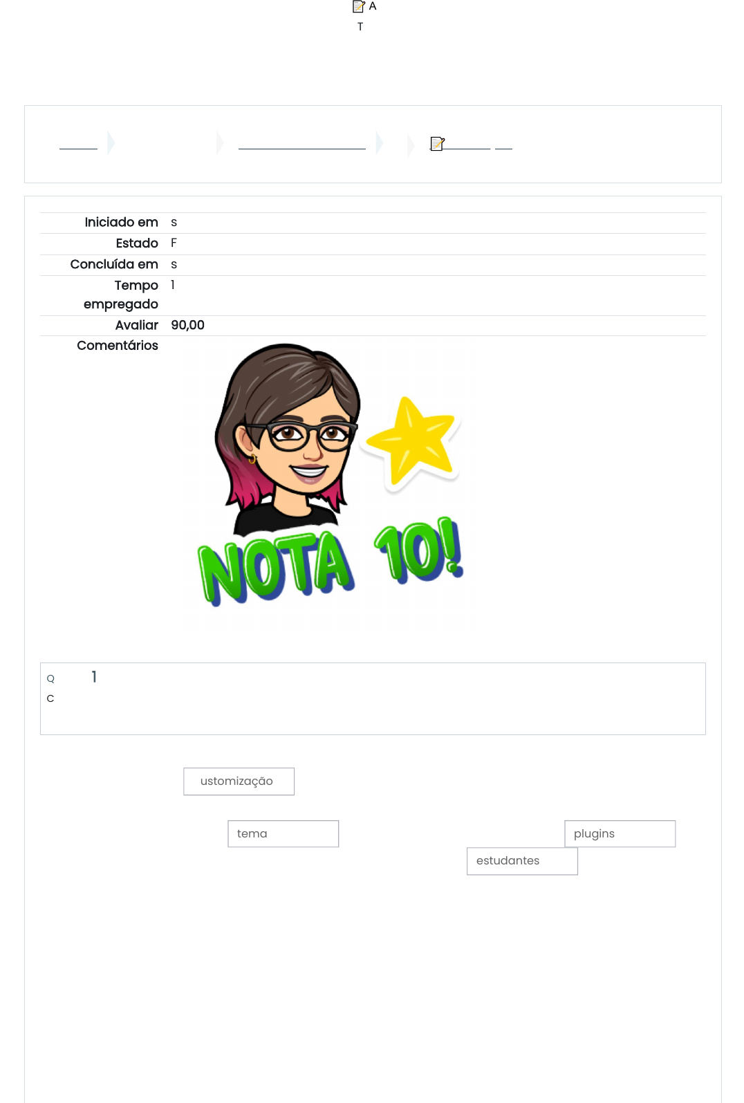 Painel Meus cursos 10152006-T01-2024-1 📝 Avaliação Iniciado em sábado, 29 jun 2024, 11:29 Estado Finalizada Concluída em sábado, 29 jun 2024, 11:46 Tempo empregado 17 minutos 23 segundos Avaliar 90,00 de um máximo de 100,00 Comentários Questão 1 Correto Atingiu 10,00 de 10,00 A funcionalidade de no sistema Moodle permite que os administradores e tutores personalizem a plataforma de acordo com as necessidades específicas da instituição ou do curso. Eles podem alterar o da plataforma, adicionar novos e recursos para melhorar a experiência de aprendizagem dos . customização tema plugins estudantes Tamanho da fonte A- A A+ Cor do site R A A A 29/06/2024, 12:47 📝 Avaliação: Revisão da tentativa https://ava.ufms.br/mod/quiz/review.php?attempt=1026115&cmid=835005 1/5 https://ava.ufms.br/my/ https://ava.ufms.br/course/view.php?id=58769 https://ava.ufms.br/mod/quiz/view.php?id=835005 Questão 2 Correto Atingiu 10,00 de 10,00 Questão 3 Correto Atingiu 10,00 de 10,00 Questão 4 Correto Atingiu 10,00 de 10,00 Relacione cada evento histórico sobre o Moodle com a funcionalidade e característica correspondente: Introduziu importantes melhorias de usabilidade e recursos de colaboração na plataforma Moodle. Uma vasta rede de usuários, desenvolvedores e educadores que colaboram para melhorar e expandir continuamente o Moodle. Demonstrou a popularidade e o alcance global do Moodle como uma plataforma de aprendizagem confiável. Estabeleceu a base para o Moodle como uma solução viável para instituições educacionais em todo o mundo. Lançamento do Moodle 2.0 Comunidade Global Adoção global Primeira versão estável Associe cada uma das ferramenta mencionadas com a descrição correspondente: Uma ferramenta para coletar opiniões ou votos dos participantes sobre questões específicas. Uma plataforma onde os estudantes podem trocar ideia, discutir tópicos do curso assincronamente. Uma função que permite a comunicação em tempo real entre os usuários, facilitando discussões instantâneas e suporte entre os colegas. Um recurso que possibilita a definição e a explicação de termos específicos, facilitando o entendimento do conteúdo do curso. Enquete Fórum de discussão Chat Glossário O Moodle não integrou na sua plataforma a funcionalidade de Acessibilidade, portanto esse ambiente virtual de aprendizagem não garante o acesso a todas as pessoas. Escolha uma opção: Verdadeiro Falso Tamanho da fonte A- A A+ Cor do site R A A A 29/06/2024, 12:47 📝 Avaliação: Revisão da tentativa https://ava.ufms.br/mod/quiz/review.php?attempt=1026115&cmid=835005 2/5 Questão 5 Correto Atingiu 10,00 de 10,00 Questão 6 Correto Atingiu 10,00 de 10,00 Questão 7 Correto Atingiu 10,00 de 10,00 O diário no sistema Moodle é uma ferramenta que permite aos estudantes registrarem suas reflexões, progresso e experiências ao longo do curso, podendo compartilhá-las com o tutor e colegas da turma. Escolha uma opção: Verdadeiro Falso As ferramentas de acompanhamento da Educação a Distância (EaD) são de suma importância para garantir a eficácia, qualidade e sucesso do processo de ensino-aprendizagem. Elas desempenham vários papéis cruciais. Qual ferramenta permite aos tutores acompanhar o progresso dos estudantes em um curso? Escolha uma opção: a. Relatórios de participação b. Glossário c. Chat d. Fórum Assinale a alternativa que NÃO corresponde a uma possibilidade de feedback no sistema Moodle. Escolha uma opção: a. Uso de feedback em fóruns de discussão. b. Notas atribuídas automaticamente com base no tempo de acesso no curso. c. Comentários de texto em tarefas. d. Avaliação com uso de rubricas para fornecer critérios de avaliação precisos. Tamanho da fonte A- A A+ Cor do site R A A A 29/06/2024, 12:47 📝 Avaliação: Revisão da tentativa https://ava.ufms.br/mod/quiz/review.php?attempt=1026115&cmid=835005 3/5 Questão 8 Correto Atingiu 10,00 de 10,00 Questão 9 Correto Atingiu 10,00 de 10,00 Questão 10 Incorreto Atingiu 0,00 de 10,00 Assinale a alternativa incorreta em relação ao feedback em atividades de múltiplas escolhas no Ambiente Virtual de Aprendizagem. Escolha uma opção: a. O feedback geral e/ou específico tem impacto significativo no processo de aprendizagem, uma vez que os estudantes se concentram apenas em notas finais. b. O feedback detalhado nas respostas corretas e incorretas pode promover reflexão crítica, incentivando os estudantes a compreenderem profundamente o conteúdo e reconhecerem padrões de erro. c. O feedback imediato pode ajudar os estudantes a corrigirem erros em tempo real e reforçar a aprendizagem ao proporcionar explicações detalhadas sobre as respostas corretas e incorretas. d. O feedback em atividades de múltipla escolha só pode ser feito pelo tutor e nunca pelos colegas de curso. O feedback construtivo no sistema Moodle é uma ferramenta essencial para fornecer aos estudantes uma orientação clara sobre o seu desempenho. Ele pode incluir específicas sobre as áreas em que os estudantes se destacam e aquelas que precisam de melhoria. Além disso, o feedback no Moodle deve ser propiciando aos estudantes orientações sobre como podem aprimorar o seu trabalho. Ao oferecer feedback no Moodle, os tutores devem se certificar de que ele seja com os critérios de avaliação predefinidos. Por fim, o feedback deve ser permitindo que os estudantes compreendam as expectativas e os próximos passos para melhorar seu desempenho. observações direto alinhado significativo Selecione a seguir a alternativa que corresponde à estratégias para elaboração de feedback eficaz: Escolha uma opção: a. Dialógico b. Respeitoso c. Assertivo d. Inespecífico Tamanho da fonte A- A A+ Cor do site R A A A 29/06/2024, 12:47 📝 Avaliação: Revisão da tentativa https://ava.ufms.br/mod/quiz/review.php?attempt=1026115&cmid=835005 4/5 Atividade anterior ◄ 💬 Fórum de Discussão do Módulo 3 - Feedback: conceitos, estratég
