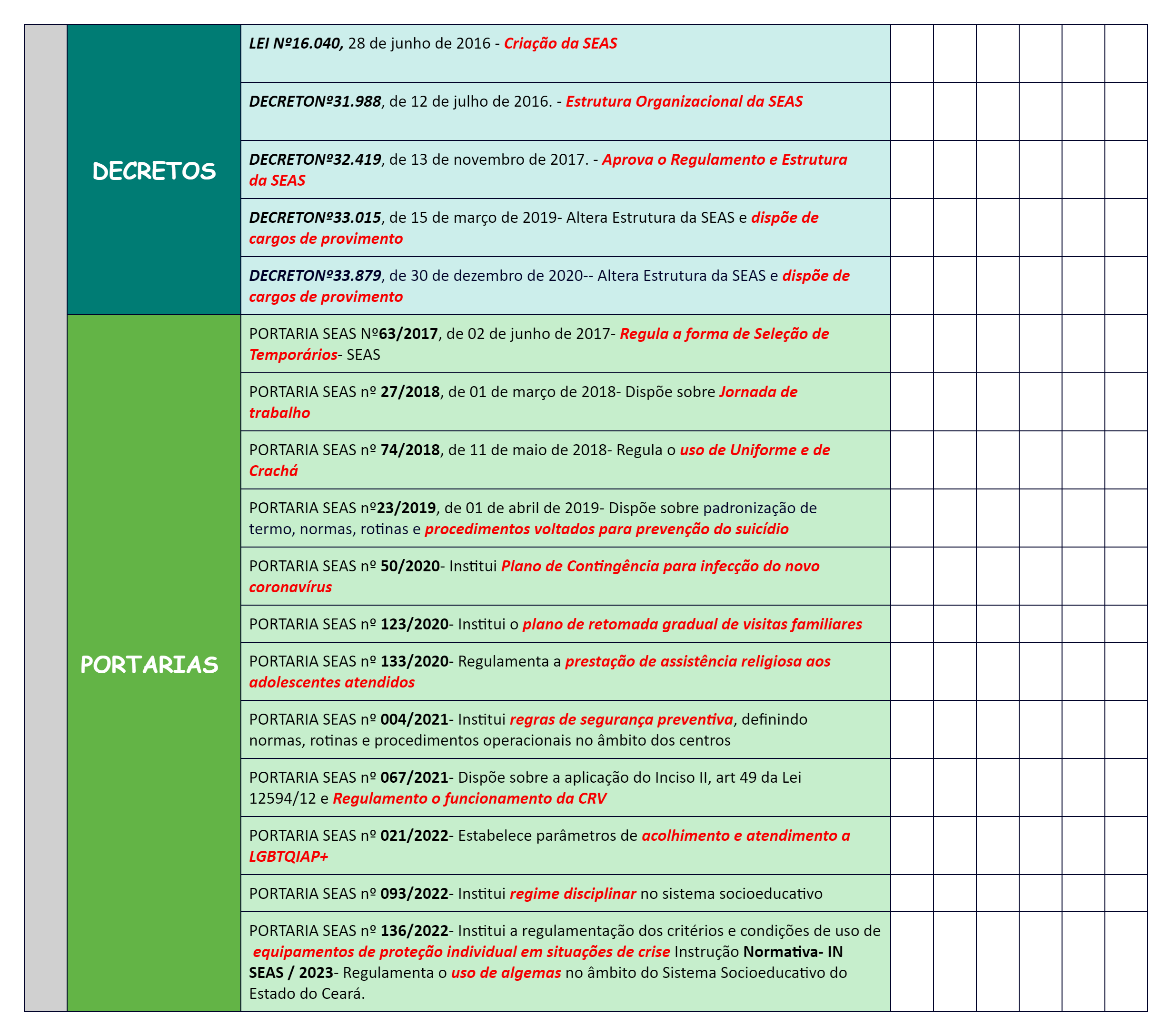 LEI N°16.040, 28 de junho de 2016 Criação da SEAS de 12 de julho de 2016. Estrutura Organizacional da SEAS de 13 de novembro de 2017. Aprova o Regulamento e Estrutura DECRETOS da SEAS de 15 de março de 2019- Altera Estrutura da SEAS e dispõe de cargos de provimento de 30 de dezembro de 2020-- Altera Estrutura da SEAS e dispõe de cargos de provimento PORTARIA SEAS de 02 de junho de 2017- Regula a forma de Seleção de Temporários- SEAS PORTARIA SEAS 27/2018, de 01 de março de 2018- Dispõe sobre Jornada de trabalho PORTARIA SEAS 74/2018, de 11 de maio de 2018- Regula o uso de Uniforme e de PORTARIA SEAS n°23/2019, de 01 de abril de 2019- Dispõe sobre padronização de termo, normas, rotinas e procedimentos voltados para prevenção do suicídio PORTARIA SEAS n° 50/2020- Institui Plano de Contingência para infecção do novo coronavírus PORTARIA SEAS 123/2020- Institui o plano de retomada gradual de visitas familiares PORTARIAS PORTARIA SEAS 133/2020- Regulamenta a prestação de assistência religiosa aos adolescentes atendidos PORTARIA SEAS n° 004/2021 Institui regras de segurança preventiva, definindo normas, rotinas e procedimentos operacionais no âmbito dos centros PORTARIA SEAS n° 067/2021- Dispõe sobre a aplicação do Inciso II, art 49 da Lei 12594/12 e Regulamento o funcionamento da CRV PORTARIA SEAS n° 021/2022- Estabelece parâmetros de acolhimento e atendimento a LGBTQIAP+ PORTARIA SEAS n° 093/2022- Institui regime disciplinar no sistema socioeducativo PORTARIA SEAS n° 136/2022- Institui a regulamentação dos critérios e condições de uso de equipamentos de proteção individual em situações de crise Instrução Normativa- IN SEAS / 2023- Regulamenta o uso de algemas no âmbito do Sistema Socioeducativo do Estado do Ceará.