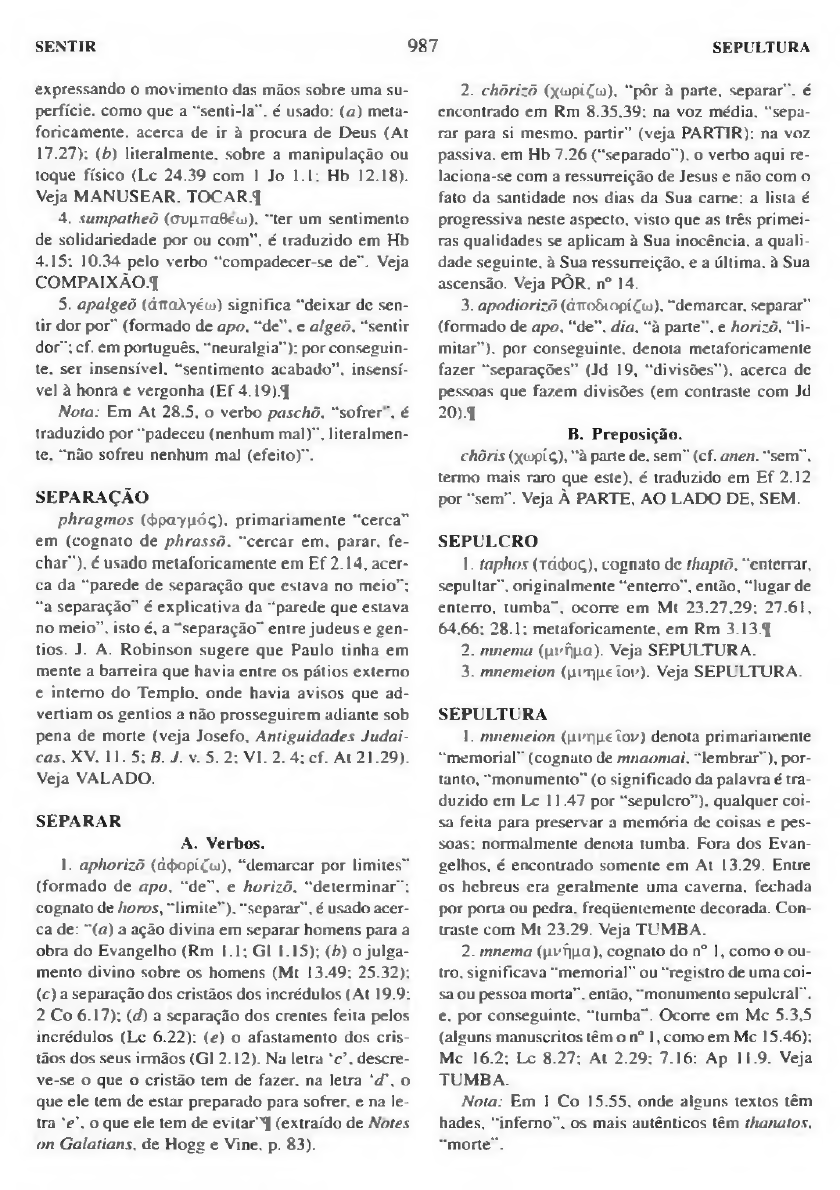 SENTIR 987 SEPULTURA expressando o movimento das mãos sobre uma su perfície. como que a “senti-la", é usado: (a) meta foricamente. acerca de ir à procura de Deus (At 17.27): (b) literalmente, sobre a manipulação ou toque físico (Lc 24.39 com 1 Jo 1.1: Hb 12.18). Veja MANUSEAR. TOCAR.! 4. sumpatheõ (<JU|i7Ta0€iu). “ter um sentimento de solidariedade por ou com", é traduzido em Hb 4.15: 10.34 pelo verbo “compadecer-se de". Veja COMPAIXÃO.^ 5. apalgeõ (dTraXyéco) significa “deixar de sen tir dor por" (formado de apo, “de", e algeõ, “sentir dor“ : cf. em português, “neuralgia"): por conseguin te. ser insensível, “sentimento acabado”, insensí vel à honra e vergonha (E f 4.19).! Nota: Em At 28.5. o verbo paschõ. “sofrer*, é traduzido por “padeceu (nenhum mal)", literalmen te. “não sofreu nenhum mal (efeito)". SEPA R A Çà O phragmos (4>payiióç), prim ariam ente “cerca” em (cognato de phrassõ . “cercar em , parar, fe char”), 6 usado m etaforicamente em E f 2.14, acer ca da “parede de separação que estava no meio” ; “a separação” é explicativa da “parede que estava no meio”, isto é, a “separação" entre judeus e gen tios. J. A. Robinson sugere que Paulo tinha em mente a barreira que havia entre os pátios externo e interno do Templo, onde havia avisos que ad vertiam os gentios a não prosseguirem adiante sob pena de morte (veja Josefo, Antiguidades Judai cas , XV. 11. 5; B. J. v. 5. 2: VI. 2 .4 ; cf. A l 21.29). Veja VALADO. SEPARA R A. Verbos. 1. aphorizõ (d<f>opíCüj), “demarcar por limites" (form ado de apo, “de” , e horizõ, “determ inar” : cognato de horos, “ limite”), “separar” , é usado acer ca de: “(a) a ação divina em separar homens para a obra do Evangelho (Rm 1.1; Gl 1.15); (b) o ju lga mento divino sobre os homens (Mt 13.49; 25.32); (c) a separação dos cristãos dos incrédulos (At 19.9: 2 Co 6.17); (d) a separação dos crentes feita pelos incrédulos (Lc 6.22): (e) o afastam ento dos cris tãos dos seus irmãos (Gl 2.12). Na letra ‘c \ descre ve-se o que o cristão tem de fazer, na letra U f, o que ele tem de estar preparado para sofrer, e na le tra V , o que ele tem de evitar”! (extraído de Notes on Galatians, de Hogg e Vine, p. 83). 2. chõrizõ (xüjpiCw). “pôr à parte, separar” , é encontrado cm Rm 8.35.39: na voz média, “sepa rar para si mesmo, partir” (veja PARTIR): na voz passiva, em Hb 7.26 (“separado"), o verbo aqui re laciona-se com a ressurreição de Jesus e não com o fato da santidade nos dias da Sua carne: a lisia é progressiva neste aspecto, visto que as três primei ras qualidades se aplicam à Sua inocência, a quali dade seguinte, à Sua ressurreição, e a última, à Sua ascensão. Veja PÔR. n° 14. 3. apodiorizô (dTro6iopí£uj), “demarcar, separar” (formado de apo, “de”, dia, “à parte” , e horizõ, “ li mitar” ). por conseguinte, denota metaforicamente fazer “separações” (Jd 19, “divisões”), acerca dc pessoas que fazem divisões (em contraste com Jd 20).! B. Preposição. chõris (xcopíç), “à parte de. sem” (cf. anen. “sem”, termo mais raro que este), é traduzido em E f 2.12 por “sem” . Veja À PARTE, AO LADO DE, SEM. SE PU L C R O 1. taphos ( tó ò o ç ), cognato dc thaptõ. “enterrar, sepultar", originalmente “enterro", então, “ lugar de enterro, tum ba“, ocorre em Mt 23.27.29: 27.61, 64.66: 28.1; metaforicamente, em Rm 3.13.! 2. mnema ( p i ^ a ) . Veja SEPULTURA. 3. mnemeion (p iiu ic tov ). Veja SEPULTURA. SEPULTURA 1. mnemeion (|ii'r||j.€lov) denota primariamente “memorial” (cognato de mnaomai, “lembrar"), por tanto, “monumento” (o significado da palavra é tra duzido cm Lc 11.47 por “sepulcro”), qualquer co i sa feita para preservar a memória de coisas e pes soas; normalmente denota tumba. Fora dos Evan gelhos, é encontrado somente cm At 13.29. Entre os hebreus era geralmente uma caverna, fechada por porta ou pedra, freqüentemente decorada. Con traste com Mt 23.29. Veja TUM BA. 2. mnema (^iyf|jia), cognato do n° 1, como o ou tro, significava “memorial” ou “registro de uma coi sa ou pessoa morta”, então, “monumento sepulcral” , e. por conseguinte, “tumba". Ocorre em Mc 5.3,5 (alguns manuscritos têm o n° 1, como em Mc 15.46): Mc 16.2; Lc 8.27; Al 2.29; 7.16: Ap 11.9. Veja TUM BA. Nota: Em 1 Co 15.55, onde alguns textos têm hades, “inferno”, os mais autênticos têm thanatos, “morte". SER BENIGNO 988 SER MELHOR SE R B EN IG N O A. A djetivos. 1. chrestos (xpnoTÓç). “útil. bom. agradável" (acerca de coisas), “bom, gracioso, gentil, benig no” (acerca de pessoas), é encontrado em Lc 6.35. em alusão a Deus; em E f 4.32, é ordenado aos cren tes. Veja BENIGNO. BOM. FÁCIL, MELHOR (2). 2. agathos (dyaBóç), "‘bom ’*, é usado no femini no em Tt 2.5. Veja BOM. B. Verbo. chresteuomai (xpTlOT€Úop.ai), cognato de A. n° 1, “ser amável, gentil*’, é dito acerca do am or (1 Co 13.4).! C . S ubstan tivos. 1. chresíoies (xprjoTÓTriç), cognato de A, n° I. e B, usado acerca da “bondade de coração, genero sidade, afabilidade, benignidade”, é encontrado cm 2 C o 6.6 ; Gl 5.22; E f 2.7; Cl 3.12; T t 3.4. Veja BOM. 2. philanthrõpia ((jn X ai^p u y rría ), form ado de philos. “amando”, e anthrõpos, “homem"; em por tuguês. “filantropia” ), denota “generosidade”, e é usado em At 28.2, acerca do que foi mostrado pe los habitantes de M alta aos viajantes que naufraga ram; em Tt 3.4, fala da “benignidade” de Deus para com os homens. Veja AM OR.! D. A dvérbio . philanthrõpõs ((juAcu^piòmoç), cognato de C. n° 2, “humanamente, benignamente”, é encontrado em At 27.3. Veja CORTESM ENTE.! SE R C O N V E N IE N T E A. Verbo. prepõ (ttp€ttü>) significa “salientar-se entre uma multidão, ser eminente, distinto por uma coisa*’, por conseguinte, “ser conveniente de acordo com as aparênci