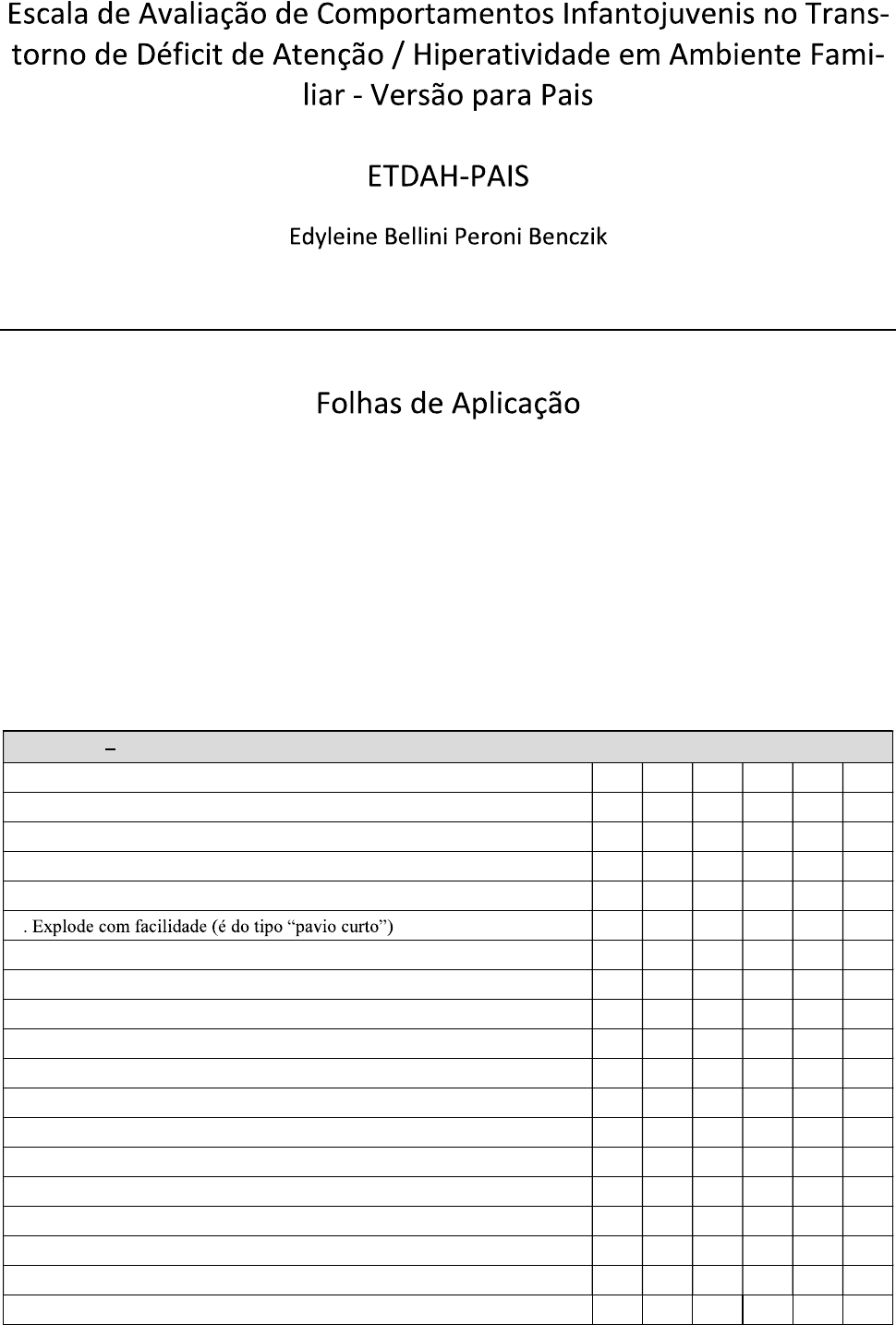 Abaixo estão alguns itens que descrevem comportamentos que seu filho ou sua filha pode apresentar. Consi- dere a frequência desses comportamentos no momento atual desde que eles ocorram nos últimos seis meses. Leia cada item cuidadosamente e assinale a opção que mais se adequar à sua opinião, indicando a frequência em que o comportamento ocorre, a saber: (1) Nunca; (2) Muito Pouco; (3) Pouco; (4) Geralmente, (5) Frequentemente e (6) Muito frequentemente. Não deixe nenhum em branco. FATOR 1 REGULAÇÃO EMOCIONAL (RE) 1. Faz amizade, mas não consegue mantê-la 1 2 3 4 5 6 2. Implica com tudo 1 2 3 4 5 6 3. Tem fortes reações emocionais (explosões de raiva) 1 2 3 4 5 6 4. É irritadiço (tudo o incomoda) 1 2 3 4 5 6 5. Muda facilmente de humor 1 2 3 4 5 6 6 1 2 3 4 5 6 7. Dá a impressão de estar sempre insatisfeito (nada o agrada) 1 2 3 4 5 6 8. É rebelde (não aceita nada) 1 2 3 4 5 6 9. É agressivo 1 2 3 4 5 6 10. Sente-se infeliz 1 2 3 4 5 6 11. Faz birra quando quer algo 1 2 3 4 5 6 12. Mostra-se tenso e rígido 1 2 3 4 5 6 13. Implica com os irmãos 1 2 3 4 5 6 14. As atividades e reuniões são desagradáveis 1 2 3 4 5 6 15. Todos têm que fazer o que ele quer 1 2 3 4 5 6 16. A hora de acordar e das refeições é desagradável 1 2 3 4 5 6 17. Exige mais tempo e atenção dos pais do que os outros filhos 1 2 3 4 5 6 18. Tem dificuldades para se adaptar às mudanças 1 2 3 4 5 6 19. É sensível 1 2 3 4 5 6 FATOR 2 HIPERATIVIDADE / IMPULSIVIDADE (HI) 1. Movimenta-se muito (parece estar ligado com um motor ou a todo vapor) 1 2 3 4 5 6 2. É inquieto e agitado 1 2 3 4 5 6 3. Mexe-se e contorce-se durante as refeições e para realizar as tarefas de casa 1 2 3 4 5 6 4. Tem sempre muita pressa 1 2 3 4 5 6 5. Age sem pensar (é impulsivo) 1 2 3 4 5 6 6. É inconsequente (não considera os perigos da situação) 1 2 3 4 5 6 7. Intromete-se em assuntos que não lhe dizem respeito 1 2 3 4 5 6 8. Responde antes de ouvir a pergunta inteira 1 2 3 4 5 6 9. É imprudente 1 2 3 4 5 6 10. Irrita os outros com suas palhaçadas 1 2 3 4 5 6 11. Tende a discordar com as regras e normas de jogos 1 2 3 4 5 6 12. É persistente e insiste diante de uma ideia 1 2 3 4 5 6 13. Faz os deveres escolares rápido demais 1 2 3 4 5 6 FATOR 3 COMPORTAMENTO ADAPTATIVO (CA) 1. Aceita facilmente regras, normas e limites 1 2 3 4 5 6 2. Parece ser uma criança tranquila e sossegada 1 2 3 4 5 6 3. É tolerante, quando preciso 1 2 3 4 5 6 4. Respeita normas e regras 1 2 3 4 5 6 5. É obediente 1 2 3 4 5 6 6. Obedece aos pais e as normas da casa 1 2 3 4 5 6 7. Sabe aguardar sua vez (é paciente) 1 2 3 4 5 6 8. Faz suas tarefas e almoça com bastante tranquilidade 1 2 3 4 5 6 9. Faz as coisas com muito cuidado, provendo todos os riscos de suas ações 1 2 3 4 5 6 10. Seu comportamento é adequado socialmente 1 2 3 4 5 6 11. Fala pouco 1 2 3 4 5 6 12. A criança permite que o ambiente familiar seja tranquilo e harmonioso 1 2 3 4 5 6 13. Consegue expressar claramente os seus pensamentos 1 2 3 4 5 6 14. É atento quando conversa com alguém 1 2 3 4 5 6 FATOR 4 ATENÇÃO (A) 1. É independente para realizar as suas tarefas de casa 1 2 3 4 5 6 2. É distraído com quase tudo 1 2 3 4 5 6 3. Evita atividades que exigem esforço mental constante (deveres escolares, jogos). 1 2 3 4 5 6 4. Esquece rápido o que acabou de ser dito 1 2 3 4 5 6 5. Inicia uma atividade com entusiasmo e dificilmente chega ao final (é do tipo fogo de palha) 1 2 3 4 5 6 6. Tem dificuldade para realizar as coisas importantes (lição, por exemplo) 1 2 3 4 5 6 7. Não termina o que começa 1 2 3 4 5 6 8. Parece sonhar acordado (estar no mundo da lua) 1 2 3 4 5 6 9. Mostra-se concentrado apenas em atividades de seu interesse 1 2 3 4 5 6 10. Dá a impressão de que não ouve bem (só escuta o que quer) 1 2 3 4 5 6 11. Dificilmente observa detalhes 1 2 3 4 5 6 12. Ocorrem discussões entre os pais e a criança, em função da falta de res- ponsabilidade e da falta de senso de dever 1 2 3 4 5 6