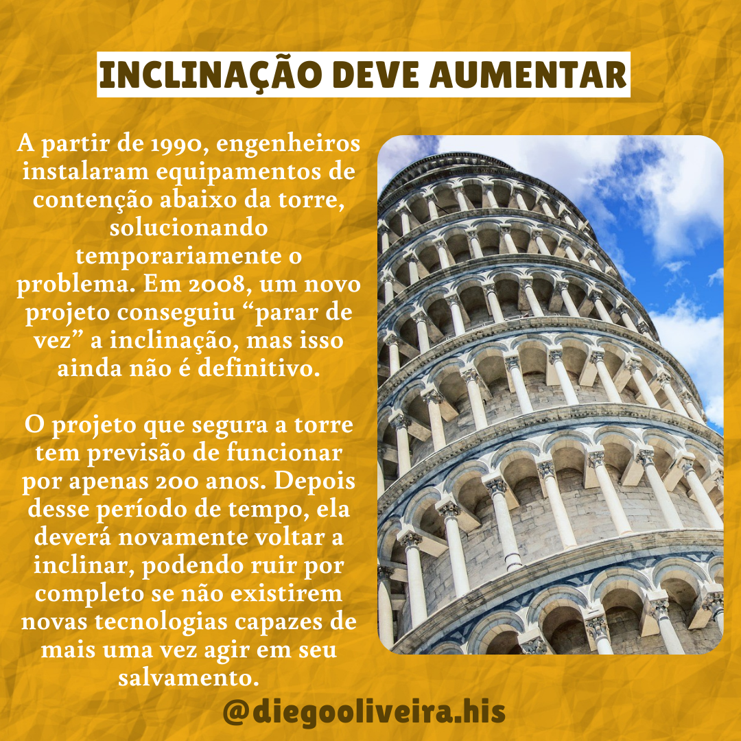 INCLINAÇÃO DEVE AUMENTAR A partir de 1990, engenheiros instalaram equipamentos de contenção abaixo da torre, solucionando temporariamente problema. Em 2008, um novo projeto conseguiu "parar de vez" a inclinação, mas isso ainda não é definitivo. O projeto que segura a torre tem previsão de funcionar por apenas 200 anos. Depois desse período de tempo, ela deverá novamente voltar a inclinar, podendo ruir por completo se não existirem novas tecnologias capazes de mais uma vez agir em seu salvamento. @diegooliveira.his