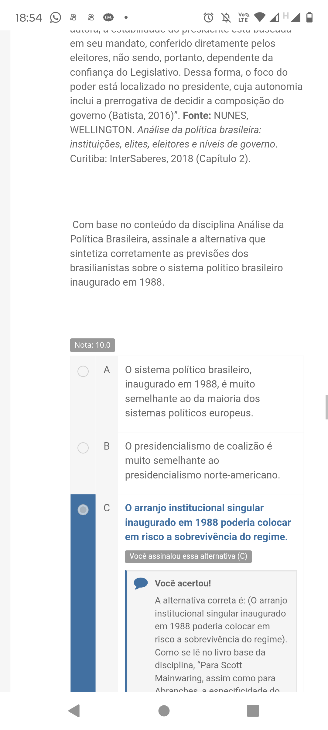 18:54 1 H LTE em seu mandato, conferido diretamente pelos eleitores, não sendo, portanto, dependente da confiança do Legislativo. Dessa forma, o foco do poder está localizado no presidente, cuja autonomia inclui a prerrogativa de decidir a composição do governo (Batista, 2016)". Fonte: NUNES, Análise da política brasileira: instituições, elites, eleitores e níveis de governo. Curitiba: InterSaberes, 2018 (Capítulo 2). Com base no conteúdo da disciplina Análise da Política Brasileira, assinale a alternativa que sintetiza corretamente as previsões dos brasilianistas sobre o sistema político brasileiro inaugurado em 1988. Nota: 10.0 A sistema político brasileiro, inaugurado em 1988, é muito semelhante ao da maioria dos sistemas políticos europeus. B presidencialismo de coalizão é muito semelhante ao presidencialismo norte-americano. C o arranjo institucional singular inaugurado em 1988 poderia colocar em risco a sobrevivência do regime. Você assinalou essa alternativa (C) Você acertou! A alternativa correta é: arranjo institucional singular inaugurado em 1988 poderia colocar em risco a sobrevivência do regime). Como se lê no livro base da disciplina, "Para Scott Mainwaring, assim como para