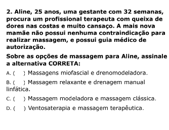 2. Aline, 25 anos, uma gestante com 32 semanas, procura um profissional terapeuta com queixa de dores nas costas e muito cansaço. A mais nova mamãe não possui nenhuma contraindicação para realizar massagem, e possui guia médico de autorização. Sobre as opções de massagem para Aline, assinale a alternativa CORRETA: A. ( ) Massagens miofascial e B. ( ) Massagem relaxante e drenagem manual linfática. C. ) Massagem modeladora e massagem D. ( ) Ventosaterapia e massagem terapêutica.
