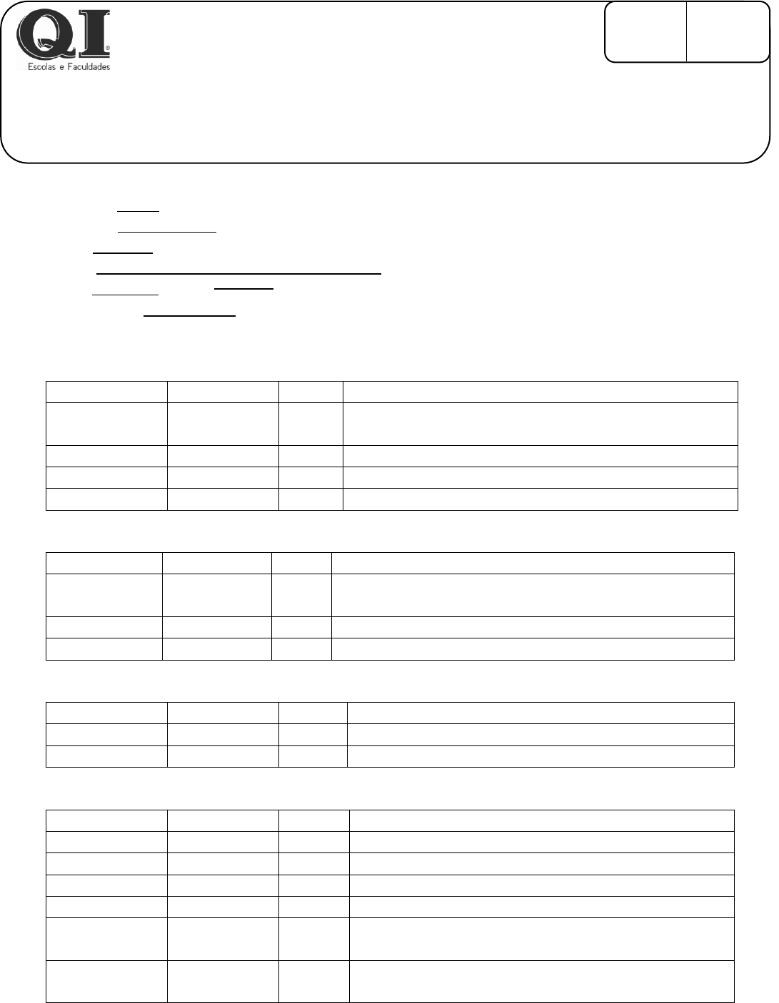 Professor(chapa, nome, telefone, email) Disciplina(cod_disciplina, nome, carga_horaria) Turno(id_turno, descricao) Turma(cod_turma, turno, disciplina, professor, ano_inicio, semestre) Aluno(matricula, nome, telefone) Aluno_turma(turma, aluno, N1, N2) DICIONÁRIO DE DADOS Professor Coluna Tipo de dado Limite Descricao Chapa Numérico 3 Auto incrementável, preenchimento com zeros nos espaços em branco Nome Alfanumérico 40 [A-Z,a-z] Telefone Alfanumérico 10 [0-9] Email Alfanumérico 40 [a-z,@,.] Disciplina Coluna Tipo de dado Limite Descricao Cod_disciplina Inteiro 3 Auto incrementável, preenchimento com zeros nos espaços em branco Nome Alfanumérico 20 [A-Z,a-z] Carga_horaria Decimal Turno Coluna tipo de dado Limite Descricao Id_turno Alfanumérico 1 [M,T,N] Descricao Alfanumérico 5 [A-Z,a-z] Turma Coluna Tipo de dado Limite Descricao Cod_turma Numérico 4 Preenchimento com zeros nos espaços em branco Turno Alfanumérico 1 Referencia a tabela turno Ano_inicio Numérico 4 [0-9] Semestre Numérico 2 Preenchimento com zeros nos espaços em branco. Disciplina Numérico 3 Preenchimento com zeros nos espaços em branco. Referencia a tabela Disciplina. Professor Numérico 3 Preenchimento com zeros nos espaços em branco. Referencia a tabela Professor. Nome: ..................................................................................................... Professor: ............................................ Unidade / Turno: .................................................................................... Data:.................................................... TÉCNICO EM INFORMÁTICA BANCO DE DADOS I Atividade N2 – Parte 1 PESO NOTA 3,5 Aluno Coluna Tipo de dado Limite Descricao Matricula Numérico 7 [0-9] Nome Alfanumérico 30 [A-Z,a-z] Telefone Alfanumérico 12 [0-9] Aluno_turma Coluna Tipo de dado Limite Descricao Turma Numérico 4 Referencia a tabela Turma Aluno Numérico 7 Referencia a tabela Aluno N1 Decimal N2 Decimal DADOS PARA INSERIR Professor chapa nome telefone email 001 Aline 95478521 aline.zenker@qi.edu.br 002 Andressa 94874787 andressa.dellay@qi.edu.br 003 Frodo 84214778 leandro.silva@qi.edu.br 004 Jonatas 94051980 jonatas.alcalay@qi.edu.br 005 Rita 81245478 rita.gaieski@qi.edu.br Disciplina cod_disciplina nome carga_horaria 001 Logica de Programaçao 133 002 Internet I 67 003 Banco de Dados I 33,5 004 Computacao Gráfica 67 005 Linguagem de Banco de Dados 33,5 006 Linguagem de Programacao Web 67 Turno id_turno descricao M Manhã T Tarde N Noite Turma cod_turma turno ano_inicio semestre disciplina professor 0547 M 2014 02 002 004 0235 M 2015 01 001 001 1475 T 2014 02 004 004 2698 N 2015 01 006 002 2173 N 2014 02 005 003 Aluno matricula nome telefone 2014159 Cassio 34841598 2014324 Amanda 34902476 2015817 Cristiano 2015369 Fernanda 34882014 2014474 Pablo 34698720 2014198 Luiza Aluno_turma turma aluno N1 N2 2698 2015369 6 7 1475 2014159 10 8 0547 2014474 5.5 7 2698 2015817 10 10 2173 2015369 9.5 9.8 2173 2014198 8 4.5 EXERCÍCIOS 1. Criar a base de dados Escola. 2. Criar as tabelas. 3. Inserir os dados nas tabelas. 4. Listar o nome dos professores. 5. Listar o nome das disciplinas e suas cargas horárias. 6. Selecione o nome dos professores e seus e-mails. 7. Atualize o ano de início das turmas que começaram em 2014 para 2017 e as de 2015 para 2018. 8. Atualize a carga horária das disciplinas de 33.5 horas para 38.5 horas. 9. Edite o telefone do aluno Cristiano para 34841687. 10. Exclua todas os registros que tenham nota N1 ou N2 abaixo de 6.0
