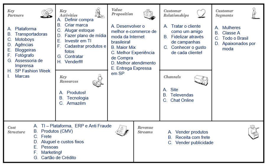 Key Key Value Customer Customer Partners Activities Proposition Relationships Segments A. Definir compra B. Criar marca A. Desenvolver A. Tratar cliente A. Plataforma A. Mulheres C. Alugar estoque melhor e-commerce de B. Transportadoras como um amigo B. Classe A D. Fazer plano de moda da Internet B. Fidelizar através C. Motoboys C. Todo o Brasil E. Investir em TI brasileira! de campanhas D. Agências F. Cadastrar produtos e D. Apaixonados por B. Maior Mix E. Bloggeiras C. Conhecer gusto moda fotos C. Melhor Experiência de cada cliente! F. G. Contratar G. Assessoria de de Compra H. Vender!!! D. Melhor atendimento Imprensa H. SP Fashion Week E. Entrega Expressa em SP I. Marcas Key Channels Resources A. Site A. Produtos! B. Televendas B. Tecnologia C. Chat Online C. Armazém Cost A. - Plataforma, ERP e Anti Fraude Revenue Structure B. Produtos (CMV) Streams A. Vender produtos C. Frete B. Receita com frete D. Aluguel e custos fixos C. Vender publicidade E. Pessoas F. Marketing! G. Cartão de Crédito