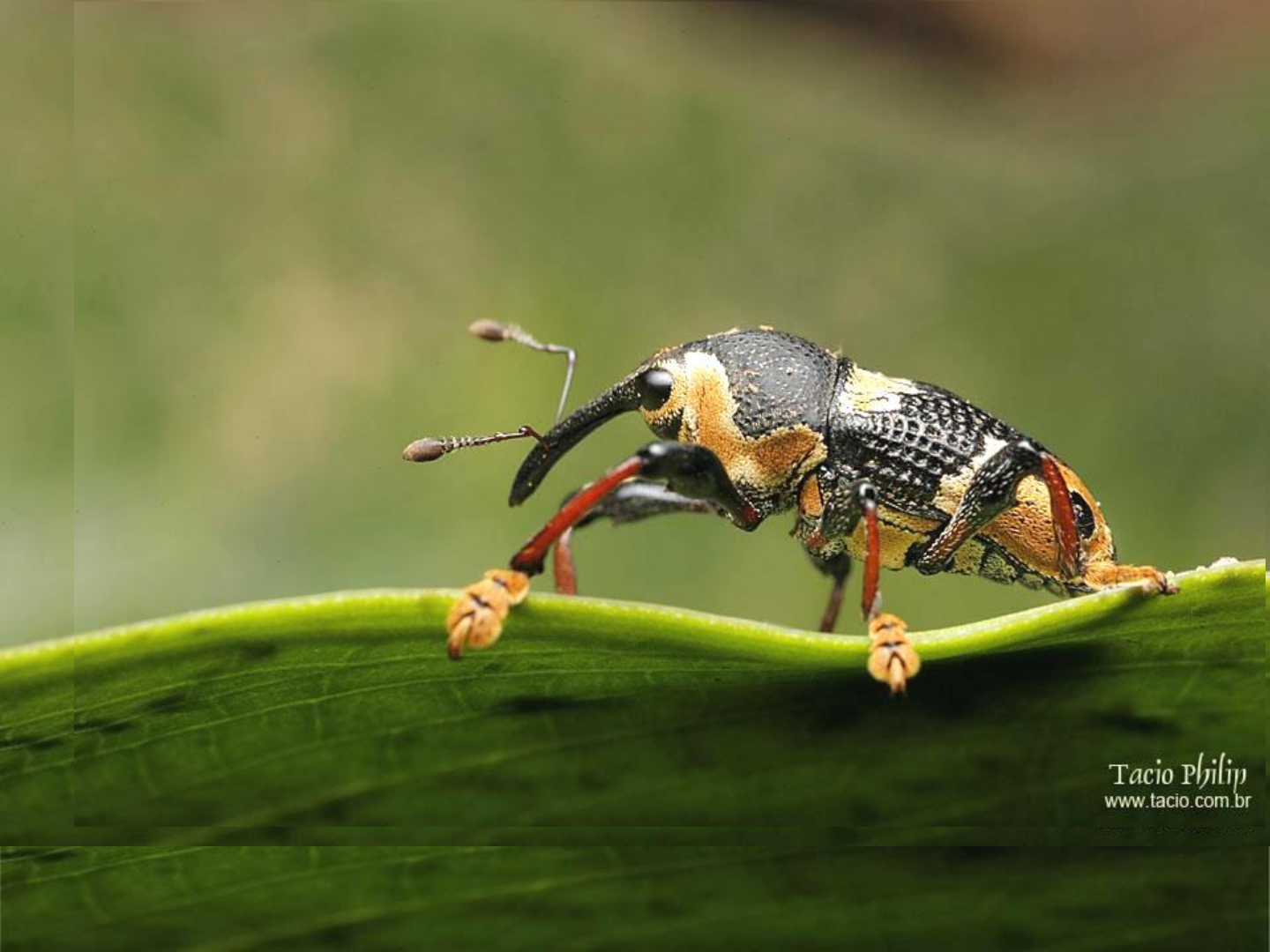 UNIVERSIDADE FEDERAL RURAL DE PERNAMBUCO ENTOMOLOGIA II COLEOPTERA Msc. Thiago J. Souza Alves COLEUS = caixa, estojo// PTERAS = Asas (ÉLITROS); Altamente ESCLEROTINIZADOS; Maior Ordem da Classe: 40% da classe insecta; Cerca de 350.000 espécies agrupadas em 150 famílias; Besouros, Joaninhas, Escaravelhos e vaga-lumes. (Gullan & Cranston 2008; Godinho Jr 2011) ORDEM COLEOPTERA Apresentam grande diversidade quanto ao tamanho do corpo, podendo medir de 0,4 mm até 20 cm. Ceutorhynchus hirtulus Titanus giganteus ORDEM COLEOPTERA HÁBITO : Fitófagos; Predadores (Hemolinfa); Coprófagos; Fungívoros; OBS : Exceto Hematofagia HABITAT: Aquático; subterrâneos; Copa das árvores,raízes; Folhagem; Parasitas(poucos) Alimentação bastante diversificada, variando de acordo com o hábito do invertebrado: HÁBITOS E HABITAT First report of Rhyzopertha dominica (F.) (Coleoptera: Bostrichidae), Oryzaephilus surinamensis (L.) (Coleoptera: Silvanidae), and Lasioderma serricorne (F.) (Coleoptera: Anobiidae) infesting rodenticide-treated grain baits Lasioderma serricorne Rhyzopertha dominica Oryzaephilus surinamensis A B C D First report of Rhyzopertha dominica (F.) (Coleoptera: Bostrichidae), Oryzaephilus surinamensis (L.) (Coleoptera: Silvanidae), and Lasioderma serricorne (F.) (Coleoptera: Anobiidae) infesting rodenticide-treated grain baits Danos oriundos da infestação dos coleópteros sobre os raticidas. Aberturas de galerias nos grãos (A e B), esfarelamento e deteriorização do produto (C) e desenvolvimento de fungos (D). MECANISMOS DE DEFESA DOS BESOUROS Ocultamento (Mimetismo e Camuflagem) Desenvolvimento no interior de estruturas vegetais Google.com TANATOSE MECANISMOS DE DEFESA DOS BESOUROS MECANISMOS DE DEFESA DOS BESOUROS CORPO ALTAMENTE ESCLEROTINIZADO MECANISMOS DE DEFESA DOS BESOUROS DEFESAS QUÍMICAS : BESOURO BOMBARDEIRO (Brachynus crepitans ) H2O2 + Hidroquinona + Catalase + Peroxidase DEFESA EXPLOSIVA ANATOMIA EXTERNA ANTENAS ANTENAS MANDIBULADO – Menognatos – Hipo/Prognatos AA = ÉLITROS AP = MEMBRANOSAS TIPOS DE ASAS BRAQUIÉLITROS TIPOS DE PERNAS AMBULATORIAIS FOSSORIAIS NATATÓRIAS Através de Caracteres secundários: Tamanho do corpo, antenas, presença de cornos, desenvolvimento das mandíbulas etc. DIMORFISMO SEXUAL Aparelho digestivo varia de acordo com o regime alimentar; Reprodução sexuada; Ovíparos (maioria); Desenvolvimento Holometabólico. FISIOLOGIA HOLOMETABOLIA TIPOS DE LARVAS CAMPODEIFORME CARABIFORME ESCARABEIFORME PUPA LIVRE/ EXARADA IMPORTÂNCIA DOS COLEÓPTEROS PRAGAS AGRÍCOLAS PRAGAS /GRÃOS ARMAZENADOS PRAGAS DE GRÃOS ARMAZENADOS DERMATOSES/ POTÓ POLINIZAÇÃO CONTROLE BIOLÓGICO BESOUROS COPRÓFAGOS 4 SUBORDENS ARCHOSTEMATA MYXOPHAGA ADEPHAGA POLYPHAGA SUBORDENS/COLEOPTERA 7-17 mm Antenas Filiformes Cerca de 30 espécies Tenomerga cinereus Menos de 1mm Antenas Clavadas Cerca de 20 espécies Hydroscapha natans Sphaerius sp ARCHOSTEMATA MYXOPHAGA ADEPHAGA vs POLIPHAGA Urosternito basal dividido em 2 partes pelas coxas posteriores; Suturas notopleurais presentes; Em geral, predadores. Urosternito basal não dividido pelas coxas posteriores; Suturas notopleurais ausentes; Reúne a maioria das famílias (+ de 90% das espécies de coleópteros). ADEPHAGA Élitros com Finos sulcos longitudinais Mandíbulas bem visíveis e desprovidas de dentes Pernas longas Cabeça mais estreita que o pronoto CARABIDAE CICINDELIDAE Mandíbulas bem desenvolvidas e com longos dentes Olhos grandes e salientes Cabeça mais larga que o pronoto Pernas longas e ambulatoriais GYRINIDAE P1 Alongadas (AMBULATORIAIS) P2 e P3 = curtas e achatadas ( NATATORIAIS) 2 Pares de olhos (dorsal/ventral) Aquáticos e Coloração escura POLYPHAGA HYDROPHILIDAE Palpos maxilares alongados Aquáticos e Corpo oval P2 E P3 Natatórias Élitros pretos, lisos e brilhantes Carena ventral no tórax STAPHYLINIDAE Saprófagos (Maioria) DERMATOSES Prognata BRAQUIÉLITROS Corpo alongado Extremidade do abdome levantada durante o caminhamento Tíbias P1 dilatas e com extremidades denteadas Larvas Escarabeiforme (pão-de-galinha) Antenas Lameladas (lamelas móveis) SCARABAEIDAE PASSALIDAE Élitros com ranhuras longitudinais Constrição separa os élitros do Protórax Corpo achatado, alongado, preto e brilhante Antenas Lameladas (lamelas fixas) BUPRESTIDAE Coloração metálica (geralmente) Antenas curtas e serreadas Corpo bastante esclerotinizado Élitros afilando em direção a extremidade terminal LYCIDAE Élitros moles e com nítidas estrias longitudinais Corpo alongado LAMPYRIDAE Últimos urômeros com luminescência (LUCIFERASE) Pronoto encobre totalmente a cabeça MELOIDAE Corpo alongado,fino e pouco esclerotinizado; Cabeça bem separada do Tórax; Pronoto mais estreito do que os élitros; Pernas longas CHRYSOMELIDAE Vaquinhas : Fitófagas (fases adulta e larval) Corpo ovalado Bastante coloridas e brilhantes; Cabeça total ou parcialmente escondida pelo Protórax Antenas curtas Tarsos Criptopentâmeros (Aparentemente 4-4-4, porém 5-5-5) CERAMBYCIDAE Serradores ou Serra-paus Corpo Longo e cílíndrico Antenas maiores que a metade do comprimento do corpo e inseridas numa protuberância frontal Tarsos Criptopentâmeros(4-4-4 = 5-5-5); Larvas Cerambiciformes COCCINELLIDAE Joaninhas Corpo oval e esférico Protórax encobre a cabeça Tarsos Criptotetrâmeros (3-3-3 = 4-4-4) Antenas curtas e capitadas; Larvas campodeiformes; Predadoras (maioria) = C. Biológico TENEBRIONIDAE Coloração uniforme preto fosco ou marrom Corpo alongado Tarsos Heterômeros (5-5-4) Larvas elateriformes Pragas de grãos armazenados DERMESTIDAE Pequenos Corpo ovalado recoberto de pêlos ou escamas Antena curta e capitada Causa danos a coleções entomológicas, tapetes, couros,cereais, grãos armazenados, plantas e animais BOSTRICHIDAE Corpo cilíndrico Élitros fortemente esclerotinizados , achatados na parte posterior de forma característica Coloração parda ou escura BRUCHIDAE Corpo ovalado Élitro encurtado expondo a extremid