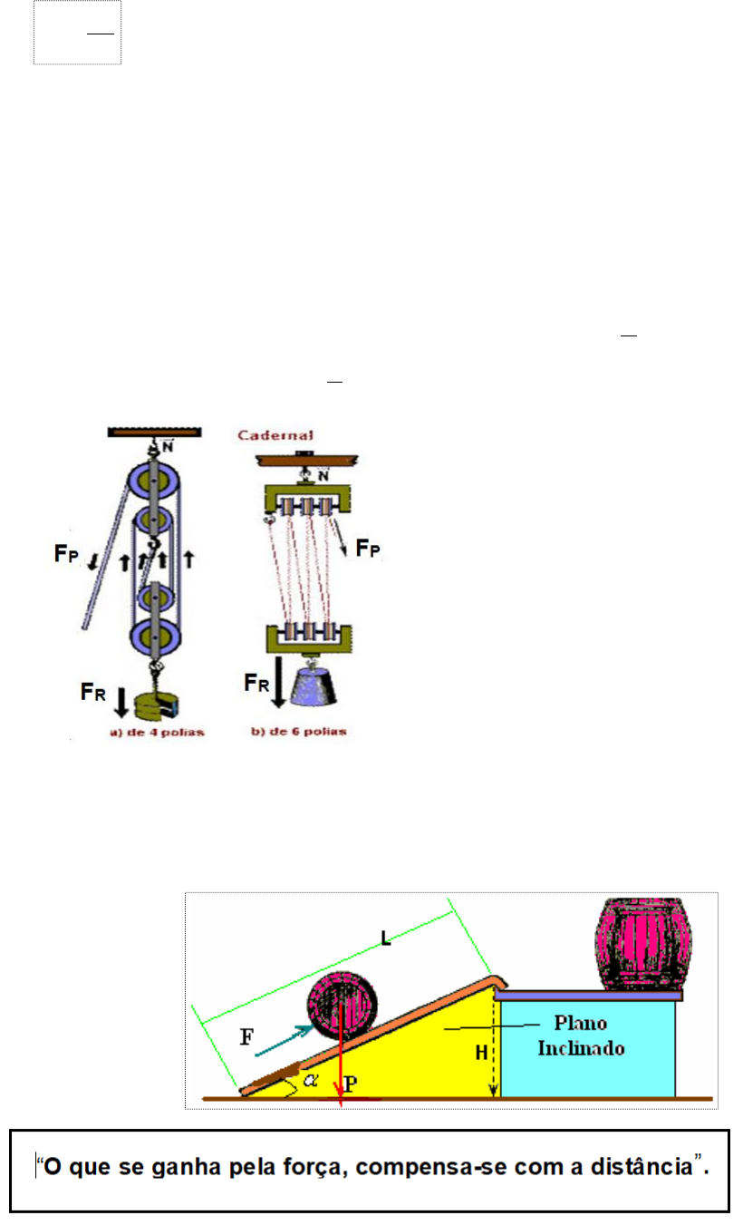 Meu caderno de actividade de Física-9ªClasse MINEDH-DINES 21 6.3.2. Cardinal O outro modo de aumentar a vantagem mecânica das roldanas consiste na associação de várias roldanas fixas (num único bloco) com várias roldanas móveis (todas num mesmo bloco). A este tipo de associação dá-se o nome de cardenal. Há várias maneiras de associar as roldanas em cardenais; eis algumas: Para cardenal de 4 roldanas (duas fixas + duas móveis) tem-se , para cardenal de 6 roldanas (três fixas e três móveis) tem-se etc. 7. Plano inclinado São superfícies planas, rígidas, inclinadas º90 90) em relação à horizontal, que servem para multiplicar forças, constituindo, portanto, máquinas simples. n R p 2 F F móveis roldanas de número o é n :onde Meu caderno de actividade de Física-9ªClasse MINEDH-DINES 22 Em conformidade com a antiga lei áurea da mecânica (Lei de Ouro da mecânica) que dizia: A vantagem mecânica do plano inclinado depende da relação entre o comprimento do plano e a sua altura. 8. Sarilho É um tipo de máquina simples que também tem a finalidade de multiplicar forças. O sarilho é composto por um cilindro metálico ou de madeira que pode girar em torno de um eixo horizontal, accionado por uma manivela. Sobre o cilindro enrola-se uma corda na qual uma das suas extremidades está fixa ao cilindro e na outra se suspendem corpos que se pretendem elevar, baixar ou equilibrar, sendo necessário aplicar na manivela do sarilho uma força potente para fazer girar o cilindro. Onde: Rm → raio ou comprimento da manivela (bp) Rc → raio do cilindro (bR) O funcionamento de um sarilho é semelhante ao de uma alavanca interfixa. Por analogia, pode-se escrever a condição de equilíbrio de um sarilho da seguinte maneira: Meu caderno de actividade de Física-9ªClasse MINEDH-DINES 23 9. Algumas aplicações de máquinas simples As máquinas simples são importantes para a vida do homem, pois elas auxiliam o homem a realizar trabalhos tais como: Levantar corpos pesados aplicando menor força, elevar blocos de pedra, fardos, carros, camiões, barris, caixotes, etc; Extrair água do poço; Transportar cargas, diminuindo o esforço humano. II. Exercícios resolvidos 1. Durante as aulas de física falámos sobre máquinas simples. Observe as figuras abaixo e escreva o nome de cada máquina nelas representada. 2. A figura mostra a Rita a equilibrar uma pedra grande através de uma alavanca. a. Que tipo de alavanca está representada na figura? b. Calcule o valor da força exercida pela Rita (força potente). 3. Sobre a figura abaixo, é correcto afirmar que: a. É uma talha e tem 3 roldanas; b. É um cadernal e tem 3 roldanas móveis; c. É uma talha e tem 3 roldanas móveis; d. É um cadernal e tem 3 roldanas; e. As alíneas a) e c) estão correctas. N 2000FR ?PF m 0,5 m 2,5 Pedra Rita Menina Meu caderno de actividade de Física-9ªClasse MINEDH-DINES 24 Resolução: A Roldana Móvel B Sarinho C Alavanca Inter-fixa D Plano inclinado III. Exercícios de aplicação 1. Aplicando a sua inteligência, o homem busca, constantemente, a maneira de aproveitar ao máximo a sua força. Dê dois exemplos de máquinas simples que permitem ao homem aplicar as suas ideias. 1.2. A figura representa uma alavanca. De acordo com as condições da figura, calcule o valor da força F1 necessária para equilibrar a força F2 1.3. A figura representa o Sr. Lúcio com o seu sobrinho Francisco a brincarem num baloiço de um parque de diversões. De acordo com as condições da figura, responda às questões que se seguem. a. Que tipo de alavanca representa o baloiço? b. Calcule a distância que o Francisco está sentado do centro do baloiço, sabendo que este está em equilíbrio. 3. Durante as aulas de Física, o professor falou de máquinas simples. a. Defina, por palavras suas, uma roldana: Fixa; Móvel. b. Explique por palavras suas a diferença entre uma roldana fixa e móvel. c. Qual delas é mais vantajosa? E justifique porquê? d. Indique cinco (5) aplicações de roldanas na vida diária. Meu caderno de actividade de Física-9ªClasse MINEDH-DINES 25 4. Observe com atenção as seguintes figuras e responda às questões que se seguem. a. Indique o nome de cada máquina simples. b. Calcule, em cada caso, o valor da incógnita, sabendo que estão em equilíbrio os sistemas e, em seguida, calcule as massas de cada corpo. (use 2/10 smg ) c. Qual das máquinas é mais vantajosa? Porquê? 5. Para aumentar as vantagens mecânicas das roldanas, elas são usadas em forma associada. a. Quantas maneiras de associar as roldanas você conhece? Defina pelo menos uma das maneiras. b. De que depende a força que deve ser aplicada numa talha para mantê-la em equilíbrio, se a força a ser equilibrada for constante? 6. Observe com muita atenção as seguintes figuras. a. Indique o nome de cada máquina simples. b. Quantas roldanas móveis têm cada máquina simples? E quantas fixas? c. Qual é a importância das máquinas simples na vida do homem? d. Determine o valor da força RF em cada caso e massa de cada corpo, sabendo que os sistemas estão em equilíbrio. (use 2/10 smg ). 7. As figuras que se seguem representam sistemas constituídos por uma alavanca e uma roldana. Determine, os valores das incógnitas, em cada caso, para que os sistemas fiquem em equilíbrio. Meu caderno de actividade de Física-9ªClasse MINEDH-DINES 26 8. O raio do cilindro de um certo sarilho mede cm4 e o comprimento da manivela mede cm28 . Que força será necessário aplicar na manivela do sarilho para que se possa equilibrar um fardo com o peso N630 ? 9. O raio do cilindro de um determinado sarilho é 6 vezes menor que o raio da manivela. Qual deve ser a intensidade da força a aplicar na manivela desse sarilho para que se possa equilibrar um balde com a massa de 6.6Kg. (use 2/10 smg ). 10. Observe com muita atenção as figuras abaixo. A alternativa que contém os tipos dessas alavancas, respectivamente, é: A Inter-resistent