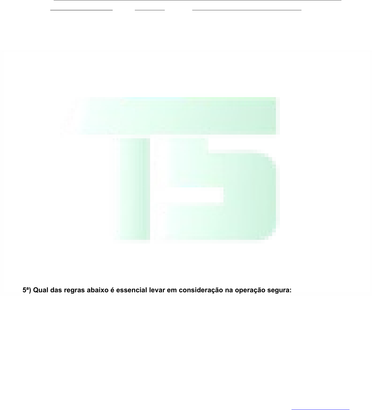 1ª) São considerados equipamentos de elevação para trabalhos em altura a) Plataformas de trabalhos aéreos b) Plataformas fixas c) Guindastes d) Nenhuma das alternativas 2ª) Entre os , destacam-se: a) Relatórios de Inspeção para Iançamentos Críticos b) Relatórios de Inspeção Diária c) Equipamentos de elevação d) Nenhuma das alternativas 3ª) Quais as normas que tratam das plataformas de trabalho aéreo e equipamentos de força motriz própria? a) NR11 E NR18 b) NR2 E NR4 c) NR7 E NR9 d) Nenhuma das alternativas 4ª) A das PTA`s deve estar sempre a disposição dos trabalhadores capacitados e autorizados: a) Inspeção de guindaste b) Inspeção diária c) Capacidade de carga d) Nenhuma das alternativas AVALIAÇÃO OPERADOR DE PLATAFORMA ELEVATÓRIA Nome: Data: / / Nota: Instrutor 5ª) Qual das regras abaixo é essencial levar em consideração na operação segura: a) Capacidade de carga b) Estrutura rígida c) Equalizadores d) Nenhuma das alternativas Tesseg Soluções em Segurança e Saúde do Trabalho e-mail: comercial@tesseg.com.br 11-4308-0131 6ª) Os operadores devem a) Sinalizar a linha de produção durante trabalhos externos b) Não fazer nada pq a PTA é muito segura c) Sinalizar e isolar o local do trabalho d) Nenhuma das alternativas 7ª) O das PTA`s deve ser livre de projeções que possam danificar os cabos e o sistemas hidráulico e de tração. a) Tambor b) Motor c) Equalizador d) Nenhuma das alternativas 8ª) A reza que numa PTA pode chegar a comportar dois trabalhadores e uma caixa de ferramentas com segurança. a) Capacidades de carga b) Talhas pneumáticas c) Talhas manuais d) Nenhuma das alternativas 9ª) Qual das opções abaixo é indispensável durante a operação de uma PTA? a) Lanças do guindaste b) luva de proteção química c) Cinturão de segurança e talabarte d) Nenhuma das alternativas 10ª) Correias, engrenagens, eixos, polias, dentes de roda, fuso, tambores, joystick, bateria, e outras partes móveis de equipamentos deverão ser reparados ou inspecionados pelo quando constituírem um perigo. a) Engenheiros b) Manutencista responsável c) Motores d) Nenhuma das alternativas Boa Prova!!! image3.png image1.png image2.png