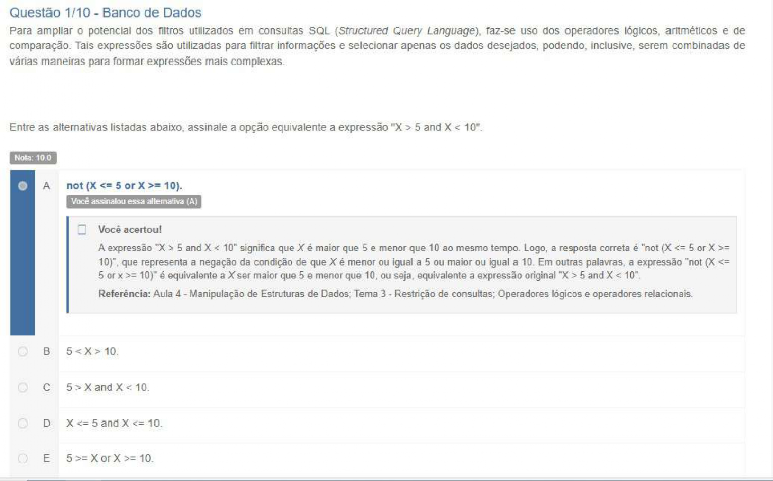 Questão 1/10 - Banco de Dados Para ampliar o potencial dos filtros utilizados em consultas SQL (Structured Query Language), faz-se uso dos operadores lógicos, aritméticos e de comparação. Tais expressões são utilizadas para filtrar informações e selecionar apenas os dados desejados, podendo, inclusive, serem combinadas de várias maneiras para formar expressões mais complexas. Entre as alternativas listadas abaixo, assinale a opção equivalente a expressão "X > 5 and X < 10". A not(X<=50rX>=10). Você assinalou essa allemativa (A) Você acertou! A expressão "X > 5 and X < 10" significa que X é maior que 5 e menor que 10 ao mesmo tempo. Logo, a resposta correta é "not (X <= 5 or X >= 10)", que representa a negação da condição de que X é menor ou igual a 5 ou maior ou igual a 10. Em outras palavras, a expressão "not (X <= 5 or x >= 10)" é equivalente a X ser maior que 5 e menor que 10, ou seja, equivalente a expressão original "X > 5 and X < 10”. Referência: Aula 4 - Manipulação de Estruturas de Dados; Tema 3 - Restrição de consultas; Operadores lógicos e operadores relacionais. B 5<X>10. C 5>XandX<10. D X<=5andX <=10. E 5>=XorX>=10. Questão 2/10 - Banco de Dados A cláusula order by é usada em consultas SQL (Structured Query Language) para classíficar os resultados em ordem crescente ou decrescente. Com base nessa informação, analise o seguinte enunciado: Considere uma tabela "Pedido”, a qual contém as seguintes colunas: "pedidold", "clienteld", "produtoid”, "dataPedido" e "valorPedido". Assinale a alternativa em que cláusula order by é utilizada para classificar a tabela "Pedido" pelo valor do pedido em ordem crescente e, em caso de valores iguais, pela data do pedido em ordem decrescente. A select*from Pedido order by valorPedido desc, dataPedido; B select*from Pedido order by valorPedido, dataPedido desc; Vocé acertou! Nesta consulta, a clausula order by é usada para classificar a tabela "Pedido” pelo valor do pedido (valorPedido) em ordem crescente e, em caso de valores iguais, pela data do pedido (dataPedido) em ordem decrescente. A clausula order by segue a ordem das colunas especificadas na consulta. Logo, a ordem do valor do pedido vem antes da ordem da data do pedido. Isso significa que os valores do pedido serdo classificados primeiro e, em caso de valores iguais, a data do pedido sera usada como critério de desempate para classificar os resultados. Vale salientar que a classificacdo padrão é ascendente (asc) e, dessa forma, sua declaragao é opcional. Referéncia: Aula 4 - Manipulacéo de Estruturas de Dados; Tema 3 - Restrição de consultas; Order by. Questão 3/10 - Banco de Dados Em um Banco de Dados relacional, as triggers são procedimentos armazenados que são acionados automaticamente quando uma determinada ação ocorre em uma tabela, como inserção, atualização ou exclusão de dados. Ha duas formas de definir as triggers (padrão SQL ANSI), em nivel de linha e em nivel de instrução. Assinale a alternativa que descreve corretamente as diferenças entre os dois tipos de triggers. A Uma trigger em nivel de linha é executada uma vez para cada linha afetada por uma instrução, enquanto uma trigger em nivel de instrução é executada apenas uma vez por instrução. Você assinalou essa attermativa (A) Você acertou! Uma trigger em nivel de linha é executada uma vez para cada linha que é afetada por uma instrução. Por exemplo, ao atualizar cinco linhas em uma tabela com uma trigger em nivel de linha, a trigger será acionada cinco vezes, uma vez para cada linha afetada. No caso da frigger em nivel de instrucdo, a mesma é executada apenas uma vez por instrucdo. Por exemplo, ao atualizar cinco linhas em uma tabela com uma frigger em nivel de instrucdo, a trigger sera acionada apenas uma vez, independentemente do numero de linhas afetadas. Referéncia: Aula 6 - Procedimentos Armazenados; Tema 2 - Trigger, Trigger. B Uma trigger em nivel de linha é executada apenas uma vez por instrucdo. enquanto uma trigger em nivel de instrucdo é executada uma vez para cada linha afetada por uma instrução. C Ambas as friggers, em nivel de linha e em nivel de instrução, sdo executadas uma vez para cada linha afetada por uma instrução. D Ambas as triggers, em nivel de linha e em nivel de instrução, sdo executadas apenas uma vez por instrugdo, independentemente do Questão 4/10 - Banco de Dados Em um Banco de Dados, geralmente, tem-se acesso a enormes quantidades de dados que estão em constante crescimento. Por essa razão, as funções de sintetização e de sumarização são fundamentais para o funcionamento de qualquer Banco de Dados, pois permitem agregar dados de várias fontes e transforma-los em informações mais concisas e faceis de entender, tornando possivel a tomada de decisGes com base em dados precisos e atualizados, além de identificar padrões e tendéncias importantes. Com base nessa informacéo, assinale a alternativa que corresponde a funcdo que retorna o valor médio de um grupo de registros selecionados com a clausula sefect. Nota: 10.0 A Avg Vocé acertou! A funcdo avg() retorna a média dos valores de uma coluna predefinida. Com o uso da cldusula where, inclusive, é possivel estabelecer uma condição para determinados valores da coluna. Referéncia: Aula 5 - Comandos Avancados; Tema 4 - Agregacao/Extracao de dados; Avg(). B Sum C Between. D Distinct. E Tim Questão 5/10 - Banco de Dados Nas atividades desenvolvidas em um Banco de Dados, é comum existirem scripts que são executados para diversas finalidades diferentes, os quais podem ser armazenados no Banco de Dados, a fim de estarem disponíveis para serem executados quando for necessário. Tais scrípts são denominados stored procedure. Assinale a alternativa que contém o comando utilizado para chamar ou executar uma stored procedure no MySQL. A select * from NomeProcedimento (parametro(s)): B execute NomeProcedimento (pardmetro(s)); C invoc