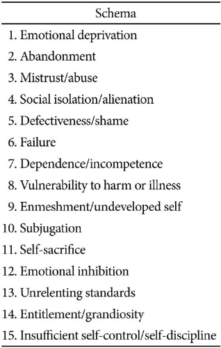 SOBRE A CORREÇÃO DO QUESTIONÁRIO DE ESQUEMAS (YOUNG) 1- ANÁLISE QUANTITATIVA Na versão curta do questionário há blocos de 5 itens por esquemas. Você deve somar os números informados pelo paciente, encontrando o escore final daquele bloco. A pontuação máxima é 30. Portanto, os esquemas que pontuarem entre 20 a 30 serão hierarquizados e logo selecionados para a próxima fase de análise. Obs: Se preferir, você pode calcular a porcentagem, sendo 30 pontos 100%, para transmitir esse dado ao paciente. Por exemplo: Terapeuta: Identificamos 73% de operação do esquema de abandono. Obs: Entendemos também que há um esquema disfuncional quando alcança 15 pontos. Trabalha-se os mais elevados em uma hierarquia de contribuição ao sofrimento e desajustamento. 2- ANÁLISE QUALITATIVA Nessa fase você deve entrevistar o paciente quanto aos esquemas identificados: O que isso comunica da sua história? Por que você se identificou com esse item? O que significa esse item para você? Obs: Ainda que um bloco não tenha concluído com a pontuação mínima, você pode investigar se há itens isolados que foram pontuados com 5 e 6, sinalizando forte identificação com tais cognições disfuncionais. Versão com siglas em português: pe - Privação Emocional ab - Abandono da - Desconfiança/Abuso ia - Isolamento Social/Alienação dv - Defectividade/Vergonha (inclui provavelmente a Indesejabilidade Social) fr - Fracasso di - Dependência/Incompetência vd - Vulnerabilidade a Danos e Doenças em - Emaranhamento sb - Subjugação as - Auto-Sacrifício ie - Inibição Emocional pi - Padrões Inflexíveis me - Merecimento ai - Autocontrole/ Autodisciplina Insuficientes Para quem estiver utilizando uma versão com as siglas em inglês, orientar-se pelos nomes originais dos esquemas: image1.jpeg