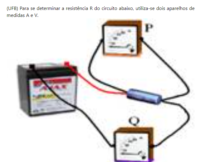 (UFB) Para se determinar a resistência R do circuito abaixo, utiliza-se dois aparelhos de medidas A e V. P