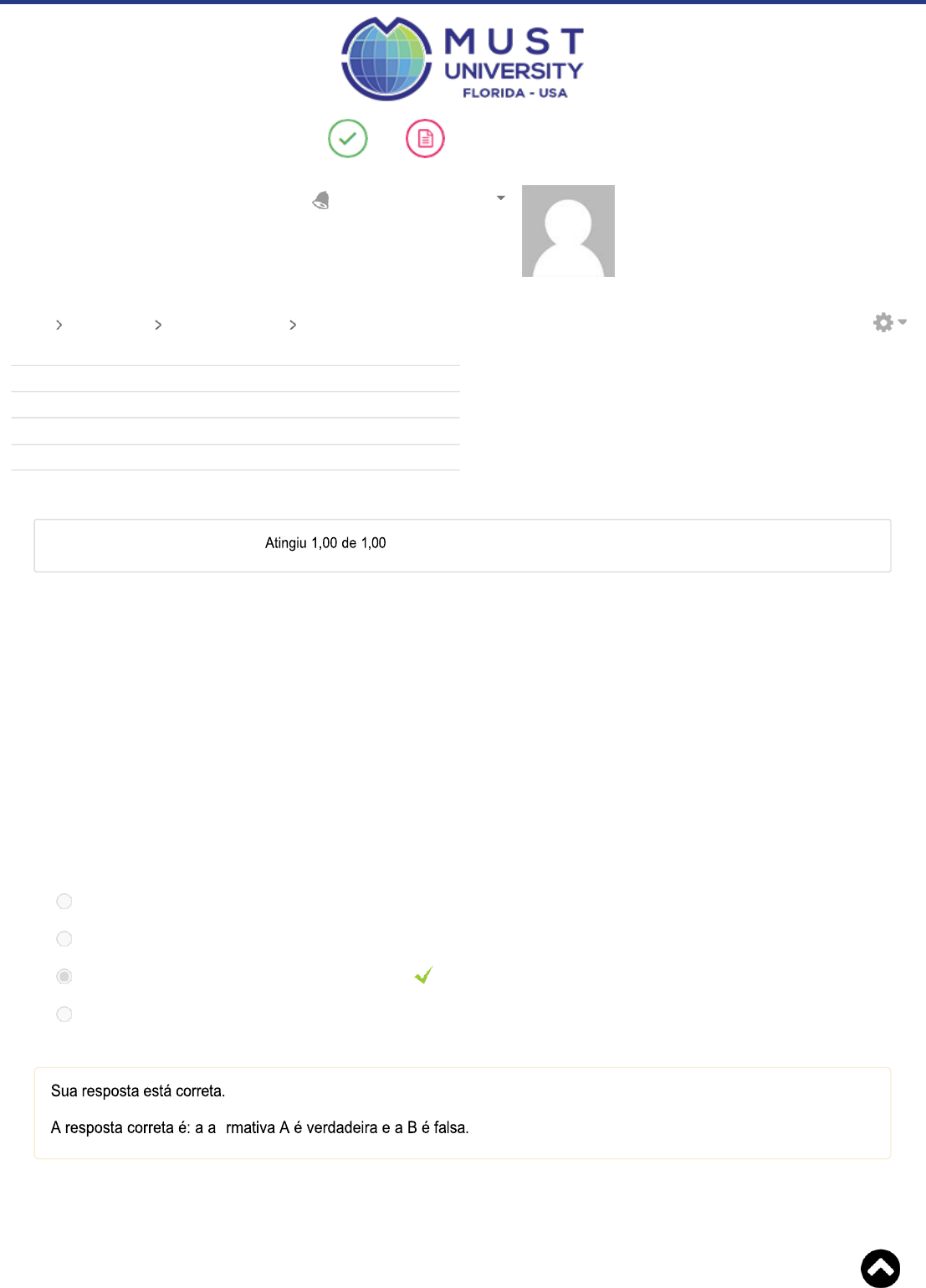 Questão 1 Correto Notas Biblioteca Student ID: Painel Meus cursos EDU660 Tópico 2 Quiz - Semana 3 Iniciado em quarta, 5 jun 2021, 14:17 Estado Finalizada Concluída em quarta, 5 jun 2021, 14:43 Tempo empregado 26 minutos 34 segundos Avaliar 10,00 de um máximo de 10,00(100%) Sobre inteligência articial (IA), são apresentadas a seguir duas afirmativas: A- O signicado de IA está relacionado à capacidade de as máquinas aprenderem a pensar e agir como humanos. B- A inteligência artificial ganhou força muito antes da revolução computacional, quando a máquina era à vapor. Com base na análise das proposições anteriores, pode-se a rmar que: Escolha uma opção: a. a a rmativa A é falsa e a B é verdadeira. b. ambas as afirmativas são falsas. c. a afirmativa A é verdadeira e a B é falsa. Parabéns! Resposta correta d. ambas as afimativas são verdadeiras e a B complementa o que se a rma em A. https://my.mustedu.com/custom/minhas_notas.php https://my.mustedu.com/custom/minhas_notas.php https://my.mustedu.com/my/ https://my.mustedu.com/my/ https://my.mustedu.com/my/ https://my.mustedu.com/my/ https://my.mustedu.com/ https://my.mustedu.com/user/view.php?id=8658&course=1189 Questão 2 Correto Atingiu 1,00 de 1,00 Sobre a Educação 5.0, avalie as duas proposições seguintes: A. É uma educação alinhada às demandas da 3ª Revolução Industrial e Digital. B. Surgiu da necessidade de atender às demandas educacionais das antigas gerações a partir da exclusividade do ensino híbrido. Com base na análise das proposições, pode-se a rmar que: Escolha uma opção: a. ambas as a rmativas são falsas. Parabéns! Resposta correta b. ambas as a rmativas são verdadeiras. c. a a rmativa A é verdadeira e a B é falsa. d. A a rmativa A é falsa e a B é verdadeira. Questão 3 Correto Atingiu 1,00 de 1,00 Big Data é o termo em Tecnologia da Informação (TI) que trata sobre grandes conjuntos de dados que precisam ser processados e armazenados, o conceito do Big Data se iniciou com 3 Vs: Velocidade, Volume e Variedade. Acerca do Big data avalie as a rmativas: I- O big data serve tão somente aos negócios e ao mercado empresarial pois trabalha com a obtenção de informações sobre clientes e consumidores em potencial. II- O big data é um ferramenta tecnológica de exclusividade educacional, sendo aplicada tão somente em escolas, faculdades e universidades. III- As técnicas de big data estão conquistando espaço na educação, em que suas possibilidades de uso podem ser variadas. Elas podem ser aplicadas tanto para tornar a gestão de uma escola mais e caz como para melhorar o desempenho dos alunos. É correto o que se a rma: Escolha uma opção: a. apenas no item III. Parabéns! Resposta correta b. apenas nos itens II e III. c. apenas no item II. d. nos itens I, II e III. Questão 4 Correto Atingiu 1,00 de 1,00 Sua resposta está correta. Sobre as técnicas de big data que podem ser utilizadas para análise de aprendizagem, classi que as a rmações seguintes em verdadeiras (V) ou falsas (F): I- Ao analisar o comportamento do aluno, o risco de abandono dos cursos pode ser detectado e medidas podem ser implementadas no início do curso para manter os estudantes até o nal de sua formação. II- Novos cursos podem ser recomendados aos alunos com base nos seus interesses identi cados através da análise de suas atividades. III- Não é possível detectar os comportamentos de estudantes a partir do uso do big data. Assinale a seguir a alternativa que apresenta a sequência correta de classi cação, de cima para baixo: Escolha uma opção: a. F; V; V. b. V; V; F. Parabéns! Resposta correta c. F; F; F. d. V; F; V. Questão 5 Correto Atingiu 1,00 de 1,00 A resposta correta é: IV Questão 6 Correto A Educação 5.0 tem características próprias. Pensando nisso identi que em qual item não há uma dessas características: I. Aprendizagem personalizada II. Aprendizagem entre pares III. Docentes enquanto mentores IV. Estudos focados nas fronteiras nacionais Com base no exposto, pode-se a rmar que: Escolha uma opção: a. I b. II c. III d. IV Parabéns! Resposta correta Sobre a inteligência arti cial observe as lacunas e em seguida encontre a alternativa que contém as informações corretas que as preenche: “O estudo e desenvolvimento das pesquisas em IA tiveram início na _____________________ , quando se reuniram cientistas de diversas áreas, incluindo _____________ , engenharia, matemática e computação para tratar sobre a criação de um cérebro arti cial.” Acerca dessas asserções, assinale a alternativa correta: Escolha uma opção: a. Segunda Guerra Mundial, neurociência Parabéns! Resposta correta b. Segunda Guerra Mundial, contabilidade c. Primeira Guerra Mundial. física d. Primeira Guerra Mundial, química Questão 7 Correto Atingiu 1,00 de 1,00 Questão 8 Correto A educação alinhada às demandas da 4ª Revolução Industrial fez-se necessária, em momento oportuno. Pensando, são características da educação 4.0, EXCETO: Escolha uma opção: a. as máquinas inteligentes, automações e sistemas robotizados. b. as novas mídias e Big Data. c. a utilização de mídias como rádio e projetores de slides. Parabéns! Resposta correta d. a conectividade global e a facilidade de acesso ao conhecimento. Ferramentas de tutoria inteligente incorporada à ciência da inteligência arti cial têm sido desenvolvidas com o objetivo principal de: Escolha uma opção: a. proporcionar um aprendizado tradicional, porém inovador. b. melhorar o desempenho dos estudantes. Parabéns! Resposta correta c. facilitar o trabalho desenvolvido pelo professor. d. aprimorar as ferramentas das plataformas o line e on line. Questão 9 Correto Atingiu 1,00 de 1,00 Questão 10 Avalie as a rmações a seguir sobre computação cognitiva e aprendizado de máquina: I. Machine learning surgiu do reconhecimento de padrões e da teoria de que máquinas podem aprender sem serem programadas para rea