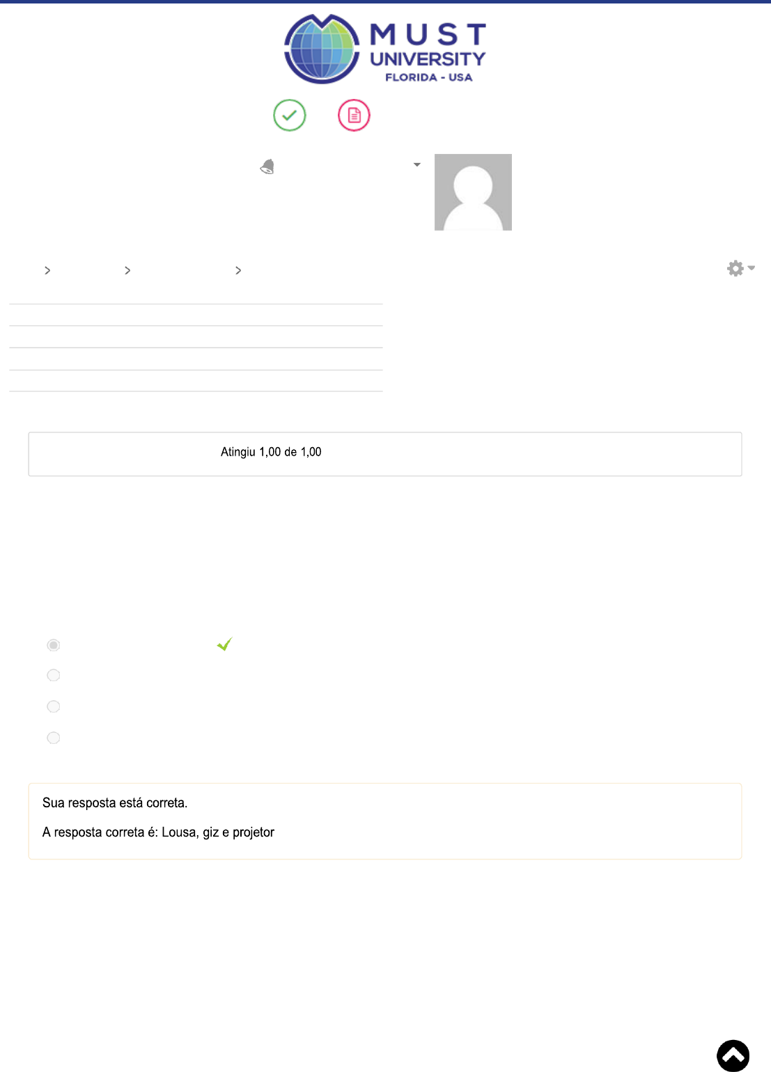 Questão 1 Correto Notas Biblioteca Student ID: Painel Meus cursos EDU660 Tópico 2 Quiz - Semana 4 Iniciado em sábado, 8 jun 2024, 16:30 Estado Finalizada Concluída em sábado, 8 jun 2024, 17:03 Tempo empregado 33 minutos 43 segundos Avaliar 10,00 de um máximo de 10,00(100%) As plataformas adaptativas são desenvolvidas com uma tecnologia de inteligência computacional que, além de sugerir ao aluno a forma como ele tende a aprender melhor, possibilita o avanço ou não para o aprendizado de outros conteúdos, tendo em vista o seu progresso. Pensando nisso assinale uma alternativa que NÃO traz uma das tecnologias empregadas nas plataformas adaptativas Escolha uma opção: a. Lousa, giz e projetor Parabéns! Resposta correta b. Inteligência arti cial. c. Computação cognitiva. d. Big data. https://my.mustedu.com/custom/minhas_notas.php https://my.mustedu.com/custom/minhas_notas.php https://my.mustedu.com/my/ https://my.mustedu.com/my/ https://my.mustedu.com/my/ https://my.mustedu.com/my/ https://my.mustedu.com/ https://my.mustedu.com/user/view.php?id=8658&course=1189 Questão 2 Correto Atingiu 1,00 de 1,00 Com relação às vantagens da aprendizagem adaptativa para o professor, avalie as duas a rmações a seguir: A. Propicia muitas informações úteis e completas: o professor recebe dados de interesse em tempo real. Não apenas os resultados das atividades que o aluno realiza, mas também dados de seu desempenho, o tempo que leva para realizar cada atividade, os aspectos que melhor domina e os pontos de maior di culdade. Tudo de forma automática e acessível a qualquer momento, de qualquer dispositivo. B. Facilita a organização e a programação das aulas de forma personalizada: o sistema oferece sugestões especí cas para o professor e permite que se organize a aprendizagem de diversas maneiras, focando nas necessidades-chave de cada aluno. As plataformas que trabalham com informações em tempo real permitem modi car a aula a qualquer momento, adaptar as lições, controlar para que ninguém perca o ritmo e atender aos que demonstram di culdades, assim como aos que avançam mais rápido que a média. Com base na análise das duas a rmativas, pode-se a rmar que: Escolha uma opção: a. Ambas as a rmativas são verdadeiras, pois correspondem às vantagens para o professor. Parabéns! Resposta correta b. A a rmativa A é falsa, pois é uma vantagem para o aluno e a B é verdadeira, pois é uma vantagem para o professor. c. Ambas as a rmativas são falsas, pois não correspondem às vantagens para o professor. d. A a rmativa A é verdadeira, pois é uma vantagem para o professor e a B é falsa, pois é uma vantagem para o aluno. Questão 3 Correto Atingiu 1,00 de 1,00 o desempenho do grupo e do professor precisará seguir para atingir metas em conjunto com outros alunos. Questão 4 Correto Sabendo que plataformas adaptativas são plataformas inteligentes que respondem em tempo real às necessidades e ao ritmo de cada aluno, otimizando o aprendizado, qual alternativa não aponta para características dessas plataformas? Escolha uma opção: a. Usam algoritmos que interpretam as respostas e reações do aluno, assimilando seu modo de aprender, suas facilidades e di culdades. b. Sempre que o aluno interage na plataforma de alguma maneira, o sistema analisa todos os dados dessa interação. c. O tutor do curso consegue acompanhar o desempenho do aluno na plataforma. d. Oferecem um conjunto de mecânicas e tarefas operacionais que o estudante, de acordo com o desempenho do grupo e do professor precisará seguir para atingir metas em conjunto com outros alunos. Parabéns! Resposta correta A plataforma Brights bytes tem o objetivo de ajudar escolas, gestores educacionais e o governo a melhorar a aprendizagem a partir da análise detalhada de informações educacionais. Sua missão foi resolver os seguintes problemas, EXCETO: Escolha uma opção: a. A di culdade dos educadores em escolher ferramentas capazes de garantir o desenvolvimento dos alunos. b. A ausência de apoio dos pais na educação dos lhos e de auxílio em suas di culdades. Parabéns! Resposta correta c. A falta de dados detalhados dos alunos para gestores proporem mudanças educacionais. d. As defasagens de aprendizagens dos alunos. Questão 5 Correto Atingiu 1,00 de 1,00 Questão 6 Correto A plataforma Brights, idealizada pelo educador Rob Mancabelli e pelo pro ssional da área de tecnologia Hisham Anwar, favorece qual metodologia? Escolha uma opção: a. Metodologia individual de estudo isolado b. Metodologia adaptativa. Parabéns! Resposta correta c. Metodologia colaborativa pear person. d. Metodologia projetada em estudos de casos. A aprendizagem adaptativa é uma metodologia de ensino que busca entender as necessidades de cada aluno e se molda para atender a cada um. A metodologia de aprendizagem adaptativa por meio das mais variadas soluções de plataformas adaptativas para o ensino favorece e promove predominantemente que tipo de ensino? Escolha uma opção: a. Ensino coletivo. b. Ensino tradicional. c. Ensino indiferenciado. d. Ensino personalizado. Parabéns! Resposta correta Questão 7 Correto Atingiu 1,00 de 1,00 Questão 8 Correto Identi que qual alternativa a seguir contém o principal problema identi cado nas escolas pela organização Summit Public Schools: Escolha uma opção: a. Investimentos públicos su cientes para atender com qualidade as necessidades educacionais. b. As aulas centradas no professor deixavam lacunas no aprendizado dos estudantes. Parabéns! Resposta correta. c. Currículo rasos e conteúdos desconectados da realidade d. Altas taxas de evasão e repetência. Complete as lacunas adequadamente: A _______________ signi ca que a instrução é adaptada às ___________ de aprendizagem de diferentes alunos. Os objetivos de aprendizagem são os mesmos para todos os alunos, mas o método ou abordagem de instrução varia de acordo com cada aluno ou o que a pesquisa descobriu que funciona me