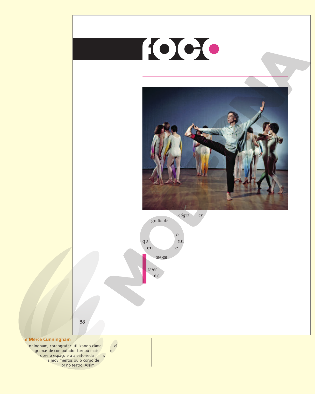 88 O dançarino e coreógrafo Merce Cunningham acreditava que o ser humano tem a propensão de organizar seus movi- mentos sempre de uma mesma maneira. Lembre-se de você escovando os seus dentes. Quando tiver uma oportunidade, experimente escová-los com a outra mão e fique atento ao que acontece. Ao fazer isso, repare se o hábito o levou a criar padrões de movimento com os quais você se acostumou. Em seguida, anote suas impressões em seu diário de bordo para compartilhá-las posteriormente com os colegas e com o professor. Cunningham estava disposto a perturbar e a mudar esses padrões de movimento e seus interesses o levaram a criar um modo peculiar de coreografar. Quatro eventos em sua vida o levaram a definir seus parâmetros de atuação. 1 O dançarino e coreógrafo Merce Cunningham nos Estados Unidos. Fotografia de 1975. Merce Cunningham em... JA C K M IT C H EL L/ G ET TY IM A G ES 88 R ep ro du çã o pr oi bi da . A rt. 1 84 d o C ód ig o P en al e L ei 9 .6 10 d e 19 d e fe ve re iro d e 19 98 . Nesta seção são apresentados detalhes e aprofundamentos sobre a trajetória do coreógrafo Merce Cunningham. Unidades temáticas da BNCC: Dança; Artes integradas. Objetos de conhecimento: Contextos e práticas; Elemen- tos da linguagem, Processos de criação; Arte e tecnologia. Habilidades em foco nesta seção: (EF69AR09) Pesquisar e analisar diferentes formas de expressão, representação e encenação da dança, reconhecendo e apre- ciando composições de dança de artistas e grupos brasileiros e estrangeiros de diferentes épocas. (EF69AR10) Explorar elementos constitutivos do movimento co- tidiano e do movimento dança- do, abordando, criticamente, o desenvolvimento das formas da dança em sua história tradicio- nal e contemporânea. (EF69AR14) Analisar e experi- mentar diferentes elementos (figurino, iluminação, cenário, trilha sonora etc.) e espaços (convencionais e não conven- cionais) para composição cênica e apresentação coreográfica. (EF69AR35) Identificar e mani- pular diferentes tecnologias e recursos digitais para acessar, apreciar, produzir, registrar e compartilhar práticas e repertó- rios artísticos, de modo reflexi- vo, ético e responsável. Sobre Merce Cunningham Para Cunningham, coreografar utilizando câmeras de vídeo e, posterior- mente, programas de computador tornou mais complexos e aprofundados seus estudos sobre o espaço e a aleatoriedade. As câmeras permitem am- pliar ou recortar os movimentos ou o corpo de um bailarino de um modo impossível para o espectador no teatro. Assim, novas possibilidades de apre- ciação se apresentam – juntamente com novas possibilidades de criação para o coreógrafo. Com o recurso do programa de computador, as frases de movimento vão ganhar mudanças súbitas de direção e de intensidade, tornando-se mais desafiadoras para os intérpretes. O conteúdo abordado nesta seção contempla a habilidade (EF69AR14) da BNCC. 893o BIMESTRE BEACH Birds for Camera [Pássaros de praia para câmera, em tradução livre]. Direção: Elliot Caplan. Coreografia: Merce Cunningham. Estados Unidos, 1993. Fotograma. Reflita sobre as seguintes questões e compartilhe suas respostas com os colegas e com o professor. 1 Você consegue identificar quais são os padrões de movimento que executa no seu dia a dia? 2 Como você poderia modificar as dinâmicas e os jeitos de realizar as tarefas em que identifica esses padrões? Escreva sobre a sua experiência em seu diário de bordo e converse com os colegas a respeito. • Para assistir à videodança Beach Birds for Camera acesse o site abaixo (em inglês). Disponível em: <https://dancecapsules. mercecunningham. org/overview. cfm?capid=46030>. Acesso em: 5 jan. 2018. O primeiro aconteceu nos anos 1940, quando propôs separar música e dança e passou a estudar o ritmo de seu próprio movimento corporal em vez de seguir o ritmo da música. O segundo evento, na década de 1950, foi quando ele começou a trabalhar com o acaso, o que chamou de chance operation [operação do acaso]. Por meio de sorteios diversos (como cara ou coroa, jogos de dados etc.), ele decidia a ordem das frases de movimento, quantos e quais seriam os bailarinos a dançá-las e a sua distribuição no espaço. O terceiro evento foi um convite para criar uma coreografia para um programa de televisão na década de 1970. Essa oportu- nidade o fez perceber que poderia criar uma dança específica para ser exibida em uma tela, com tempos e espaços diferentes daqueles do palco. Em 1993, continuando os estudos de criação de danças para a tela, Cunningham criou uma coreografia para a videodança Beach Birds for Camera [Pássaros de praia para câmera, em tradução li- vre], dirigida por Elliot Caplan. Observe a imagem acima e note que só é possível ver perspectiva e o recorte do corpo do bailarino em primeiro plano porque foram captados por uma câmera. Se assistisse a essa dança em um teatro, quais outros pontos de vista você poderia ter? O quarto e último evento foi a possibilidade de usar um pro- grama de computador para captar os movimentos dos bailari- nos e criar combinações desafiadoras, como você viu na peça BIPED, apresentada no Sobrevoo. Merce Cunningham se tornou uma referência para os artis- tas da dança a partir da segunda metade do século XX devido à prática corporal que criou e à pesquisa que desenvolveu para coreografar seus trabalhos. 2 M E R C E C U N N IN G H A M T R U S T 89 R ep ro du çã o pr oi bi da . A rt. 1 84 d o C ód ig o P en al e L ei 9 .6 10 d e 19 d e fe ve re iro d e 19 98 . Sugestões para o professor Merce Cunningham criou uma ponte en- tre os artistas da dança moderna e pós- -moderna do século XX. Para visualizar essa ponte, sugerimos que você procure na internet por registros das danças: Frontier (1935) e Lamentation (1930), de Martha Graham, Roof piece (1971) e Walking on the wall (1971), de Trisha Brown (1936-2017), e Trio A (1978), de Y